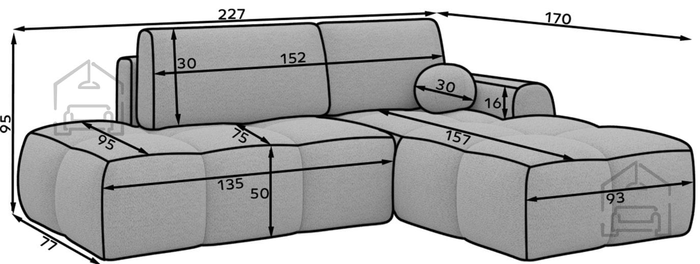 Model Vittario meri 227x170x95 cm in je primeren za postavitev v srednje velike ali večje dnevne prostore. Zaradi svoje oblike v obliki črke L omogoča optimalno izrabo prostora, hkrati pa nudi dovolj sedišč za družino ali goste. Postavitev garniture ustreza fotografiji – desna stran (r), kar pomeni, da je ležalnik na desni, ko sedite na kavču.