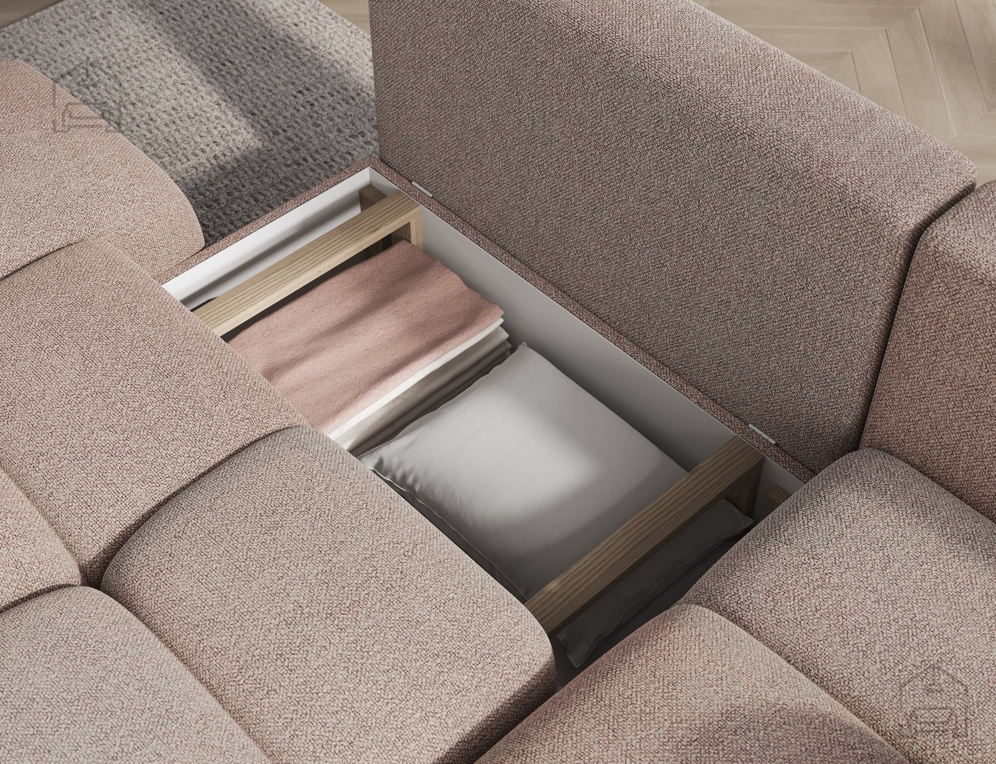 Kotna sedežna garnitura Vittario ima vgrajen mehanizem Euro, ki omogoča hitro in preprosto raztegovanje v ležišče. Površina za spanje meri 205x95 cm, kar zagotavlja dovolj prostora za udoben počitek ene osebe. Pod sediščem se nahaja predal za posteljnino, kamor lahko shranite odeje, blazine ali drugo tekstilno opremo – idealno za urejen in funkcionalen dnevni prostor.