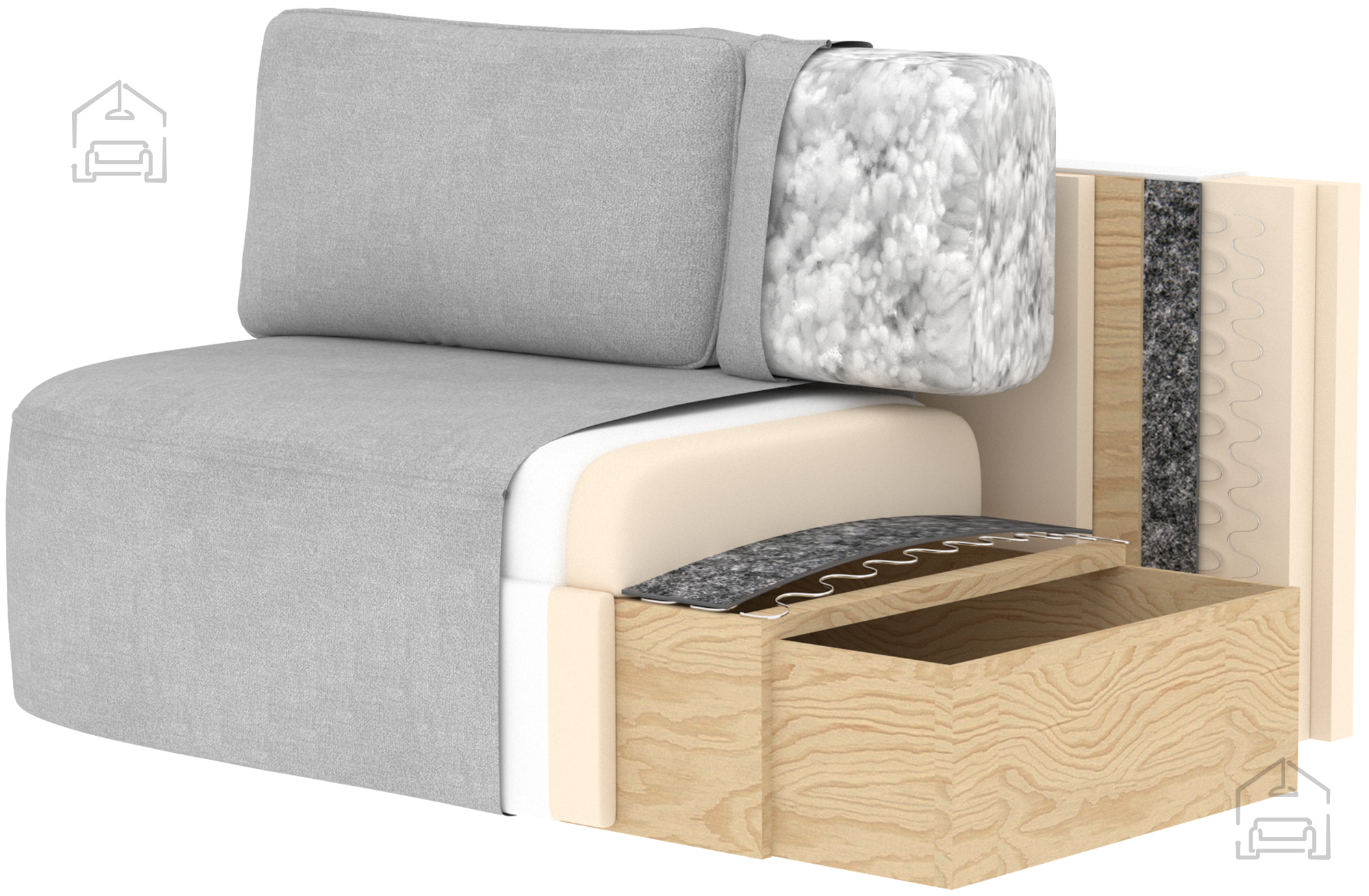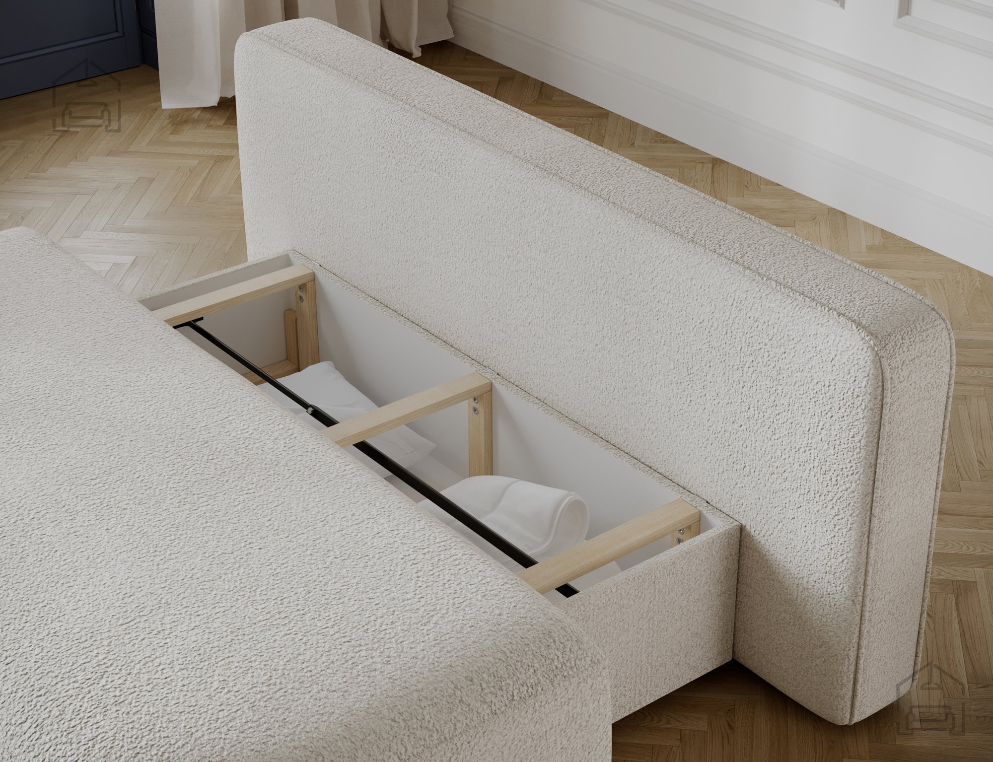 Pod sediščem se nahaja predal za posteljnino, ki je idealen za shranjevanje odej, vzglavnikov ali dodatnih prevlek. Ta detajl povečuje uporabnost dvoseda, saj pomaga ohranjati red v dnevnem prostoru. Pokrov predala se dvigne z lahkoto in omogoča hiter dostop do vsebine. Takšna rešitev je posebej priročna v manjših stanovanjih ali garsonjerah, kjer je vsak centimeter prostora dragocen.