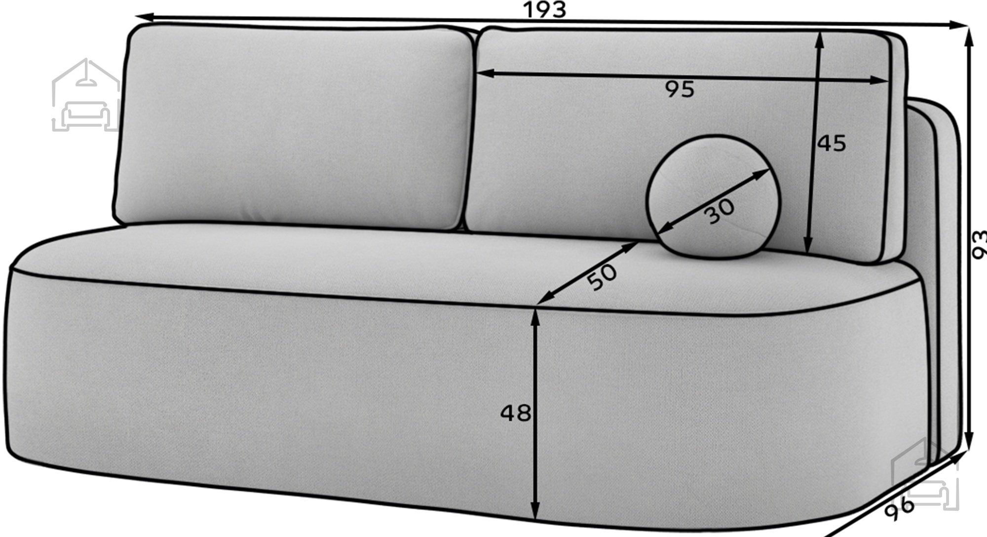 Celotne mere dvoseda znašajo 193x96x93 cm, kar omogoča udobno sedenje za dve osebi, ne da bi zavzel preveč prostora. Višina sedišča 48 cm je prilagojena ergonomskim standardom, zato omogoča naravno držo telesa in enostavno vstajanje. Kombinacija vzmetenja in pene poskrbi, da se oblika sedeža po sedenju hitro povrne v prvotno stanje, kar ohranja estetski videz tudi po daljši uporabi.