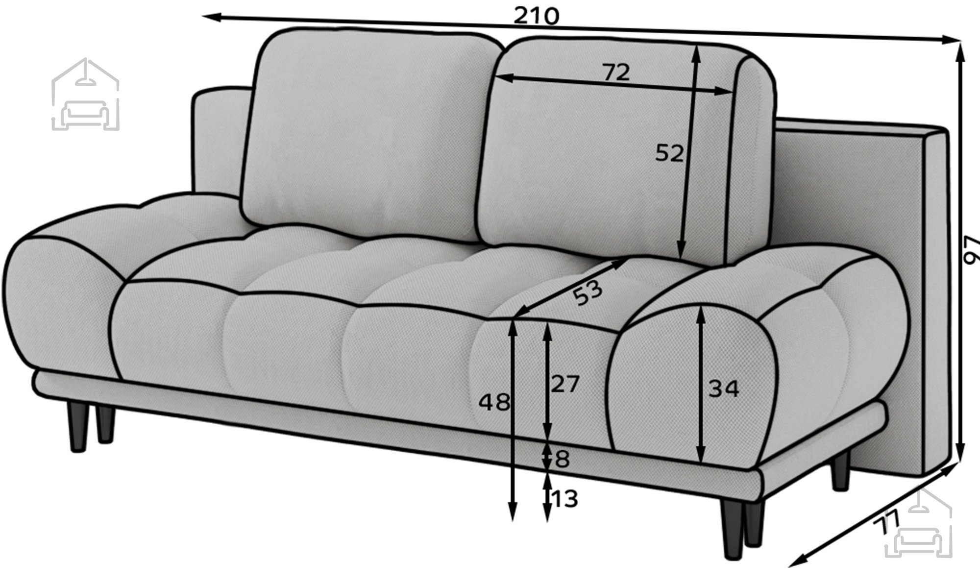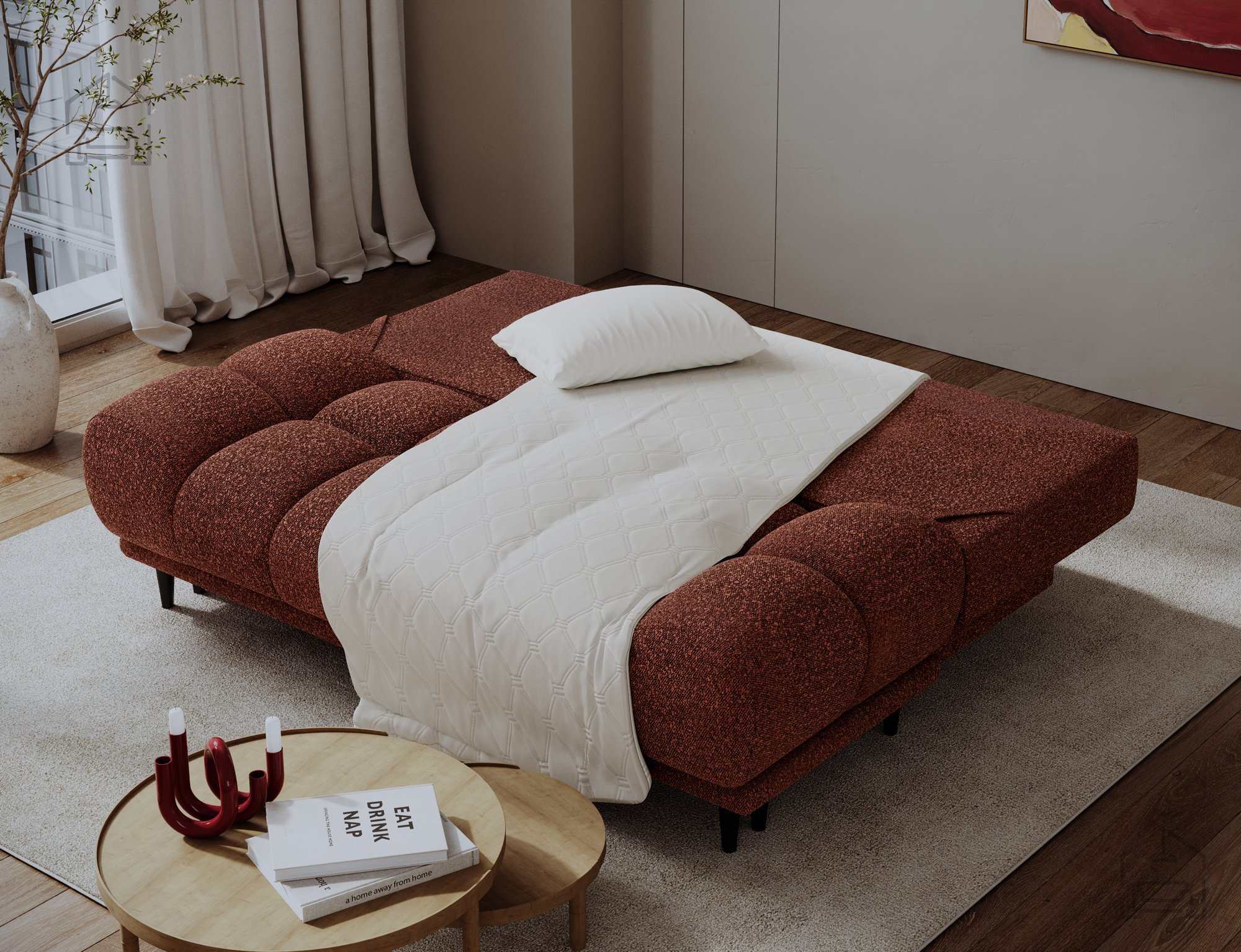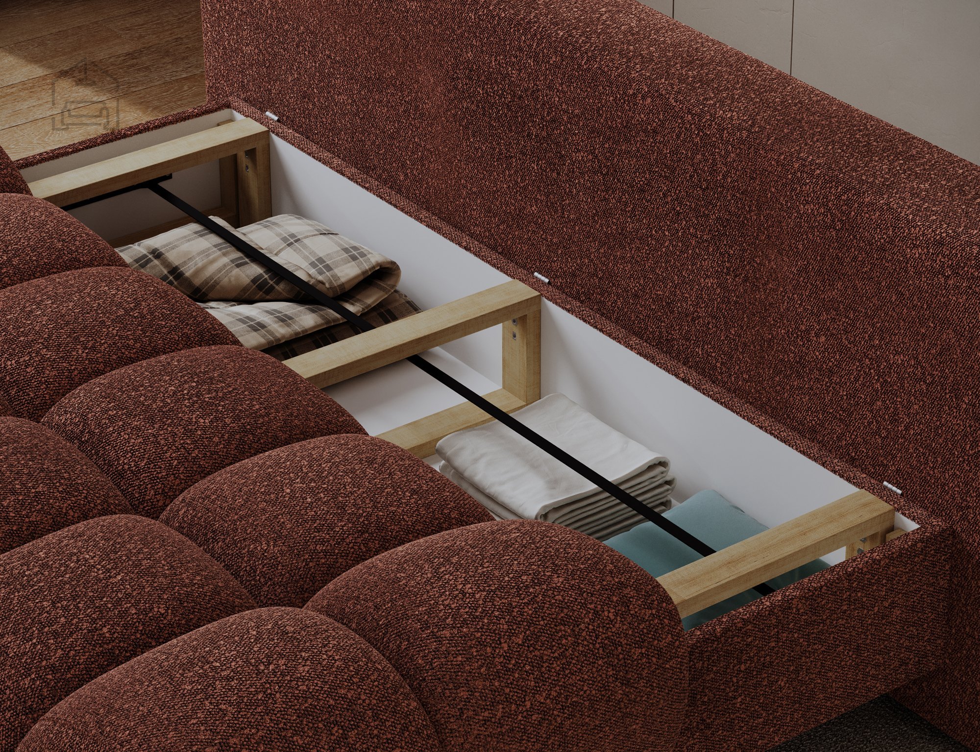 Guavio je dvosed, ustvarjen za dinamična sodobna gospodinjstva, kjer se prostor uporablja večnamensko. V notranjosti se skriva praktičen mehanizem Euro, ki omogoča hitro in enostavno preoblikovanje sedežne površine v udobno ležišče. Ko je raztegnjen, nudi ležalno površino 210x140 cm, kar zadošča za udoben spanec dveh oseb. Dodatni predal za posteljnino pod sediščem omogoča shranjevanje odej, blazin ali posteljnine, kar je izjemno priročno v manjših stanovanjih ali garsonjerah, kjer je vsak centimeter prostora dragocen.