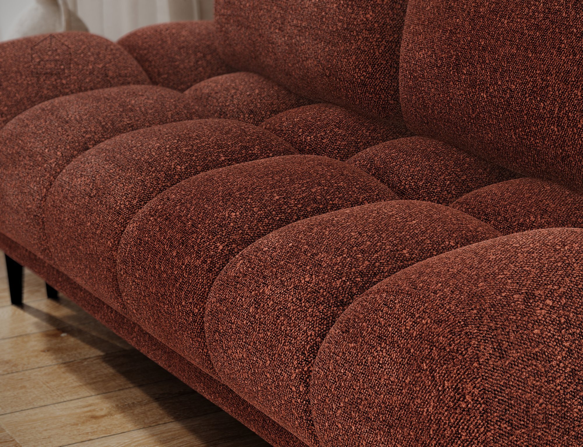Okvir dvoseda je izdelan iz trpežnega lesa, kar zagotavlja stabilnost in dolgo življenjsko dobo. Sedišče je zapolnjeno s kombinacijo valovitih vzmeti tipa B in pene HR 3030, ki skupaj ustvarjata idealno ravnovesje med mehkobo in oporo. Naslon sestavljajo blazine, polnjene z granulatom pene, ki se prilagodi telesu in omogoča sproščeno sedenje tudi ob daljšem počitku. Noge so izdelane iz lesa in obarvane v črno barvo, kar poudari sodobno estetiko in kontrastno dopolni tkanino sedežne garniture.
