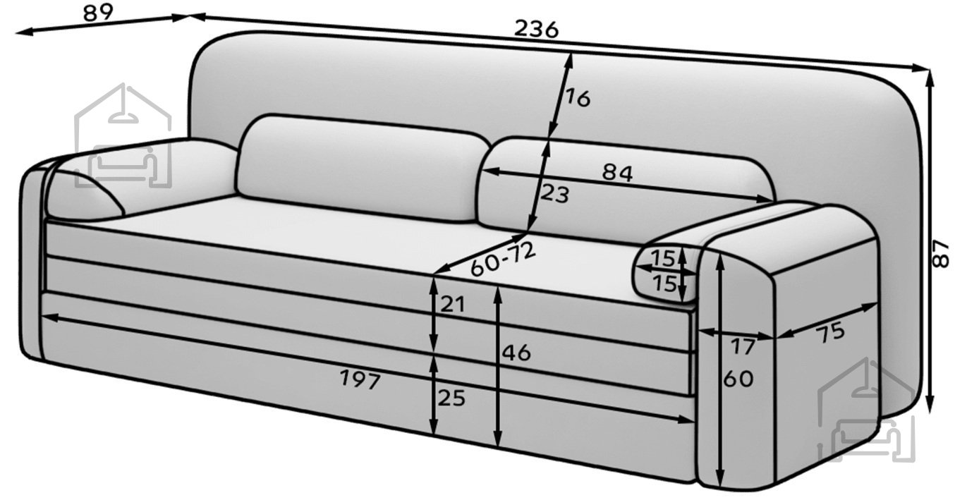 Sedežna širina znaša 198 cm, višina sedišča 46 cm, globina sedišča pa 72 cm. Takšne dimenzije omogočajo prijetno sedenje več osebam hkrati, hkrati pa se trosed zaradi uravnoteženih mer lepo prilega večini dnevnih sob. Okvir iz trdne borovine zagotavlja stabilnost in dolgo življenjsko dobo, črne nogice višine 2,5 cm pa poskrbijo za subtilno vizualno lahkotnost in enostavno čiščenje pod kavčem.