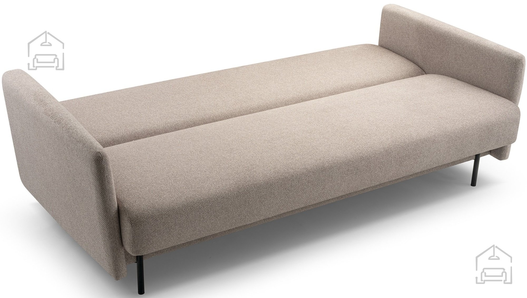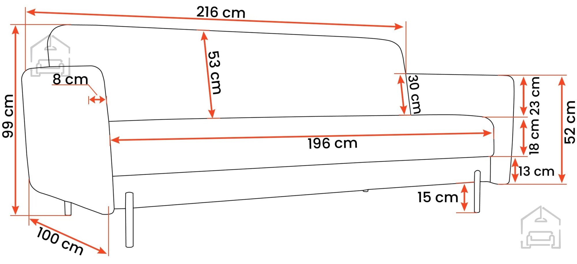 Celotne dimenzije troseda znašajo 216x100x99 cm, kar omogoča dovolj prostora za udobno sedenje treh oseb. Kadar ga razprete, se spremeni v ležišče z dimenzijo 122x196 cm, kar zadostuje za prijetno prenočevanje ene ali dveh oseb. Širina spalnega prostora je 120 cm, zato je trosed Rufi dobra izbira za manjša stanovanja, gostinske sobe ali dnevne prostore, kjer želite imeti dodatno možnost spanja, ne da bi pri tem žrtvovali prostor.