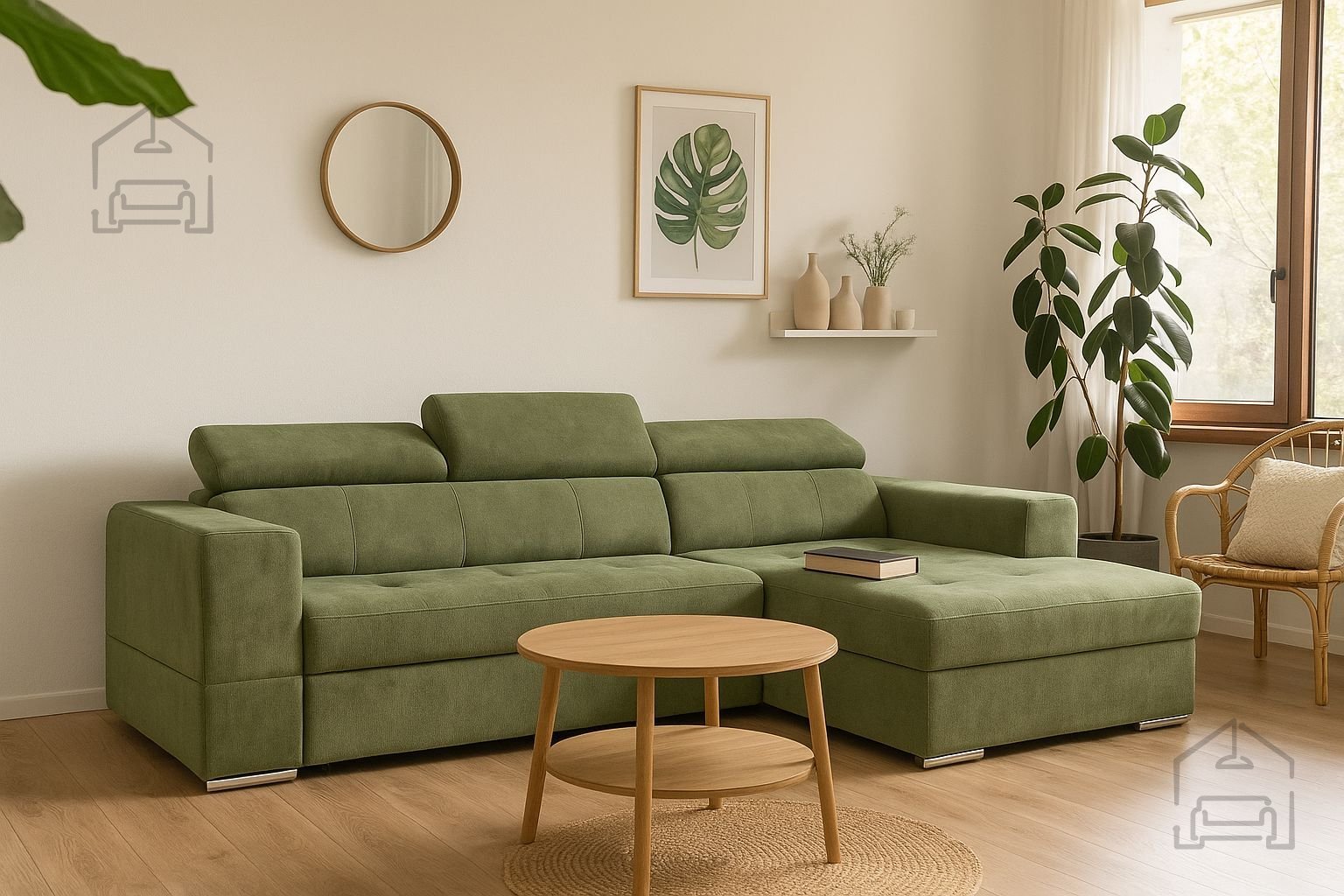 Ena ključnih prednosti garniture je pomožno ležišče velikosti 230x130 cm, ki je namenjeno občasni uporabi. Ležišče se preprosto raztegne in ponuja prijetno površino za počitek ali prenočevanje gostov. Vgrajen pokrit zaboj za shranjevanje pa omogoča, da imate vedno pri roki posteljnino, dodatne odeje, blazine ali druge predmete, ki jih želite pospraviti, a hkrati ohraniti na dosegu roke. Tako garnitura ne nudi le udobja, temveč tudi praktičnost, ki v sodobnih domovih pogosto odloča pri izbiri pohištva.
