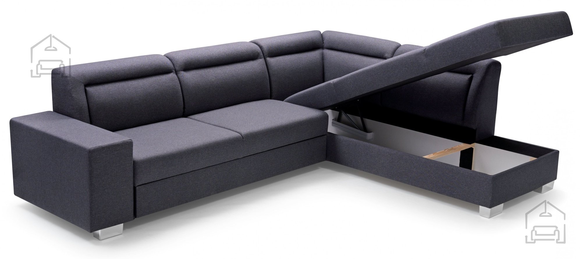 Pod sedežnim delom se nahaja prostoren predal za posteljnino, kamor lahko shranite odeje, blazine ali sezonske prevleke. Tako ostane vaš dnevni prostor urejen, vse potrebno pa imate vedno pri roki. Garnitura je na voljo v več barvnih kombinacijah, zato jo lahko prilagodite slogu notranje opreme – od umirjenih nevtralnih tonov do izrazitejših barvnih poudarkov.