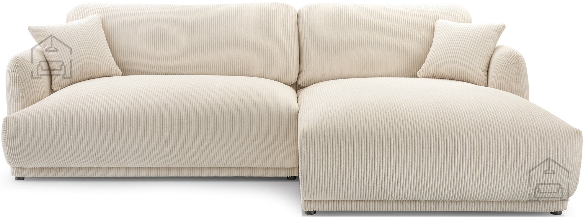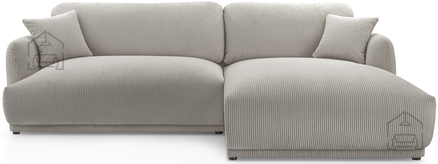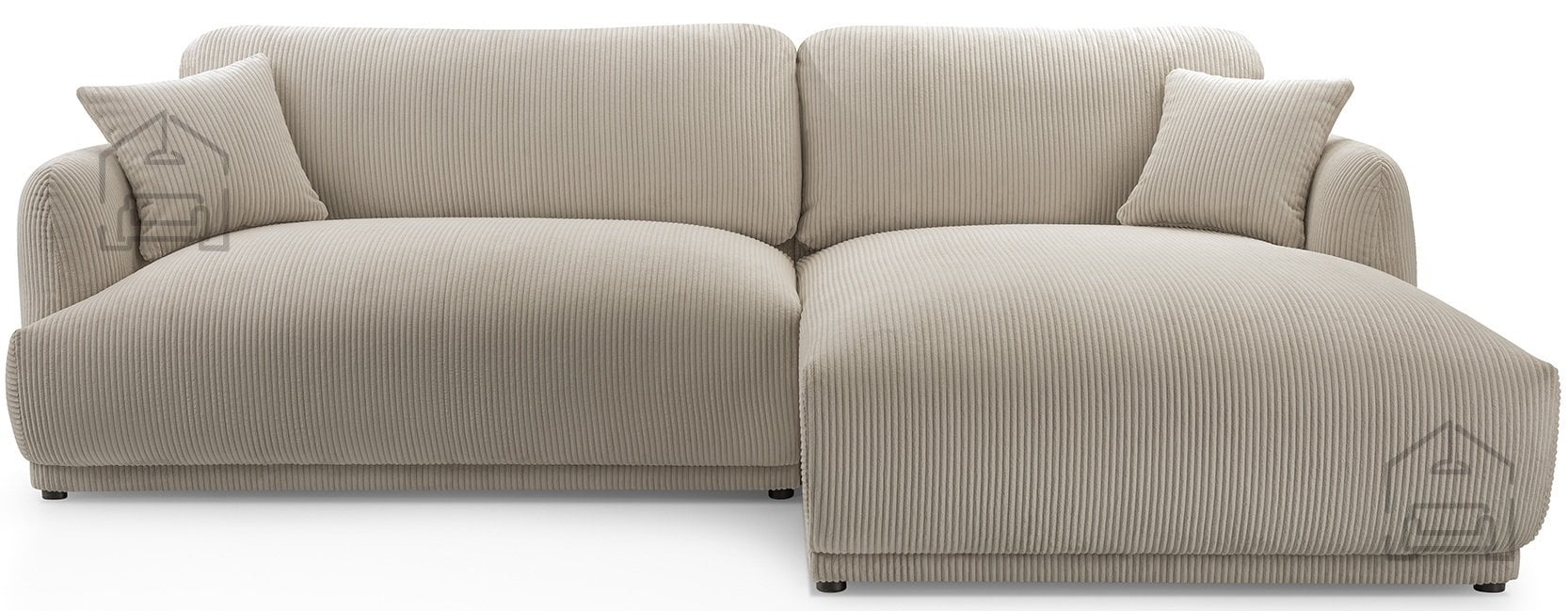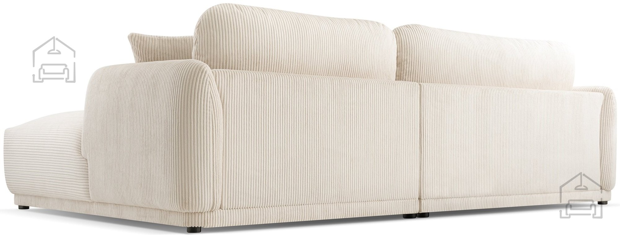 Podnožje garniture sestavljajo črne plastične noge, ki dodajo subtilen kontrast mehki tkanini in obenem omogočajo enostavno čiščenje tal pod garnituro. Takšna izvedba nog je tudi praktična izbira za vsakodnevno rabo, saj se ne poškodujejo ob manjših udarcih in ne zahtevajo posebnega vzdrževanja.