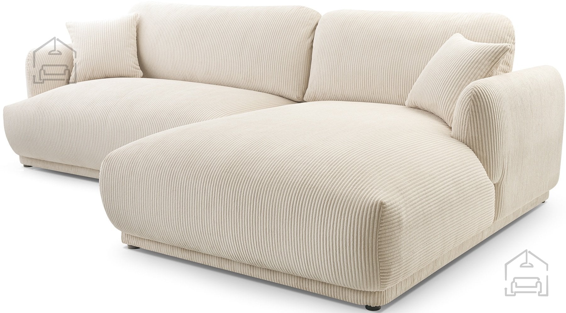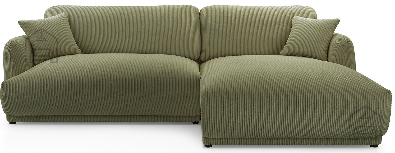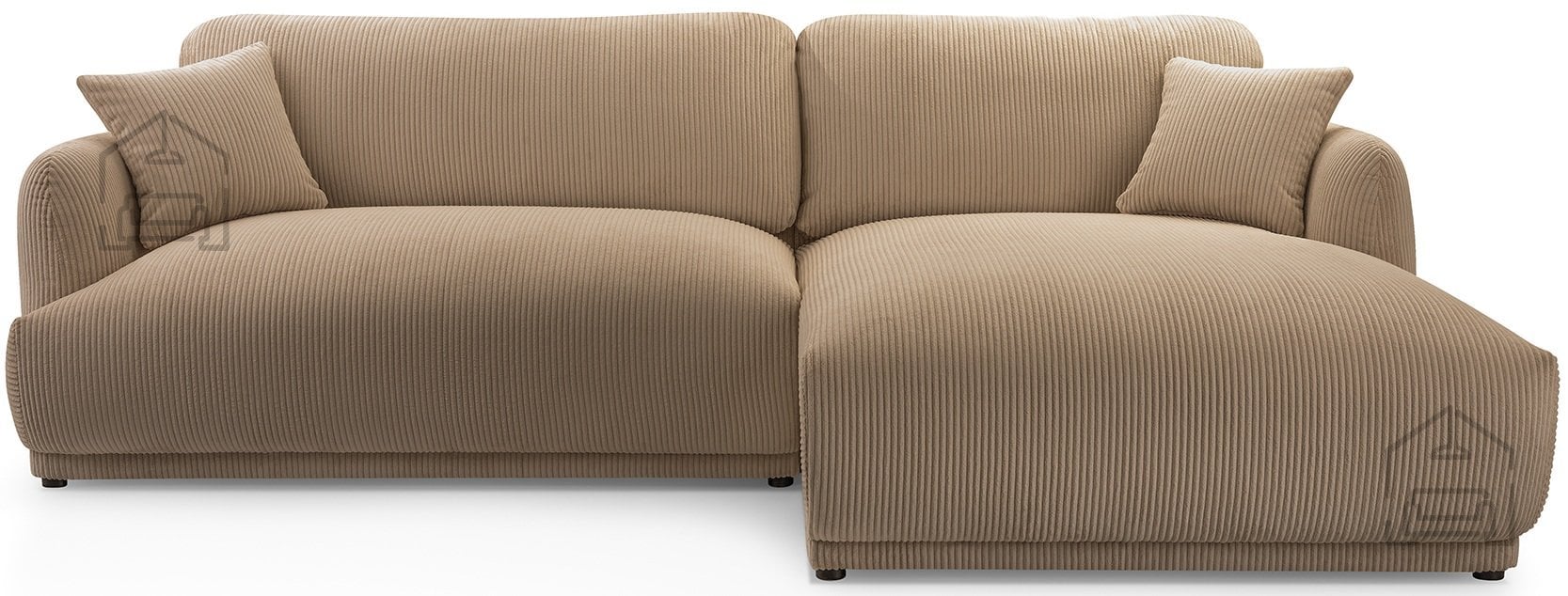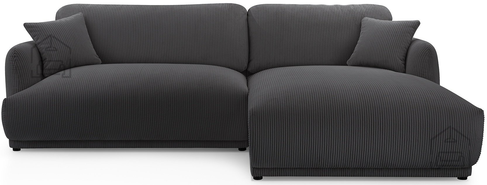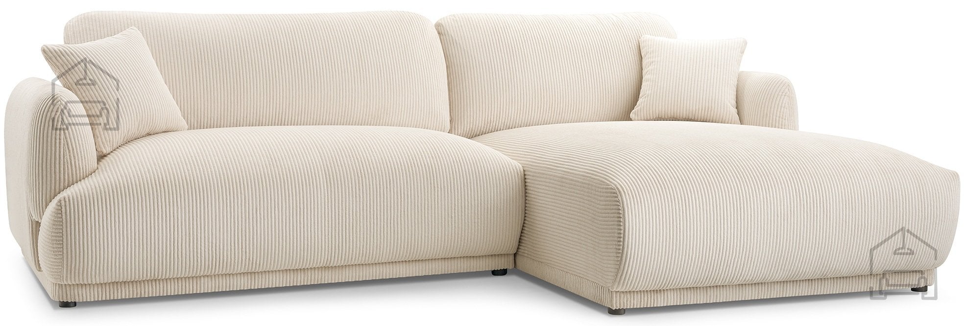Podnožje garniture sestavljajo črne plastične noge, ki dodajo subtilen kontrast mehki tkanini in obenem omogočajo enostavno čiščenje tal pod garnituro. Takšna izvedba nog je tudi praktična izbira za vsakodnevno rabo, saj se ne poškodujejo ob manjših udarcih in ne zahtevajo posebnega vzdrževanja.