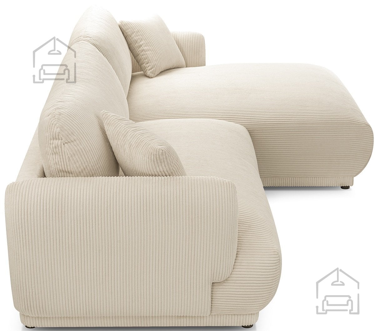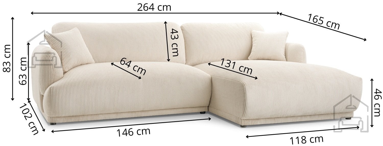 Kotna zasnova omogoča optimalno izrabo prostora – daljša stran (264 cm) ponuja udobno sedenje za več oseb, krajša stran (165 cm) pa ustvari prijeten kotiček za počitek ob branju ali gledanju televizije. Višina naslona 83 cm zagotavlja dobro podporo hrbtu, kar je pomembno pri vsakodnevni uporabi.