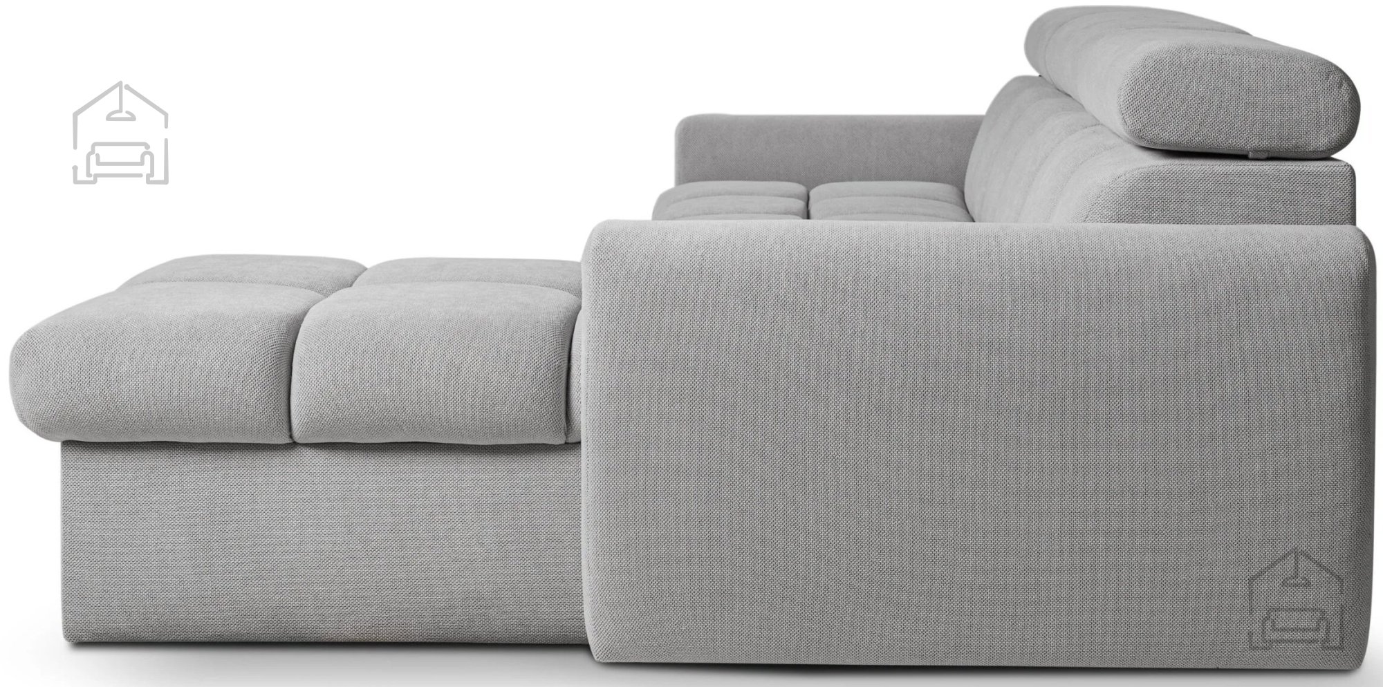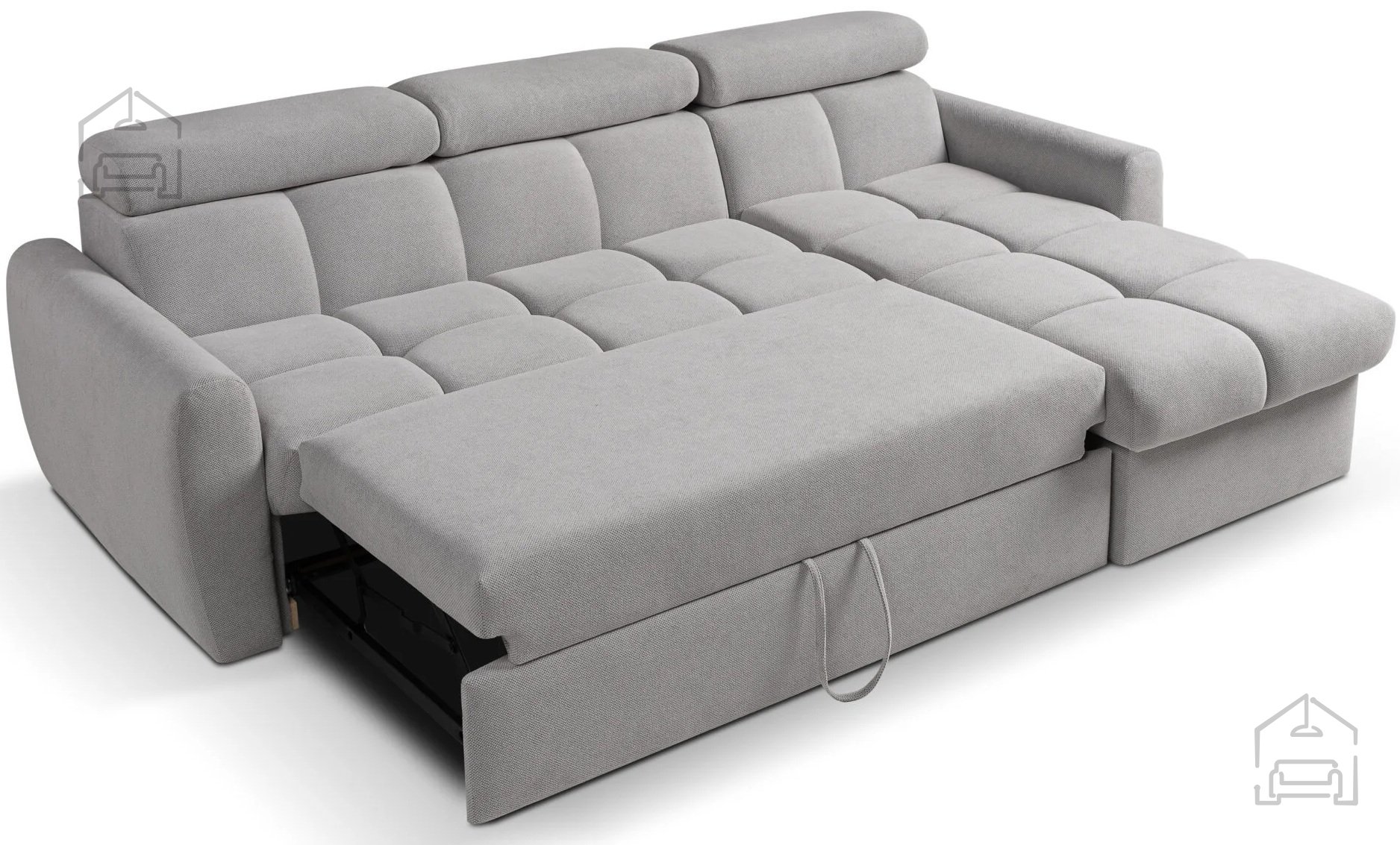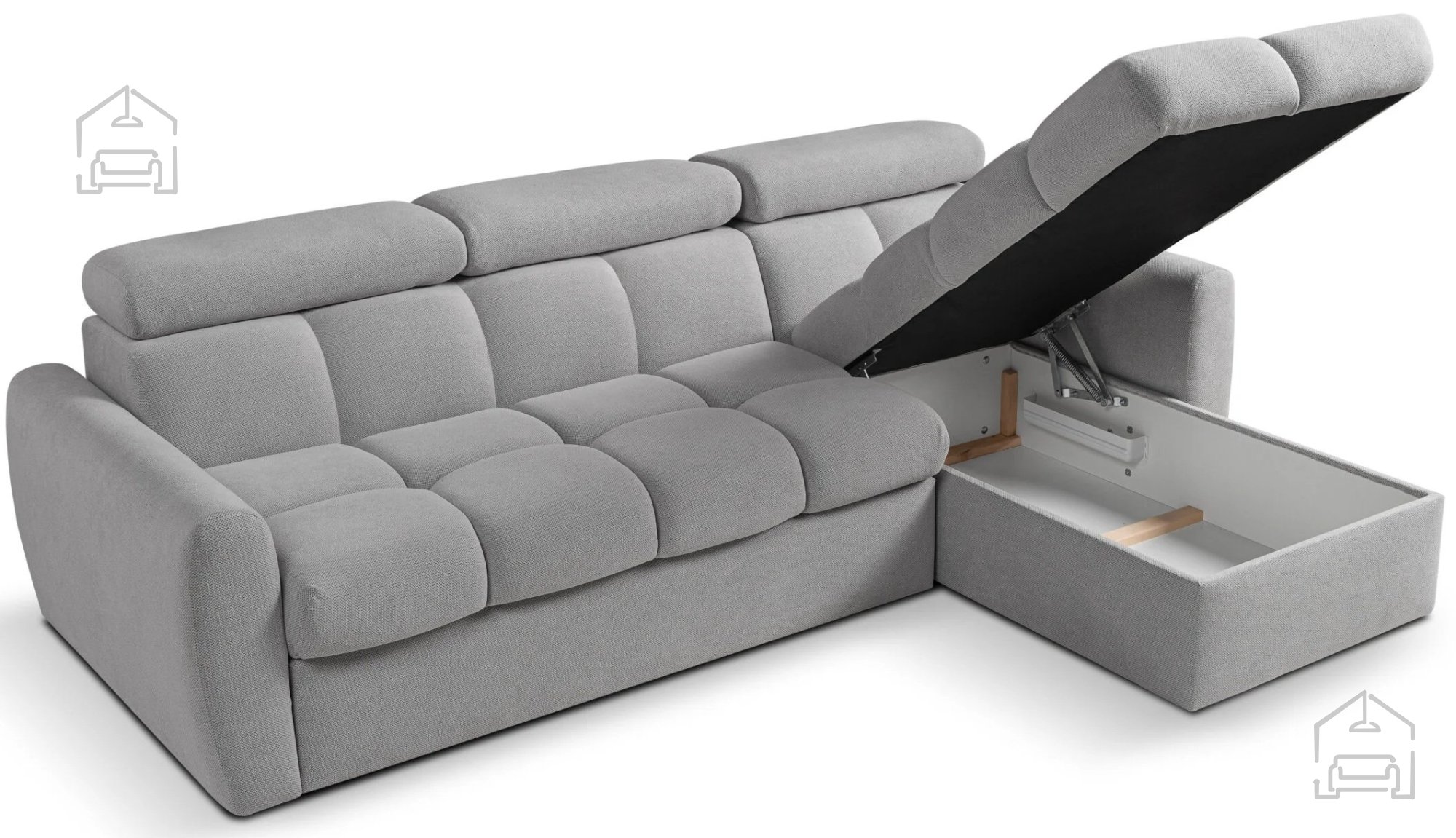 Med dodatnimi funkcijami garniture izstopajo nastavljivi vzglavniki, ki omogočajo individualno prilagoditev višine in naklona za optimalno oporo vratu in glavi. Predal za posteljnino je praktično umeščen pod sedežni del in zagotavlja dodaten prostor za shranjevanje odej, blazin ali posteljnine. Sistem za samodejno pomoč pri razklapljanju olajša uporabo tudi tistim, ki ne želijo vlagati veliko moči pri vsakodnevnem raztezanju.