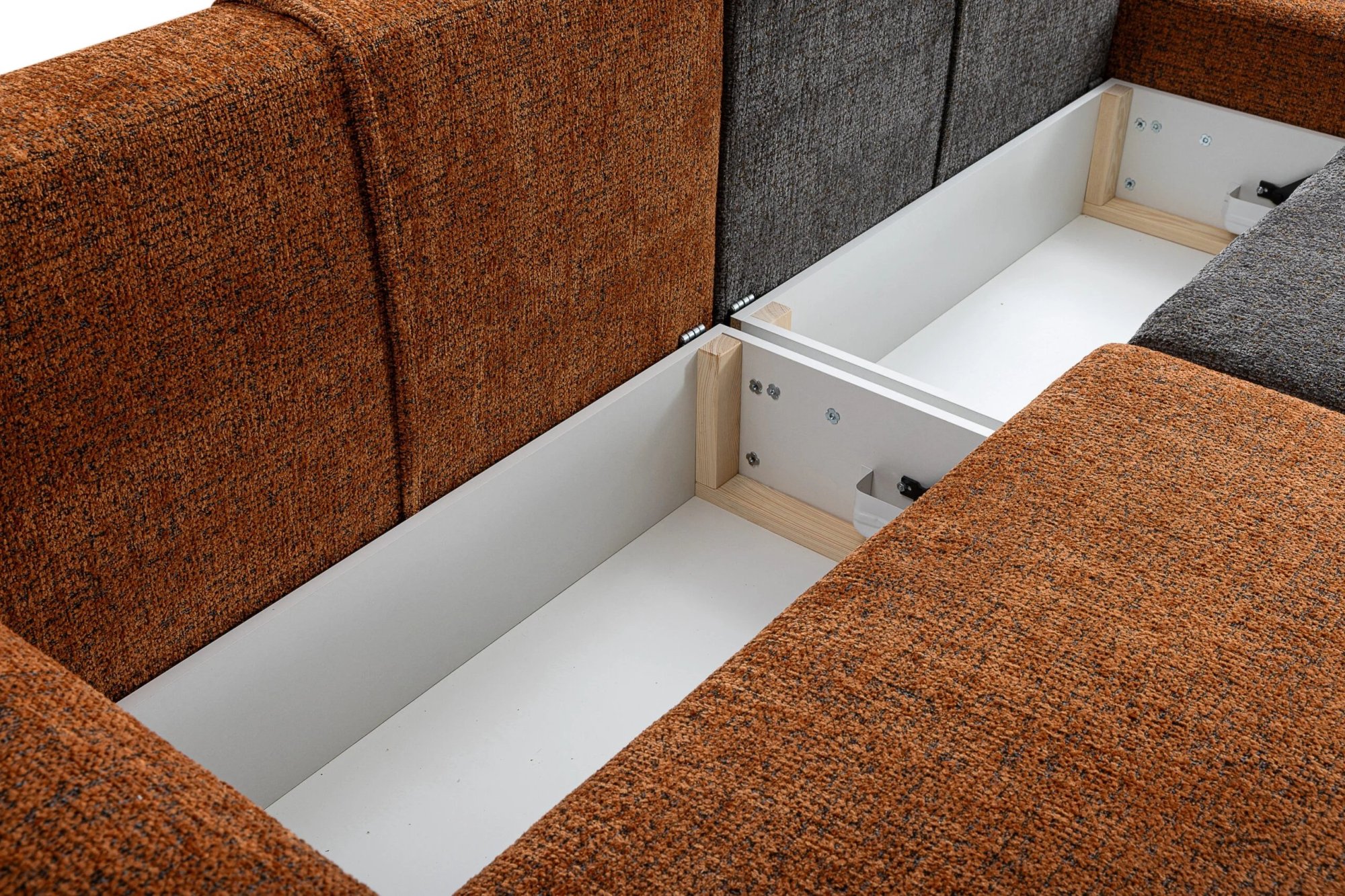 Garnitura Mocca ni le estetski kos pohištva, temveč tudi izjemno praktičen element bivalnega prostora. Zahvaljujoč mehanizmu Euro je raztegovanje enostavno in hitro, brez dodatnega napora. Funkcija pomoči pri samodejnem razklapljanju omogoča, da se garnitura spremeni v ležišče z minimalnim naporom, kar je idealno za vsakodnevno uporabo ali občasne goste. Spalna funkcija razširi uporabnost garniture, saj se v nekaj trenutkih prelevi v udobno posteljo. Vgrajena posoda za posteljnino zagotavlja praktičen prostor za shranjevanje odej, blazin ali posteljnine, s čimer prihranite dragocen prostor v stanovanju.