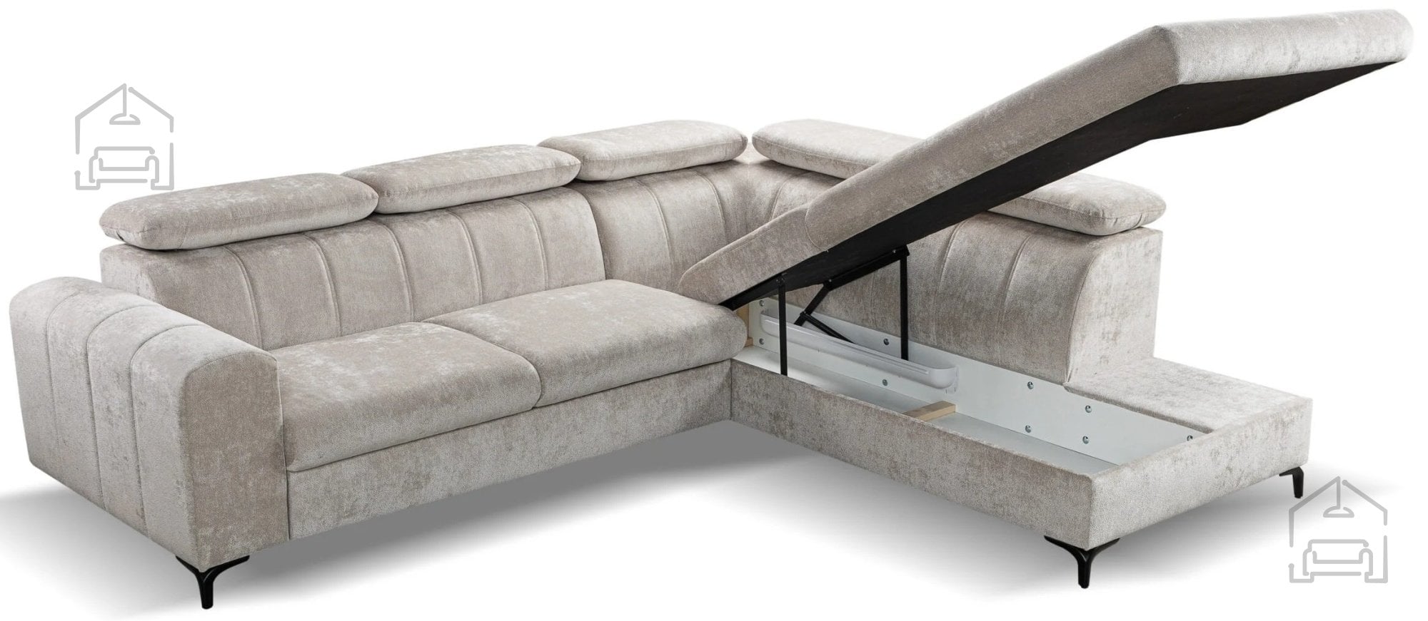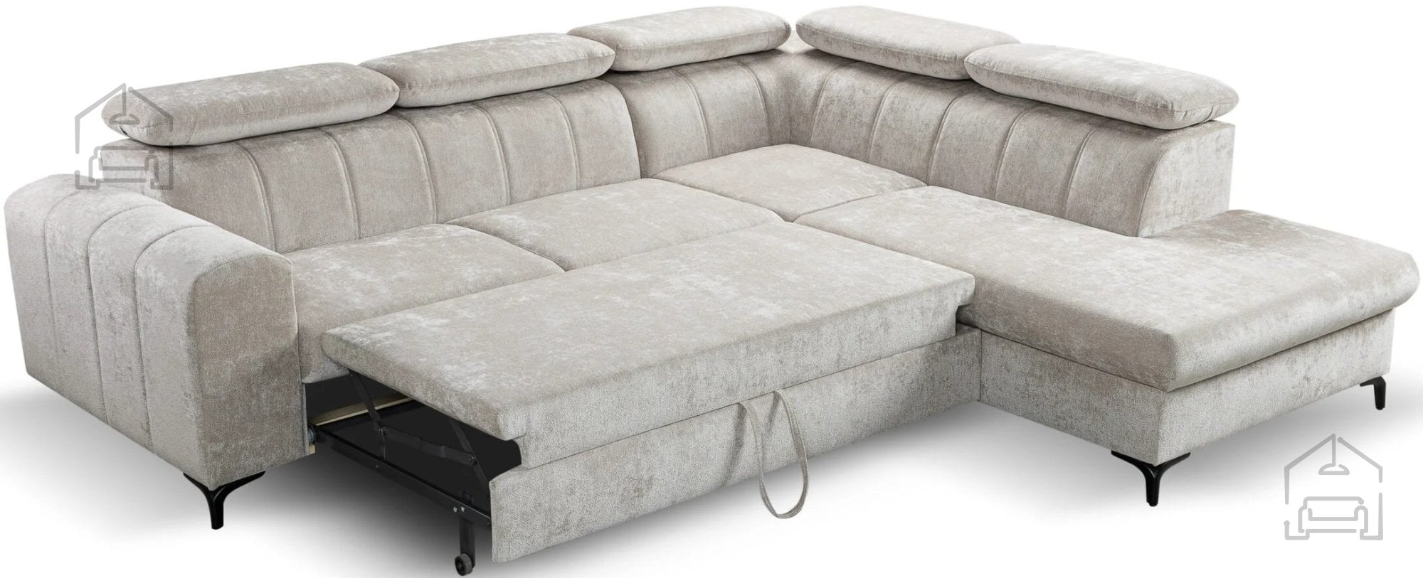 Ležalna površina meri 195x124 cm, kar omogoča udobno spanje za eno ali dve osebi. Poleg tega ima garnitura praktično posodo za posteljnino, v katero lahko shranite blazine, odeje ali dodatno posteljnino. Ta rešitev prihrani prostor in ohranja dnevno sobo urejeno.