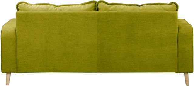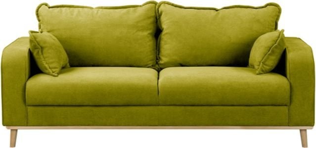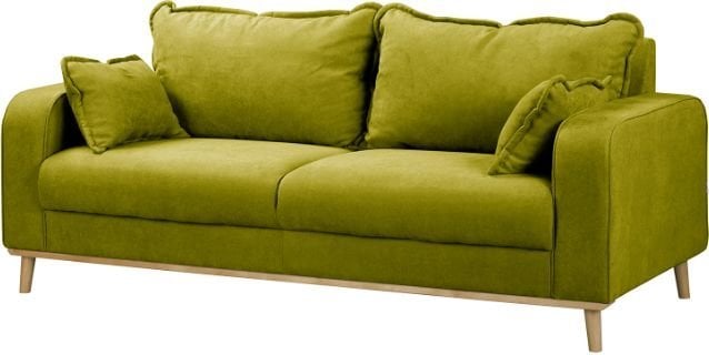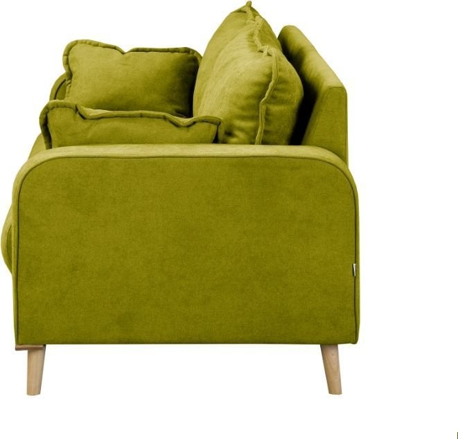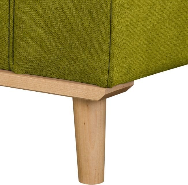 Površina dvoseda je prevlečena s kakovostno tkanino Ikoo 14 v privlačnem odtenku zelene barve. Tekstura tkanine je mehka na dotik, a hkrati trpežna in preprosta za vzdrževanje, zato je primerna za vsakodnevno uporabo. Lesene nogice v svetlo rjavi barvi dodajo toplino in naravni značaj celotni zasnovi. Skupno ima dvosed štiri lesene noge višine 14 cm, ki zagotavljajo stabilnost in vizualno lahkotnost.