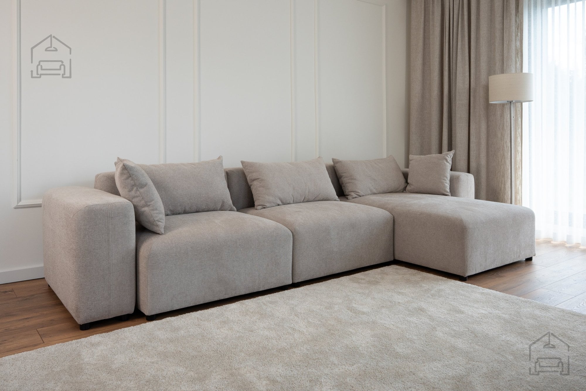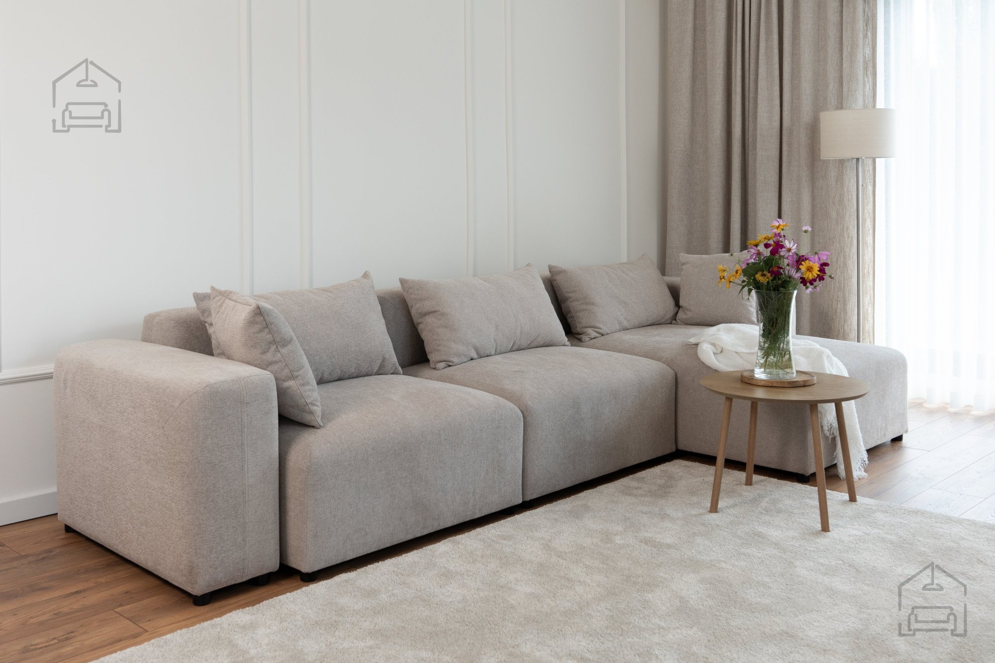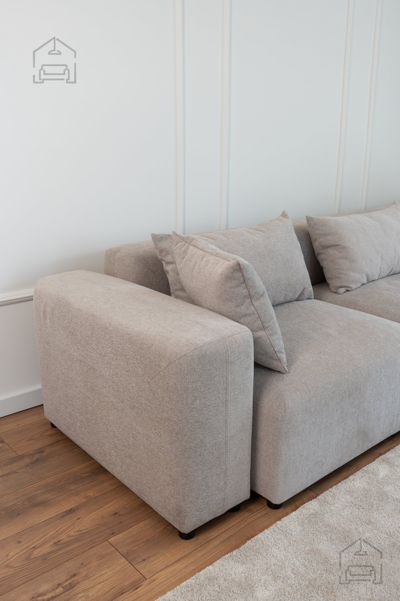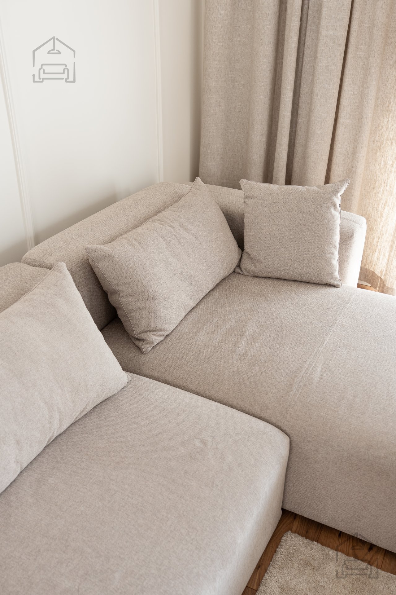 Kotna sedežna garnitura Modularna z blazinami – PKMebel združuje estetiko, kakovost in udobje v enem izdelku. Njena moderna oblika, premišljena konstrukcija in mehka tkanina ustvarjajo prijeten prostor za počitek, druženje ali branje. Izberite različico, ki se najbolje poda vašemu domu, in uživajte v udobju, ki ga prinaša kakovostna evropska izdelava.