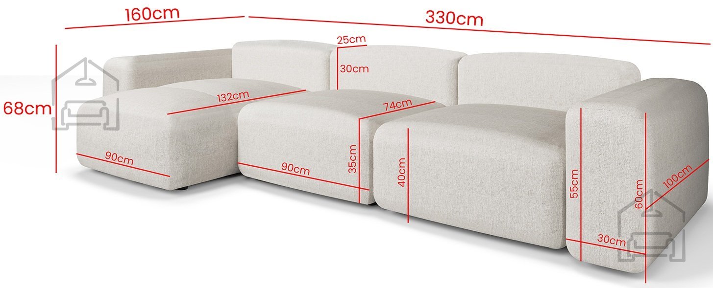 Kotna sedežna garnitura Modularna z blazinami je popolna izbira za vsak sodoben dnevni prostor, ki želi združiti funkcionalnost, udobje in estetsko dovršenost. Z dimenzijami 330x160x68 cm ponuja dovolj prostora za sproščeno sedenje več oseb, njena modularna zasnova pa omogoča enostavno prilagoditev postavitve, saj je na voljo v levi ali desni različici tipa L. Izdelana je v tovarni PKMebel na Poljskem, kjer se prepletata kakovostna izdelava in sodoben dizajn.
