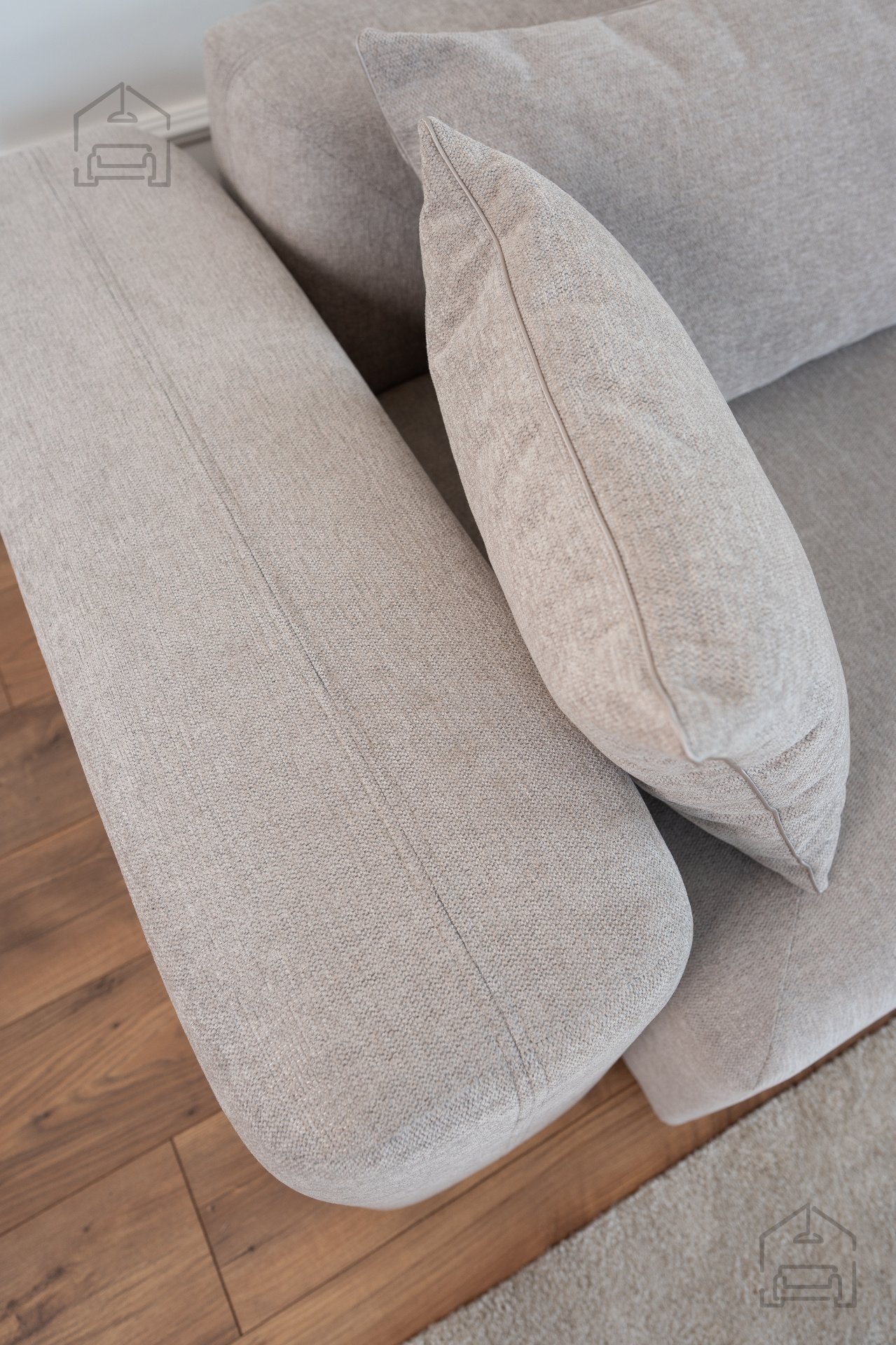 Oblika garniture je elegantna, z nežno zaobljenimi robovi, kar ustvarja prijeten vizualni učinek in omogoča enostavno vključitev v različne stile notranje opreme. Tapeciran zadnji del omogoča, da garnituro postavite tudi na sredino prostora, ne le ob steno.