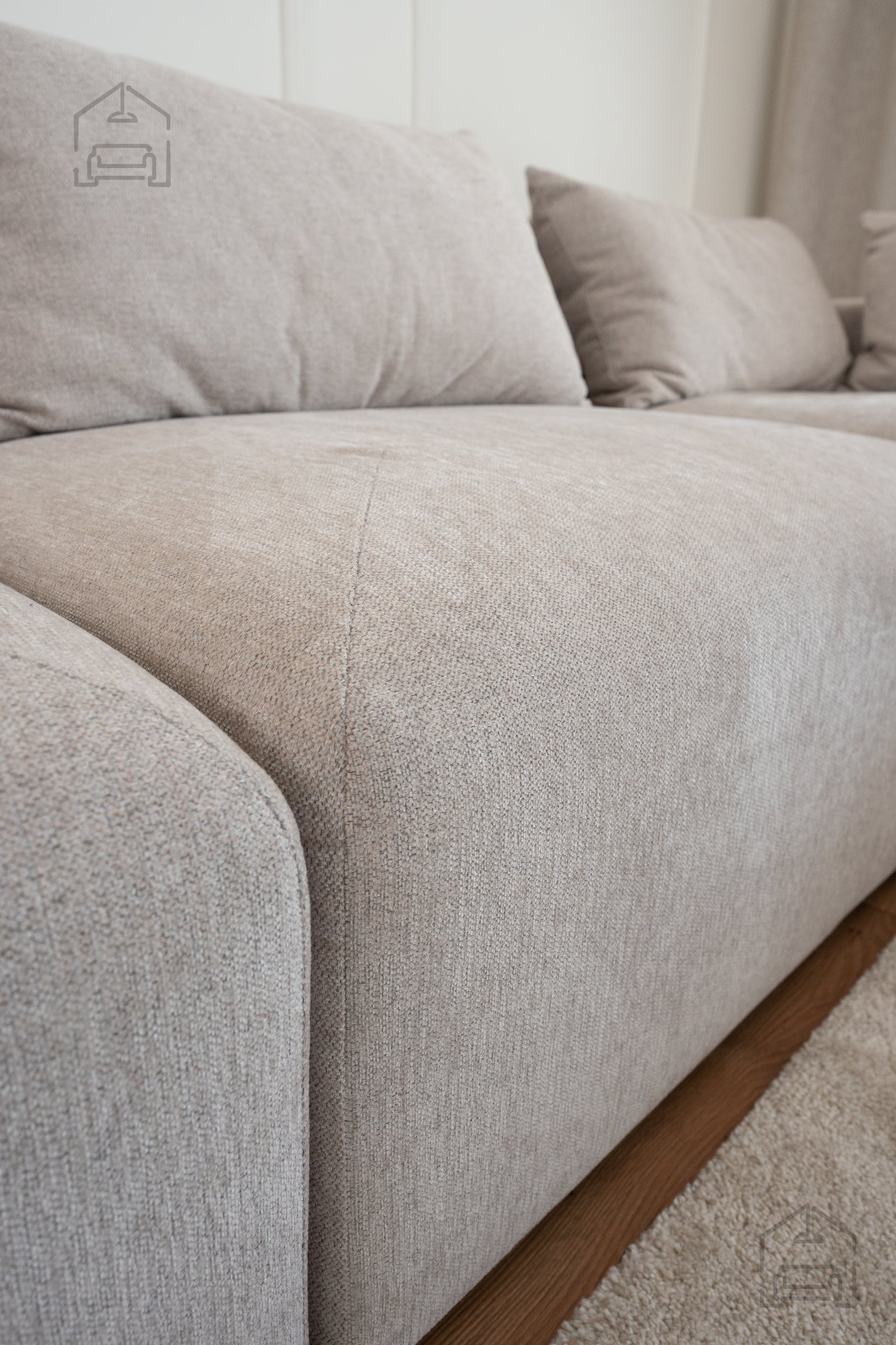 Sedežna garnitura je oblazinjena v tkanino Sorella, ki je mehka pletenina z drobno teksturo. Poleg prijetnega občutka na dotik tkanina prinaša tudi sodoben videz in enostavno vzdrževanje. Na voljo je v več barvnih odtenkih, kar omogoča, da garnituro prilagodite svojemu prostoru in osebnemu slogu. Črne nogice višine 5 cm dodajo kontrast ter vizualno lahkotnost, hkrati pa omogočajo enostavno čiščenje tal pod garnituro.