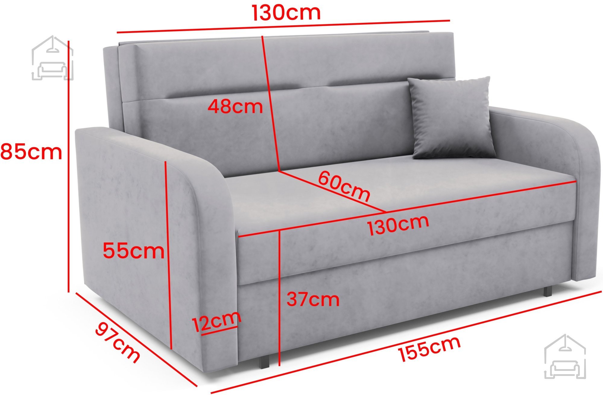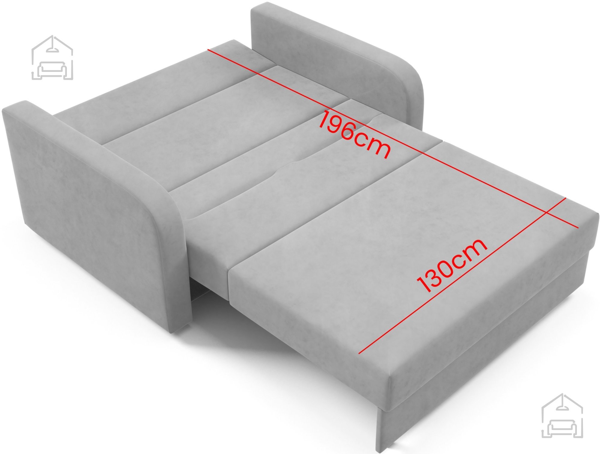 Ležalna površina meri 130x196 cm, kar zagotavlja dovolj prostora za enega odraslega ali dva otroka. Dvosed je zasnovan z mislijo na vsakodnevno uporabo, saj je konstrukcija trdna in stabilna. Okvir je izdelan iz lesa, ki zagotavlja dolgotrajno vzdržljivost, medtem ko je notranjost oblazinjena s kakovostno peno, ki nudi mehko, a hkrati podporno sedenje. Največja dovoljena obremenitev znaša 125 kg, kar dodatno potrjuje zanesljivost izdelka.