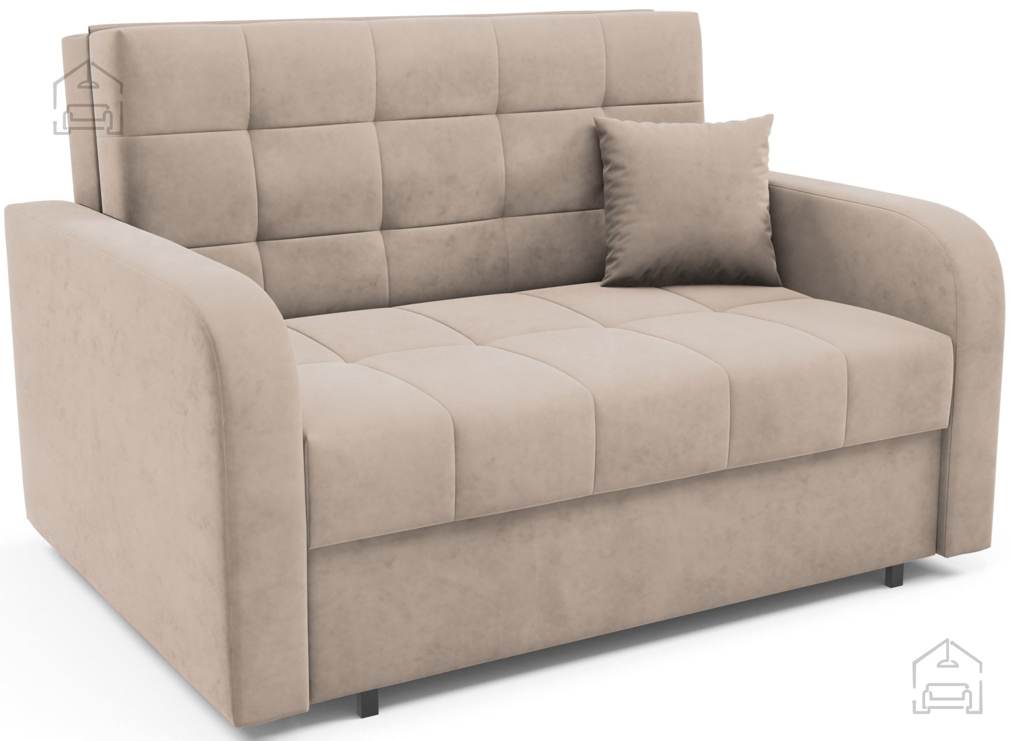 Okvir dvoseda je izdelan iz lesa, kar zagotavlja stabilnost in trdnost celotne konstrukcije. Sedežni del in naslon sta oblazinjena s kakovostno peno, ki se lepo prilagaja telesu in ohranja obliko tudi po daljši uporabi. Pena nudi ustrezno podporo in hkrati poskrbi, da sedenje ali spanje ostane prijetno mehko. Tkanina, prikazana na sliki, je Kronos 53 – prijeten material, znan po bogati teksturi in odpornosti proti obrabi. Tkanina je na voljo v več barvnih različicah, zato se dvosed zlahka prilagodi različnim notranjim slogom.