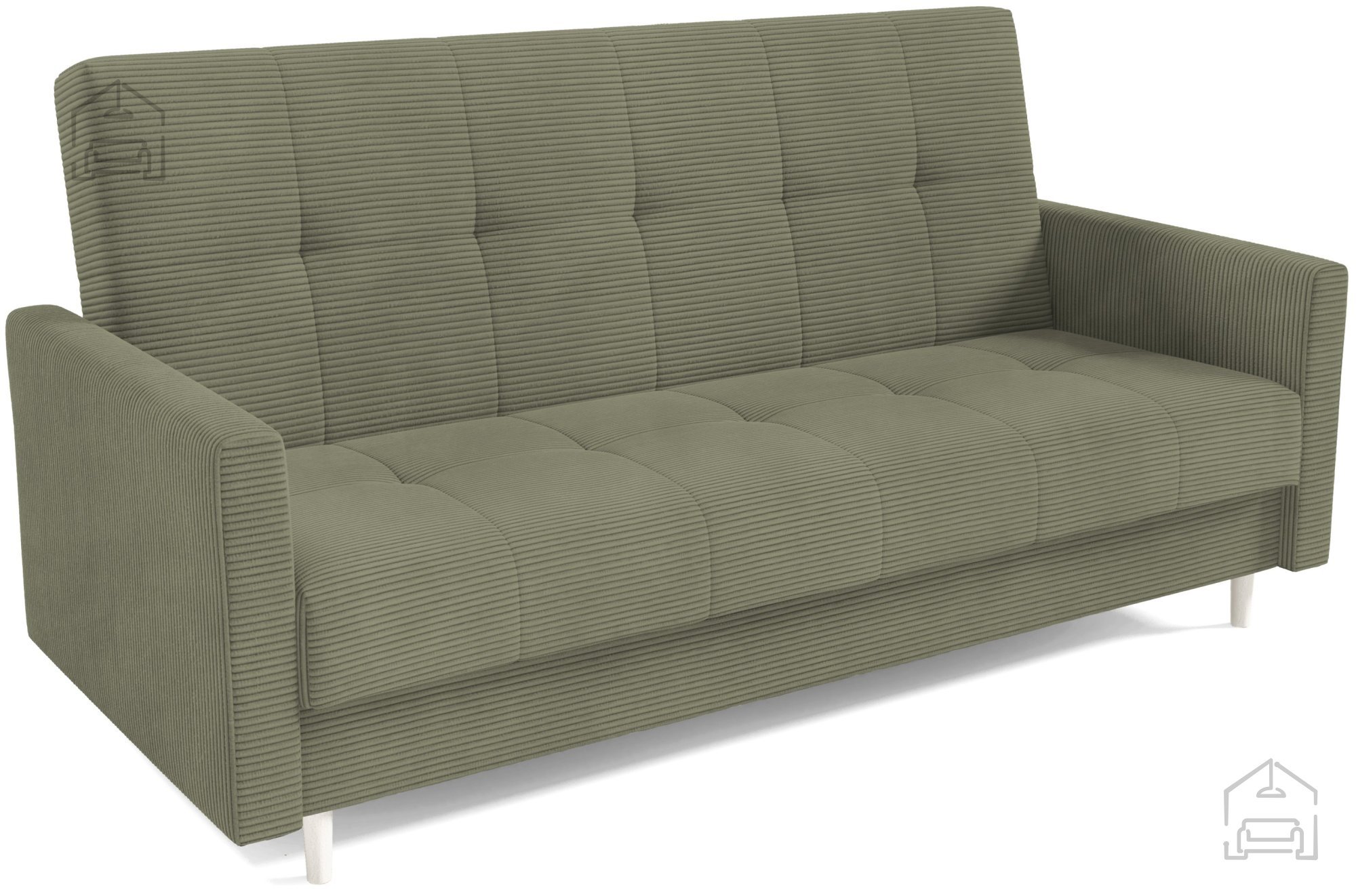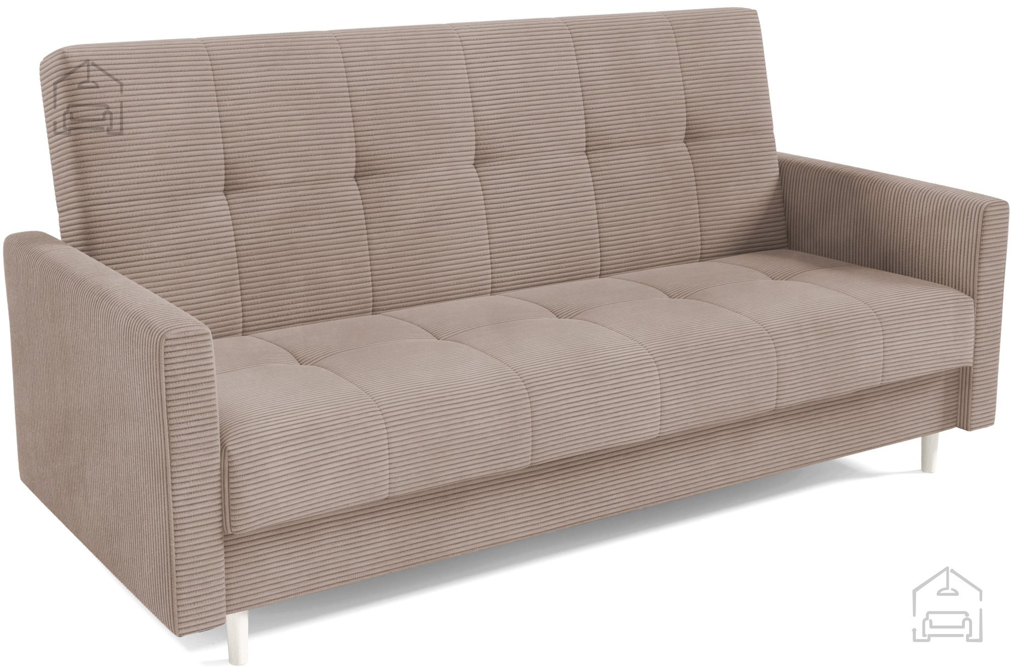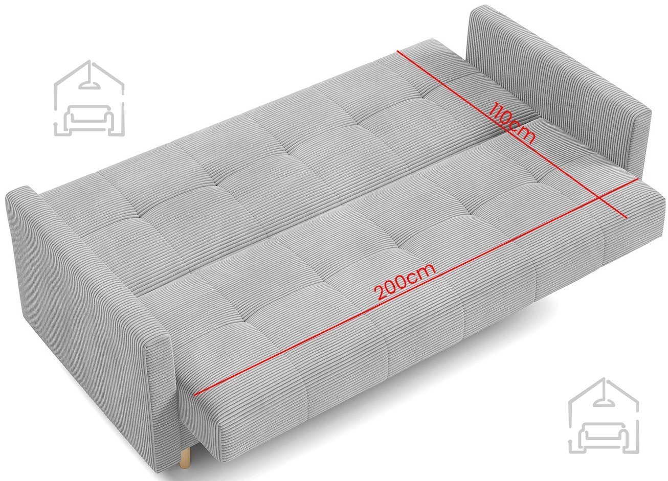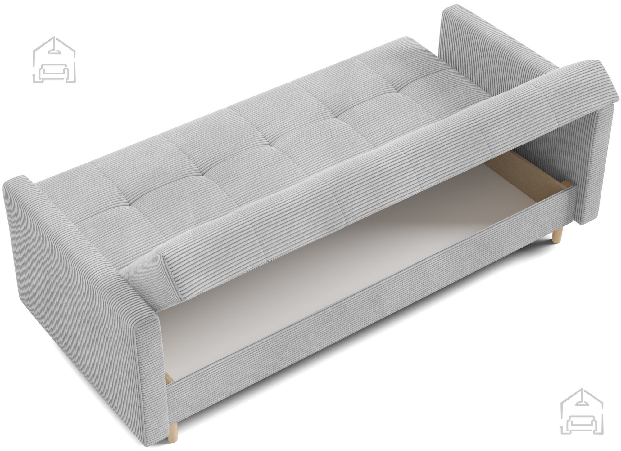Poleg funkcije spanja ima trosed tudi prostoren predal za posteljnino, ki se nahaja pod sedalnim delom. Ta praktična rešitev omogoča shranjevanje odej, vzglavnikov ali drugih tekstilnih dodatkov, s čimer ohranja red in čist videz prostora. Predal je enostavno dostopen in ne zahteva posebnega napora pri odpiranju.