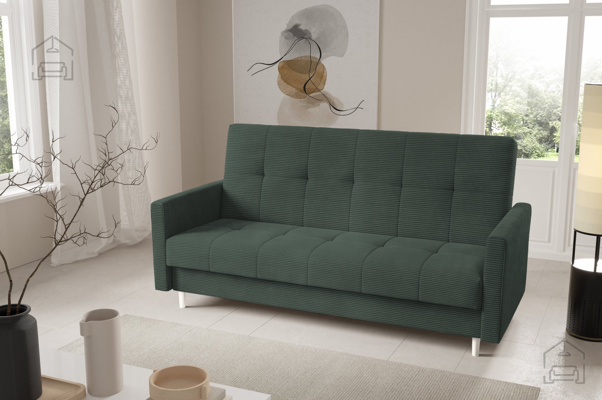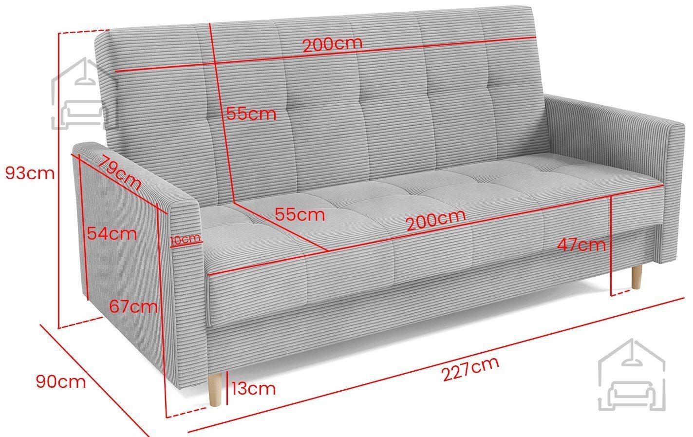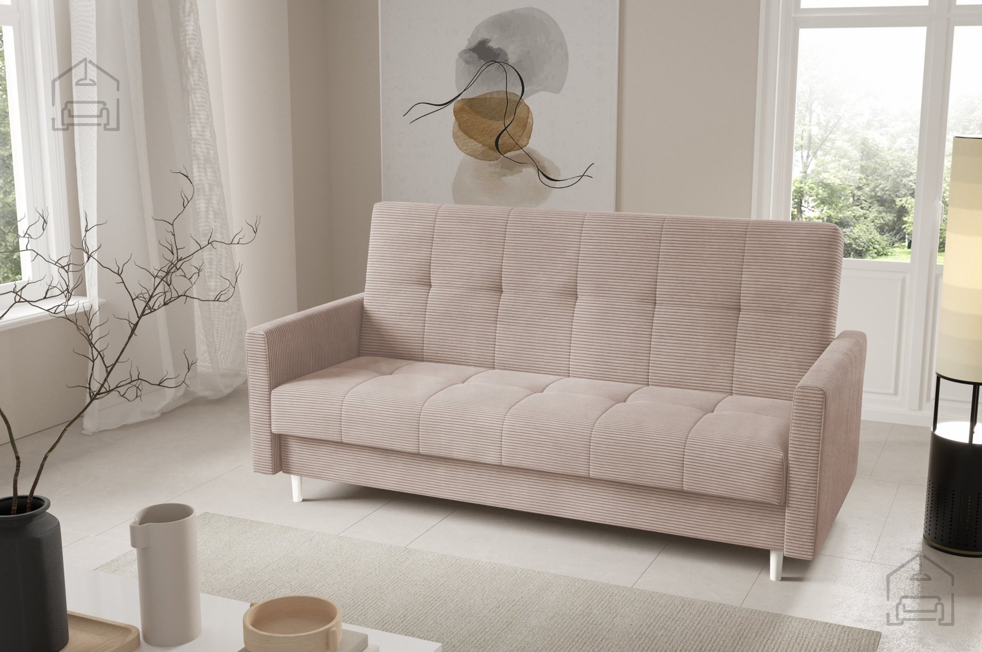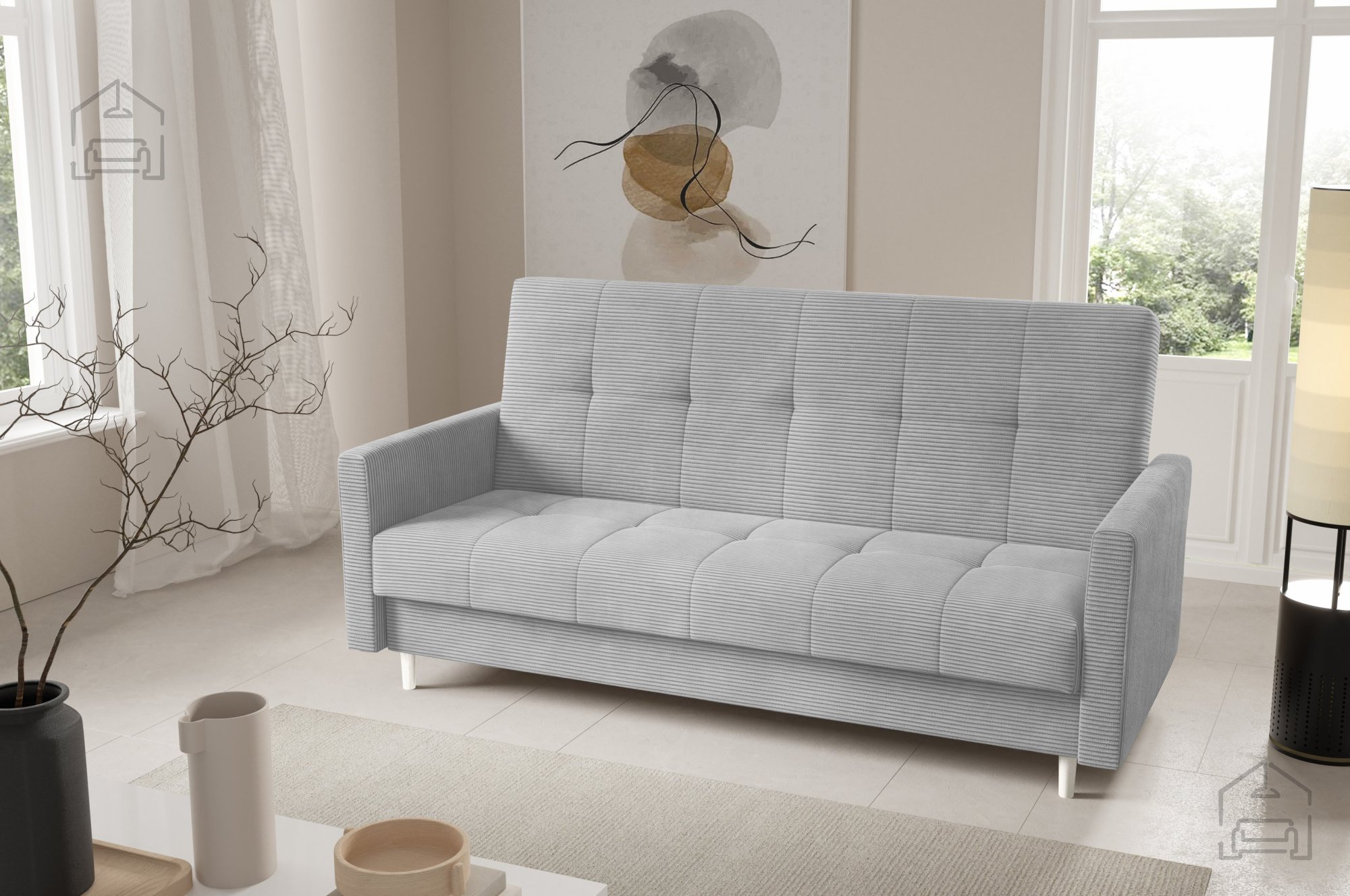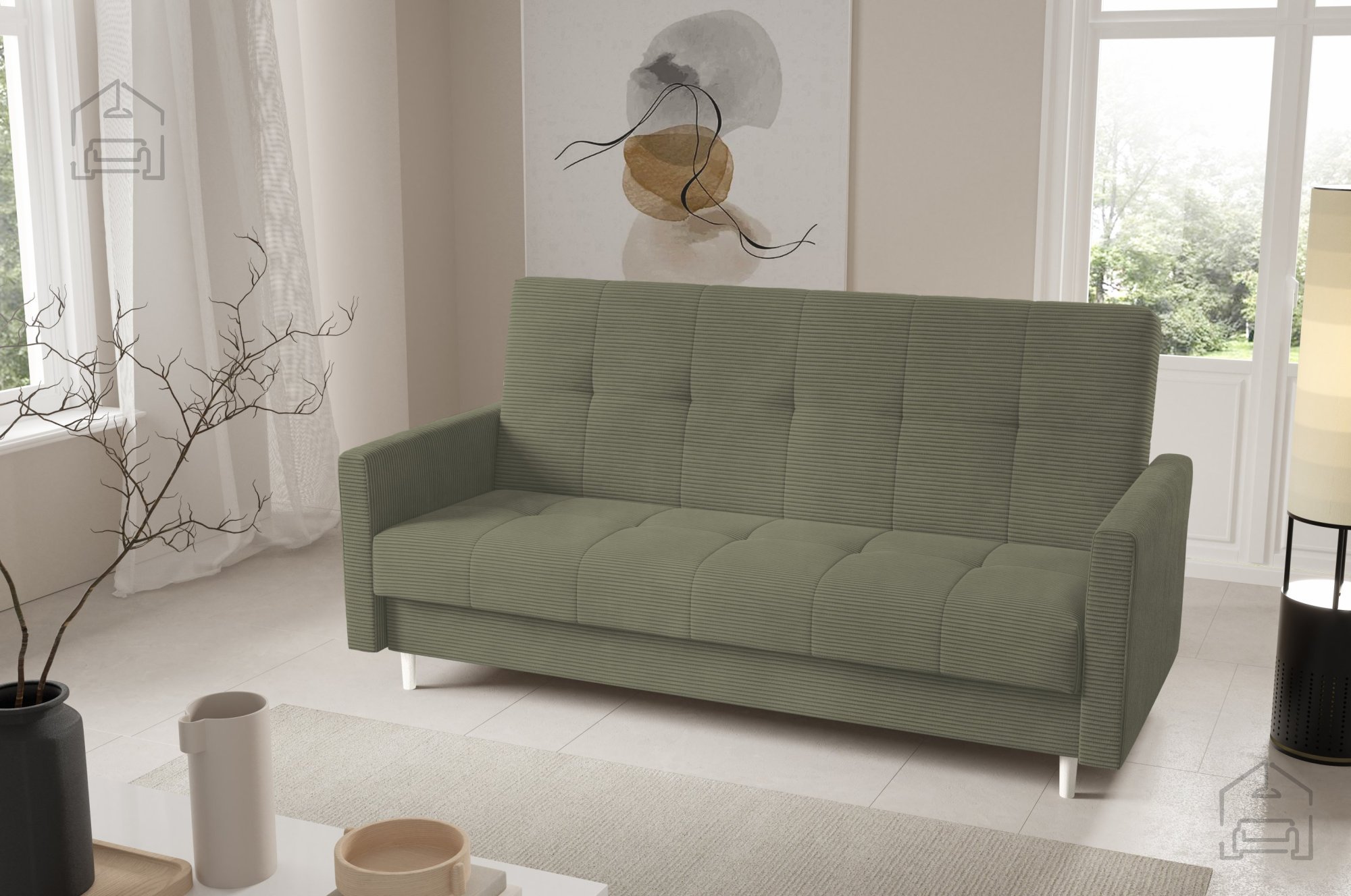Poleg funkcije spanja ima trosed tudi prostoren predal za posteljnino, ki se nahaja pod sedalnim delom. Ta praktična rešitev omogoča shranjevanje odej, vzglavnikov ali drugih tekstilnih dodatkov, s čimer ohranja red in čist videz prostora. Predal je enostavno dostopen in ne zahteva posebnega napora pri odpiranju.