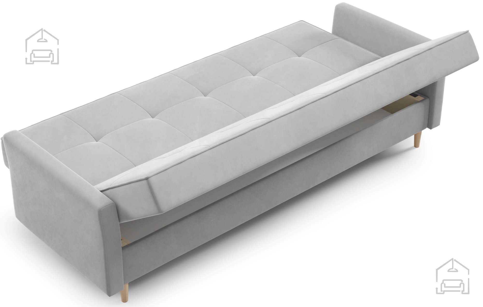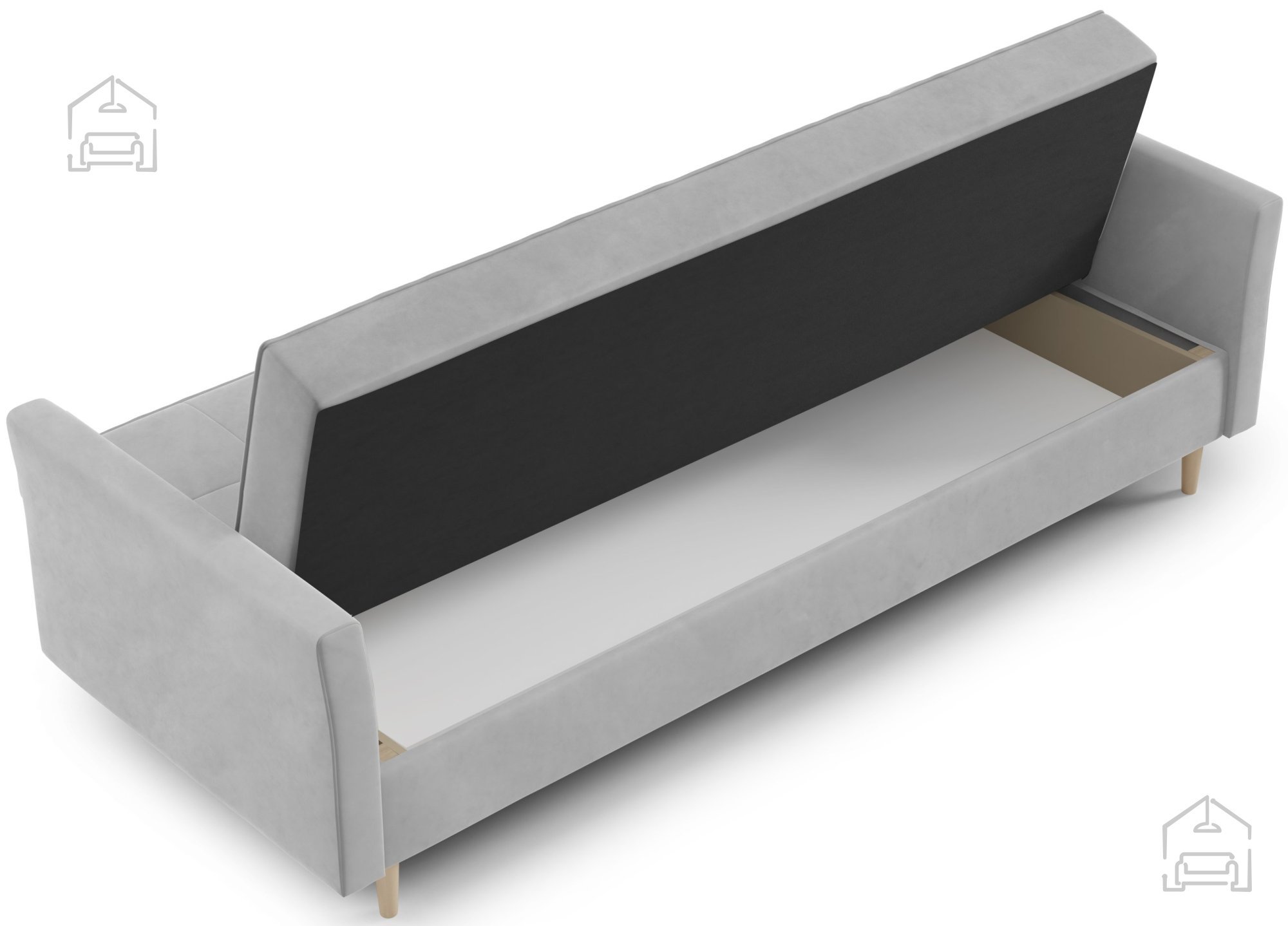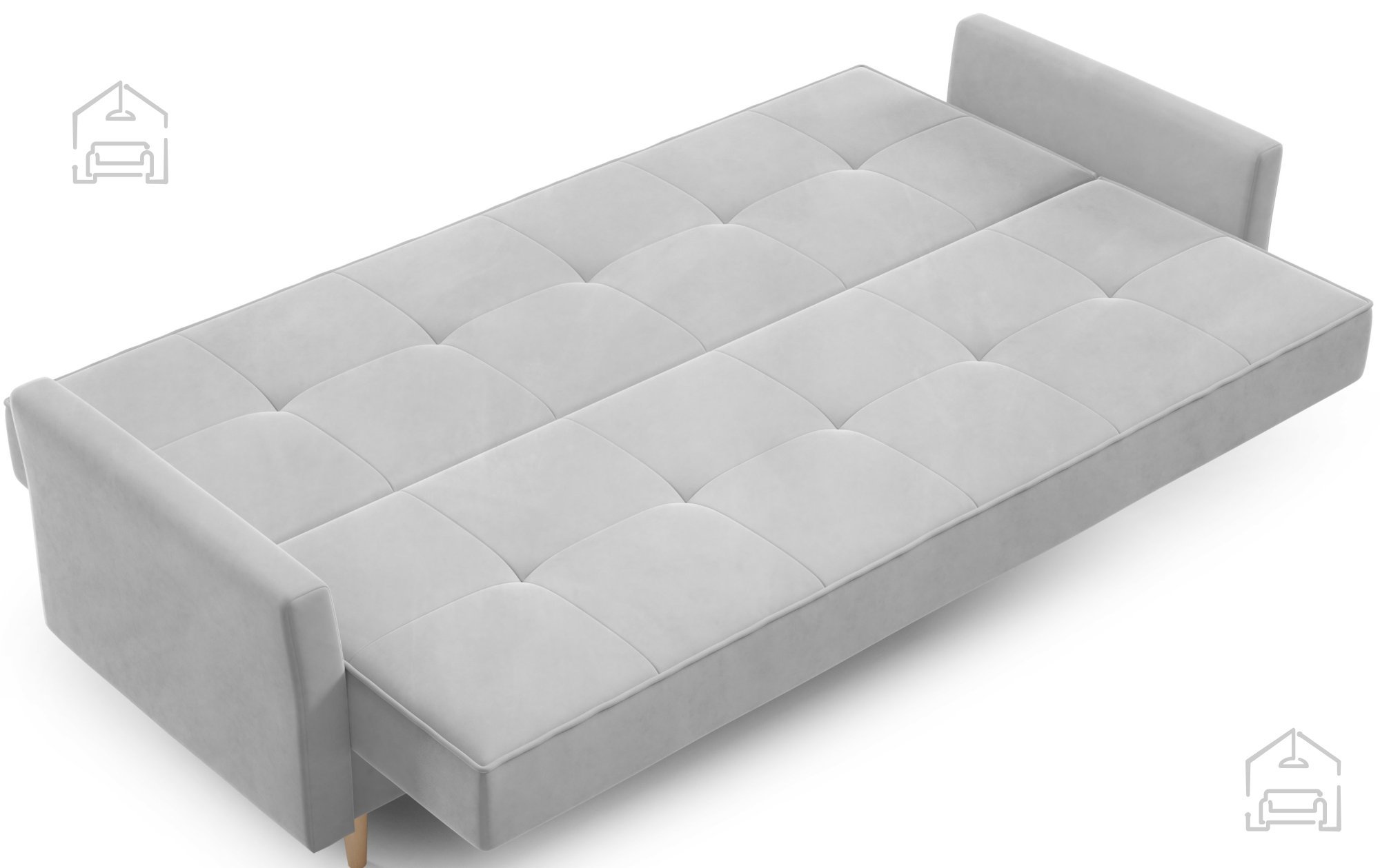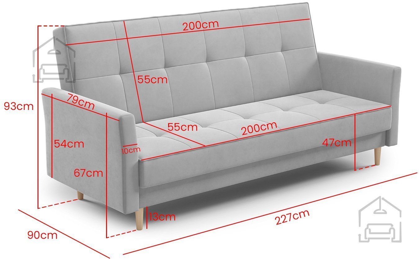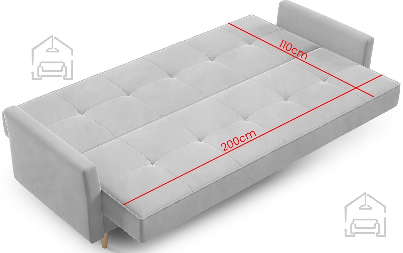 Trosed Kari znamke PKMebel je sodoben kos oblazinjenega pohištva, ki združuje funkcionalnost, preprosto obliko in kakovostno izdelavo. S svojimi dimenzijami 227x90x93 cm ponuja dovolj prostora za udobno sedenje čez dan, zvečer pa se z enostavnim klik klak mehanizmom spremeni v prijetno ležišče dimenzij 110x200 cm. Takšen sistem omogoča hitro in breznaporno preoblikovanje sedežnega dela v posteljo, kar je idealno za vsakodnevno uporabo ali občasno prenočevanje gostov.