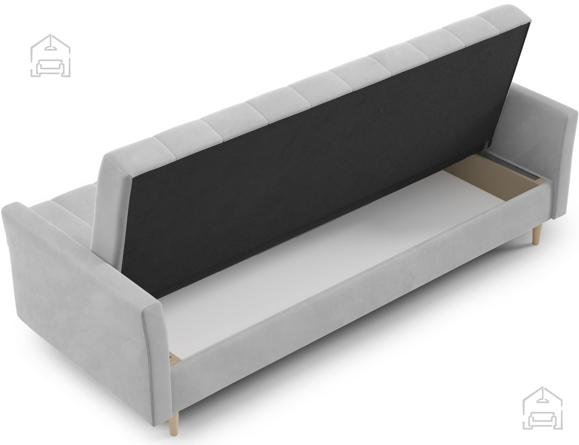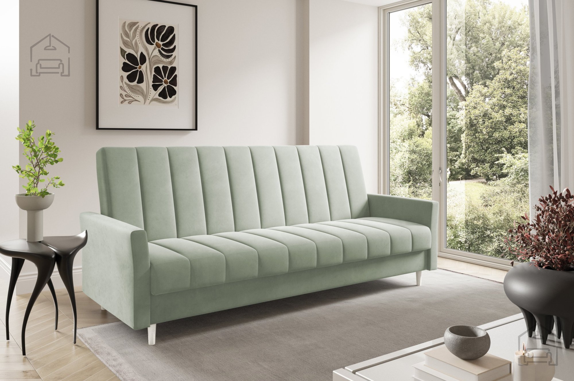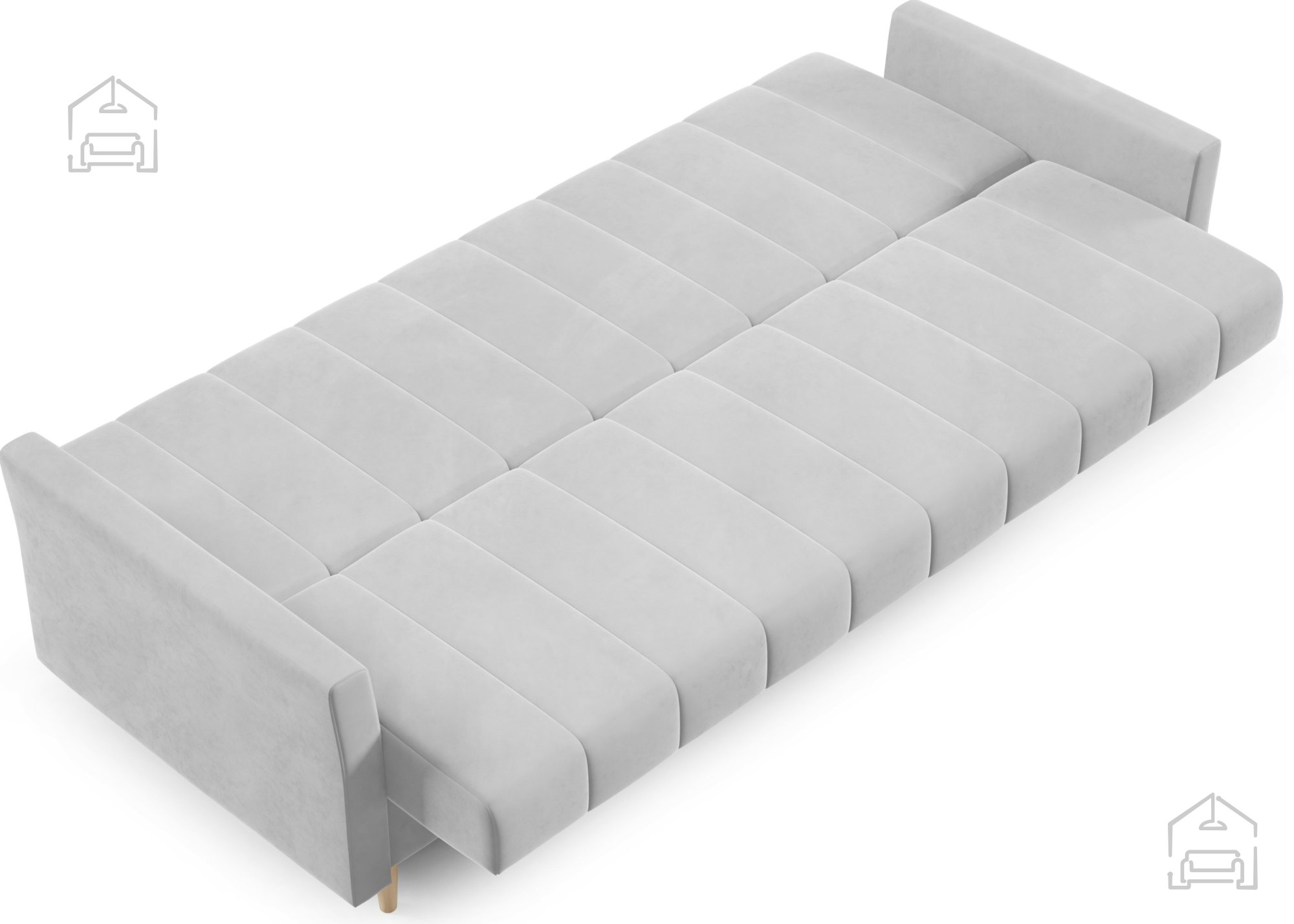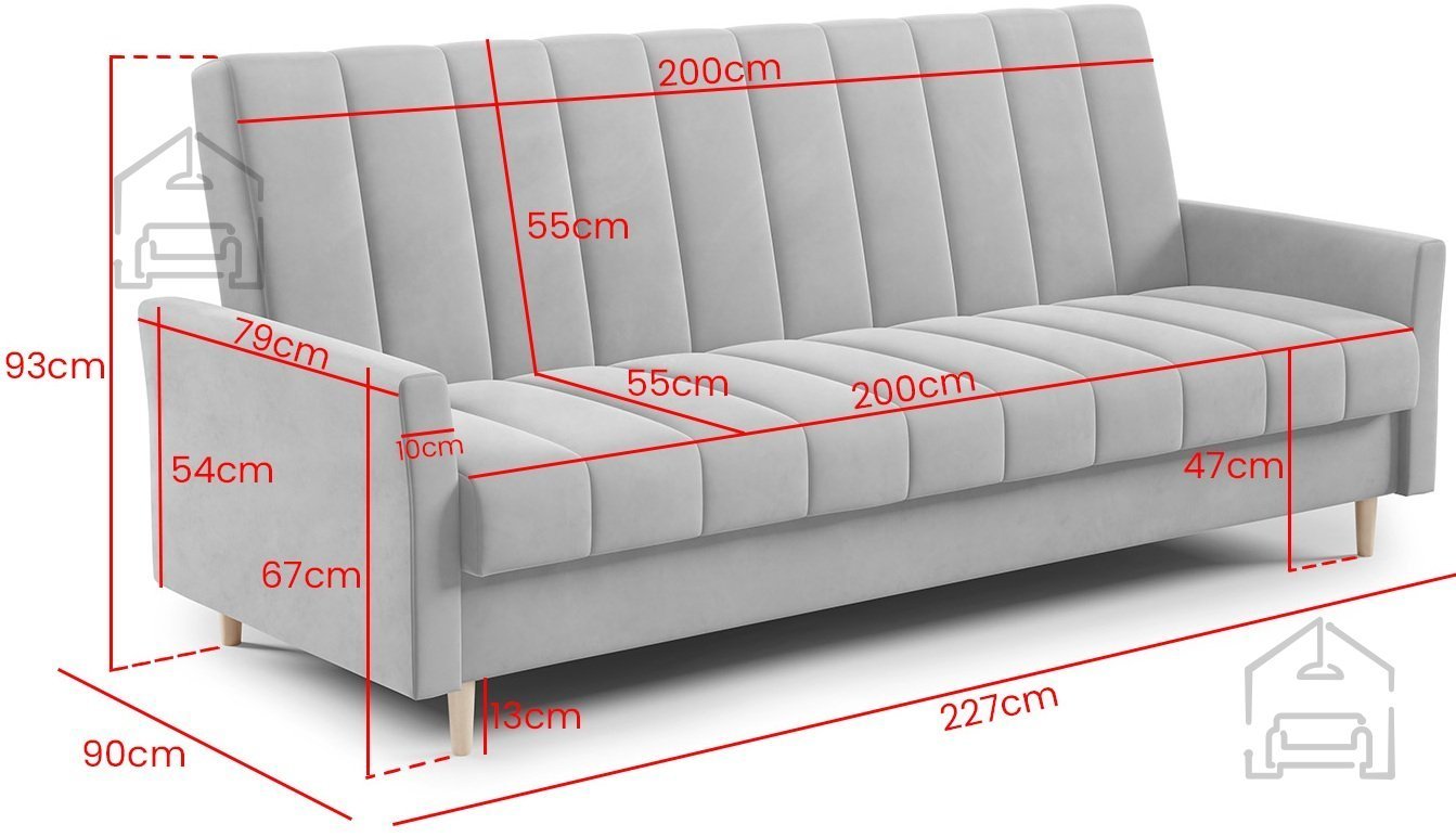 Trosed Sara znamke PKMebel je sodoben kos oblazinjenega pohištva, ki združuje funkcionalnost, preprosto obliko in kakovostno izdelavo. S svojimi dimenzijami 227x90x93 cm ponuja dovolj prostora za udobno sedenje čez dan, zvečer pa se z enostavnim klik klak mehanizmom spremeni v prijetno ležišče dimenzij 110x200 cm. Takšen sistem omogoča hitro in breznaporno preoblikovanje sedežnega dela v posteljo, kar je idealno za vsakodnevno uporabo ali občasno prenočevanje gostov.