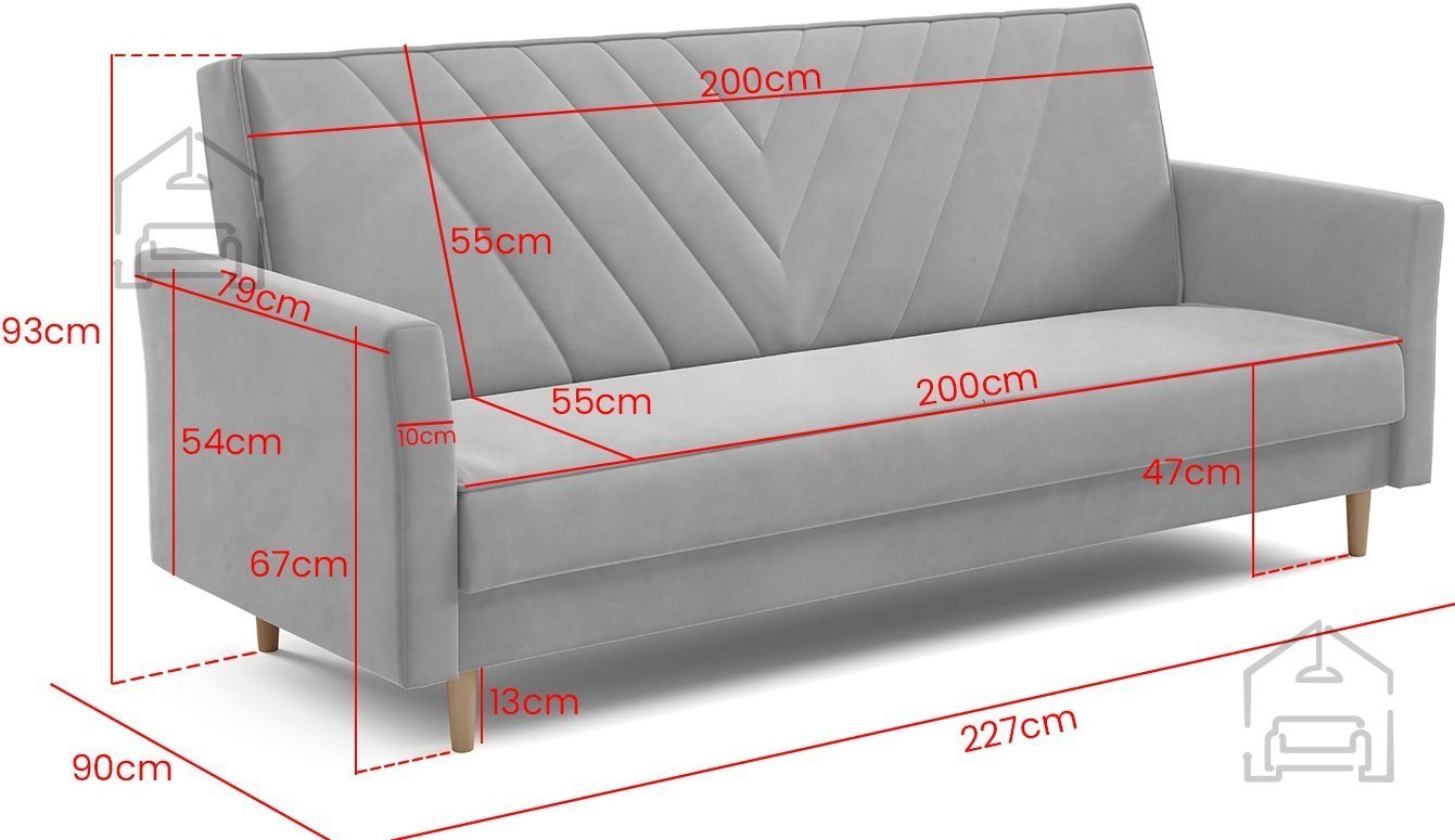 Trosed Sven znamke PKMebel je sodoben kos oblazinjenega pohištva, ki združuje funkcionalnost, preprosto obliko in kakovostno izdelavo. S svojimi dimenzijami 227x90x93 cm ponuja dovolj prostora za udobno sedenje čez dan, zvečer pa se z enostavnim klik klak mehanizmom spremeni v prijetno ležišče dimenzij 110x200 cm. Takšen sistem omogoča hitro in breznaporno preoblikovanje sedežnega dela v posteljo, kar je idealno za vsakodnevno uporabo ali občasno prenočevanje gostov.