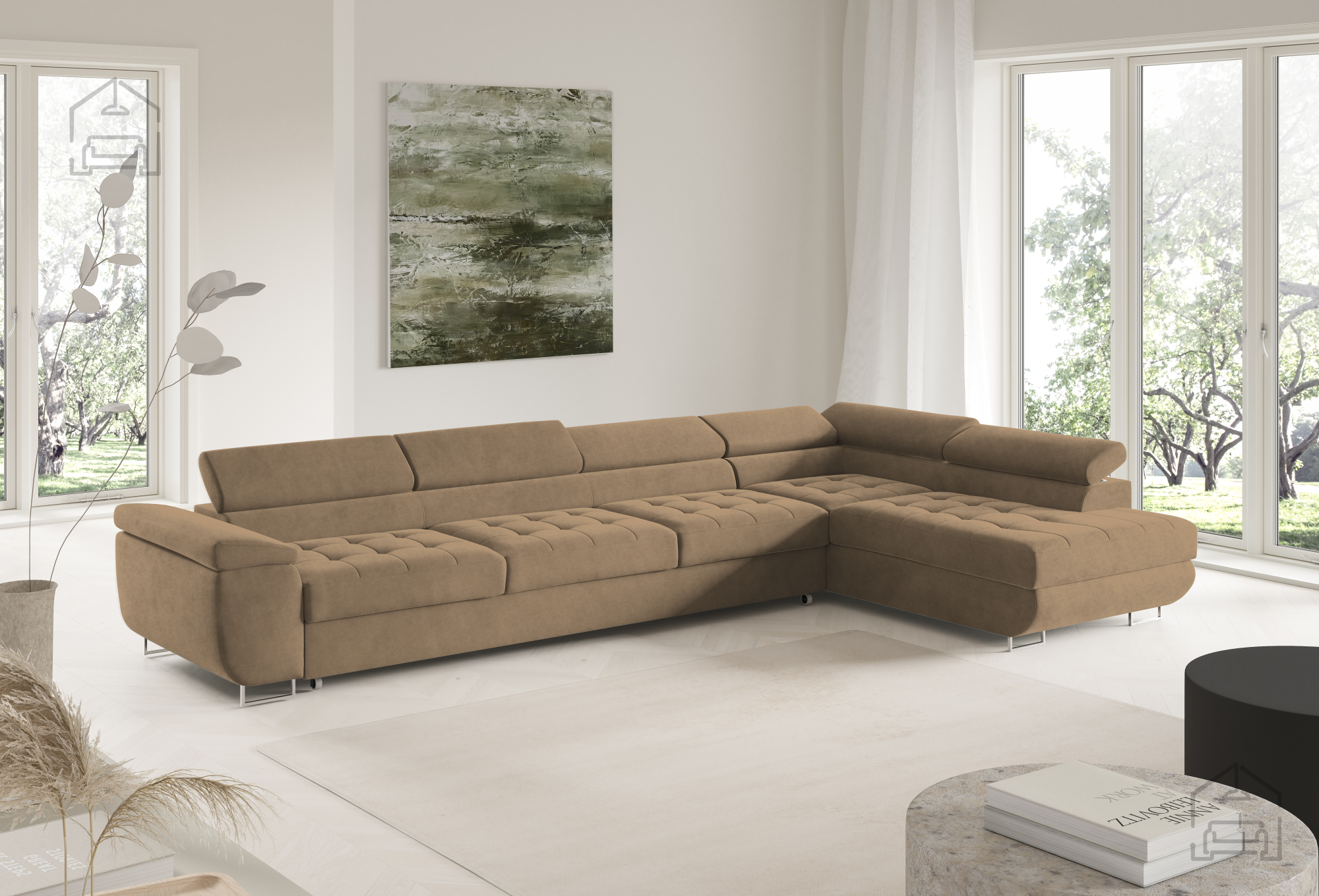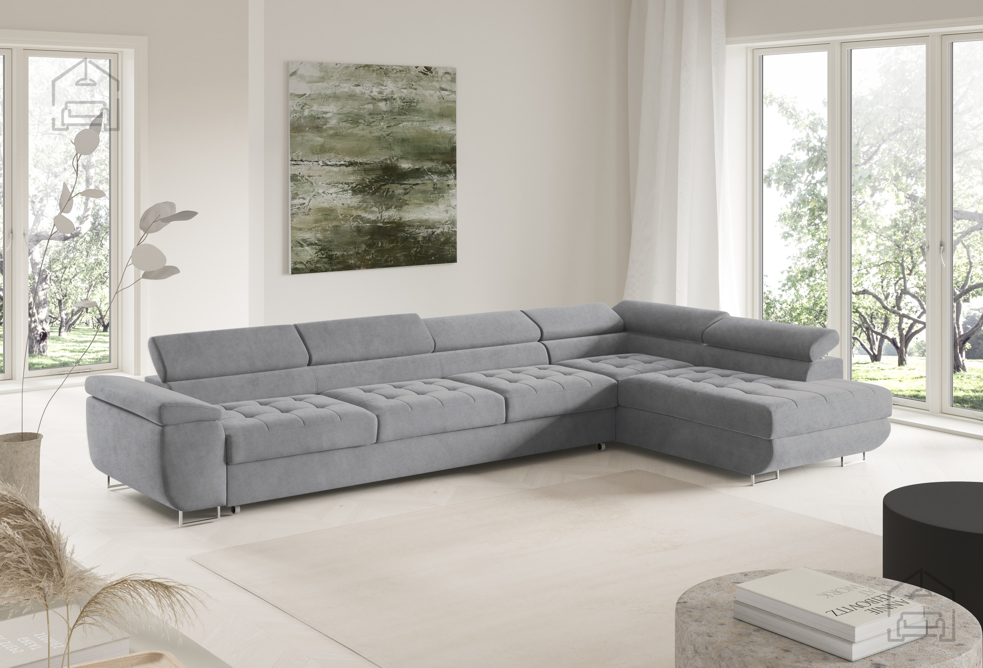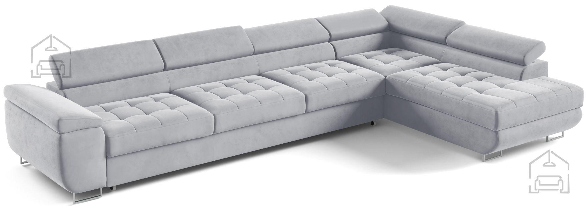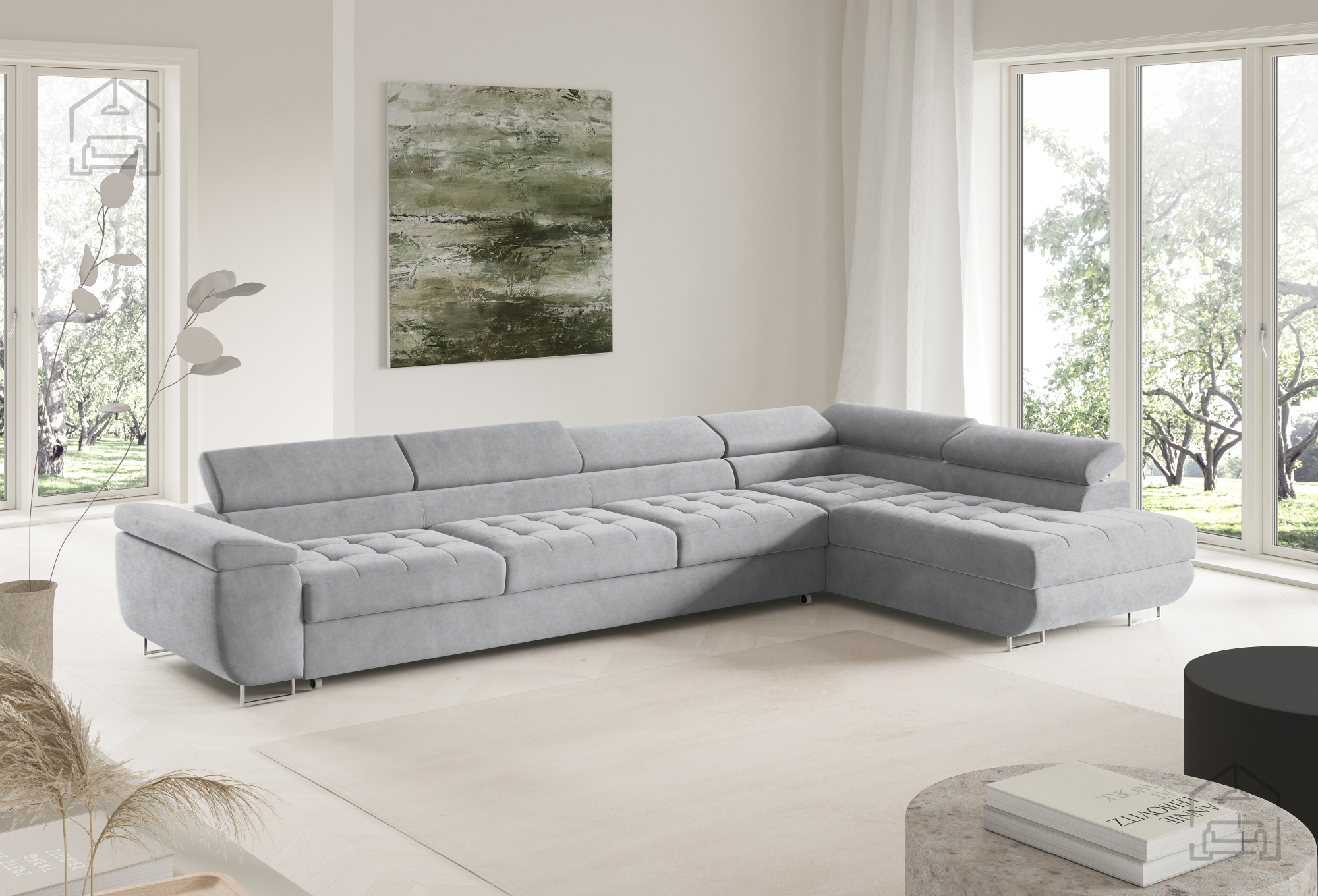 Kotna izvedba Benjamin 155 XL je na voljo v levi ali desni postavitvi, kar pomeni, da se lahko garnitura popolnoma prilagodi razporeditvi vaše dnevne sobe. Zaradi svoje velikosti in oblike omogoča učinkovito izrabo prostora ter hkrati ustvarja prijeten kotiček za druženje ali sprostitev. Višina garniture znaša 72 cm, medtem ko se z dvignjenimi vzglavniki poveča na 92 cm, kar poudarja ergonomsko zasnovo in vsestransko uporabnost. Največja dovoljena obremenitev znaša 300 kg, kar dodatno potrjuje robustnost konstrukcije in trdnost uporabljenih materialov.