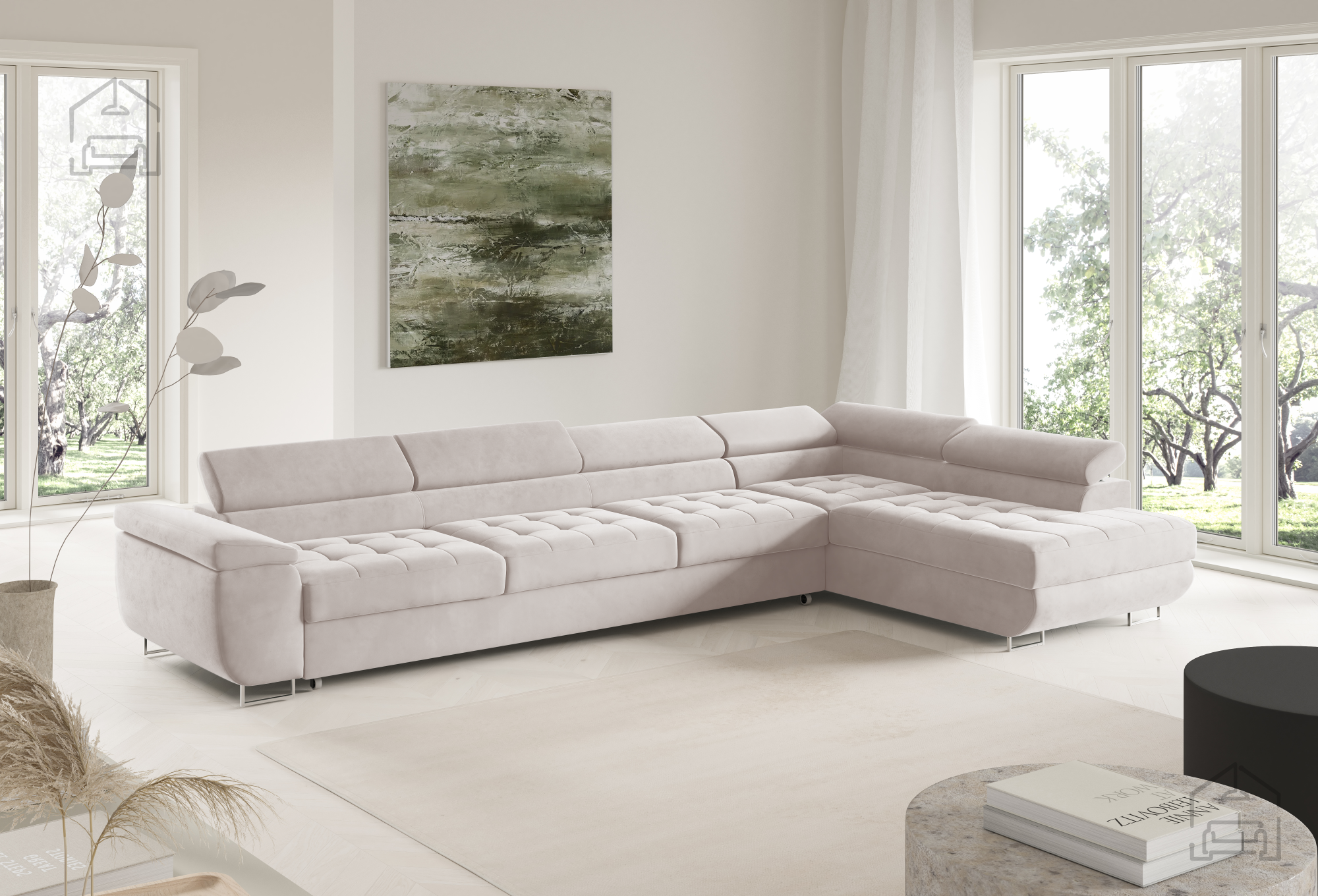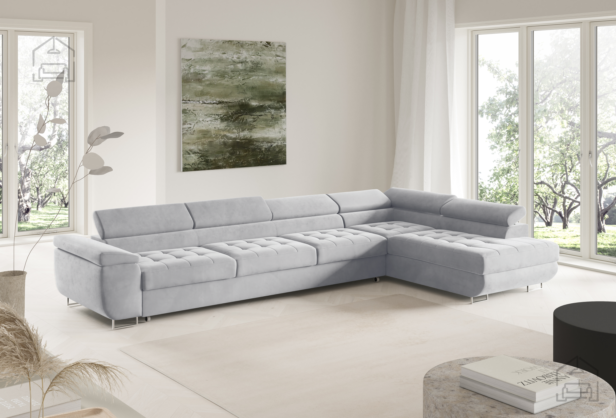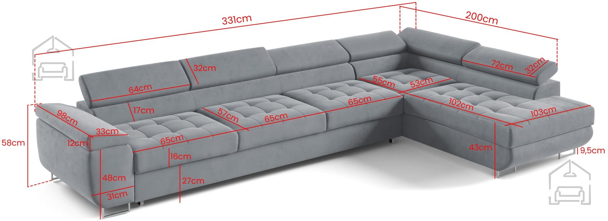 Kotna izvedba Benjamin 155 XL je na voljo v levi ali desni postavitvi, kar pomeni, da se lahko garnitura popolnoma prilagodi razporeditvi vaše dnevne sobe. Zaradi svoje velikosti in oblike omogoča učinkovito izrabo prostora ter hkrati ustvarja prijeten kotiček za druženje ali sprostitev. Višina garniture znaša 72 cm, medtem ko se z dvignjenimi vzglavniki poveča na 92 cm, kar poudarja ergonomsko zasnovo in vsestransko uporabnost. Največja dovoljena obremenitev znaša 300 kg, kar dodatno potrjuje robustnost konstrukcije in trdnost uporabljenih materialov.