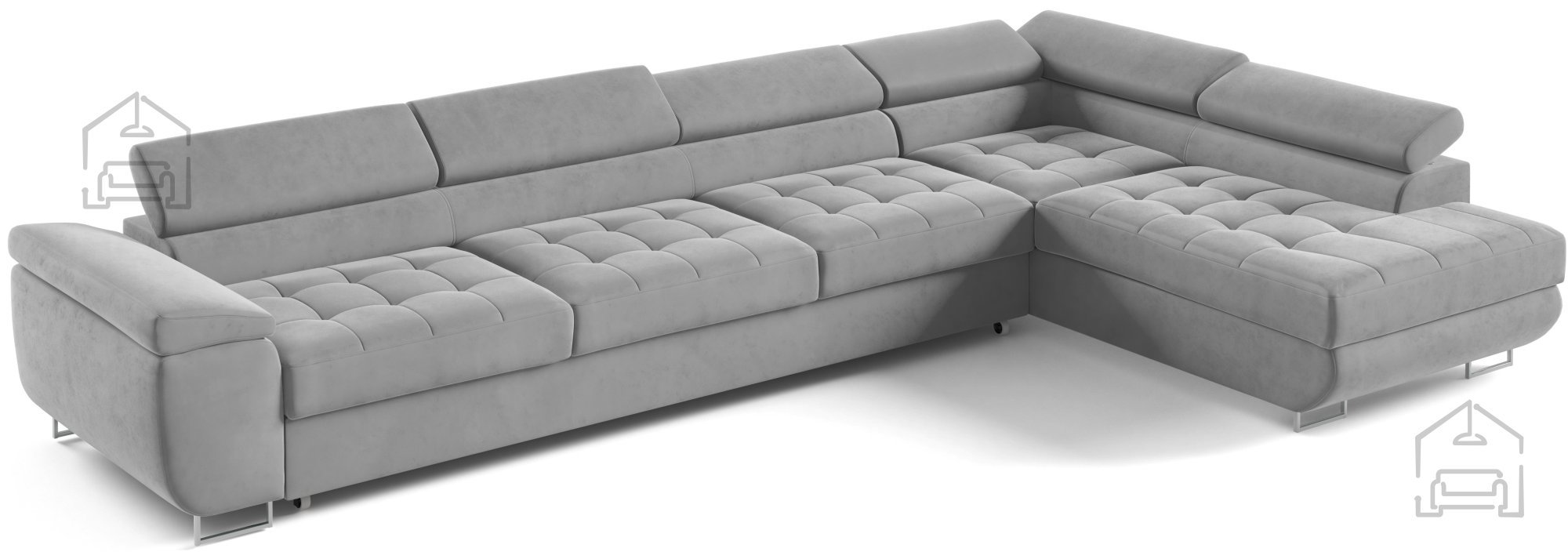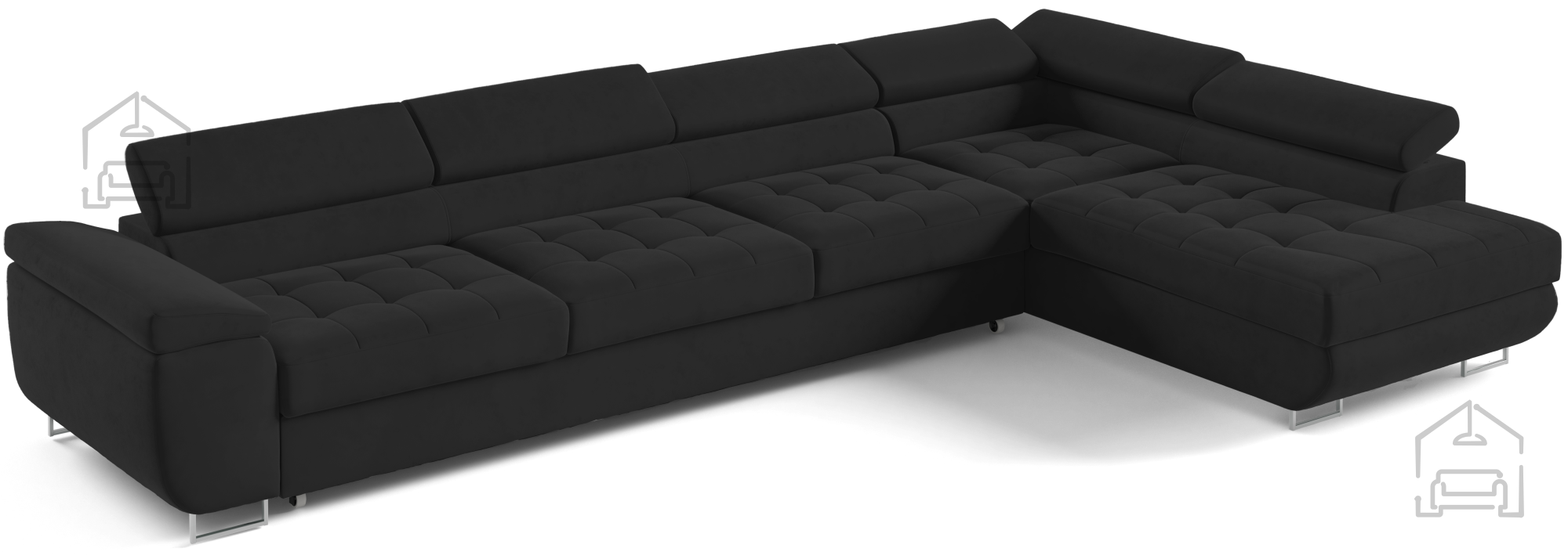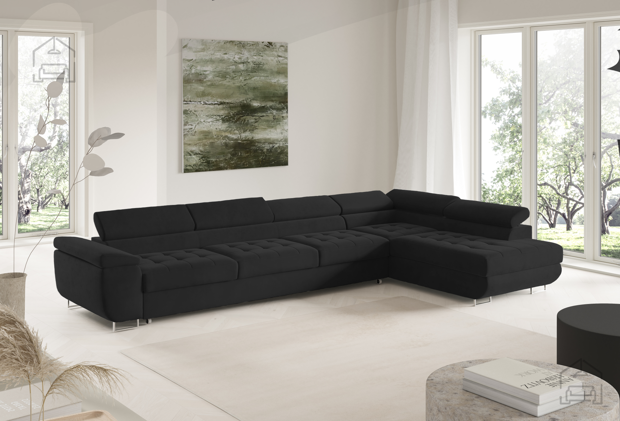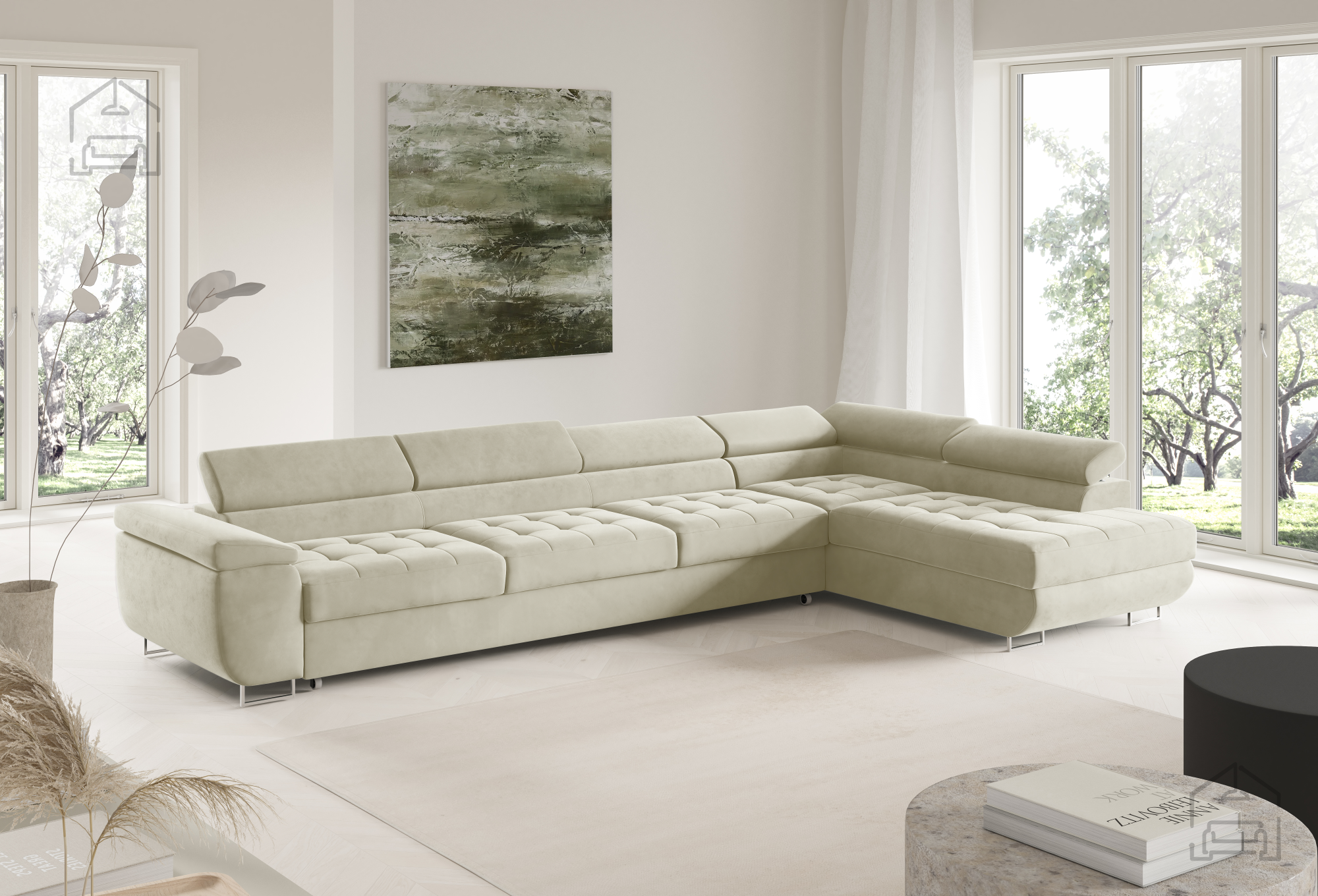 Kotna izvedba Benjamin 155 XL je na voljo v levi ali desni postavitvi, kar pomeni, da se lahko garnitura popolnoma prilagodi razporeditvi vaše dnevne sobe. Zaradi svoje velikosti in oblike omogoča učinkovito izrabo prostora ter hkrati ustvarja prijeten kotiček za druženje ali sprostitev. Višina garniture znaša 72 cm, medtem ko se z dvignjenimi vzglavniki poveča na 92 cm, kar poudarja ergonomsko zasnovo in vsestransko uporabnost. Največja dovoljena obremenitev znaša 300 kg, kar dodatno potrjuje robustnost konstrukcije in trdnost uporabljenih materialov.