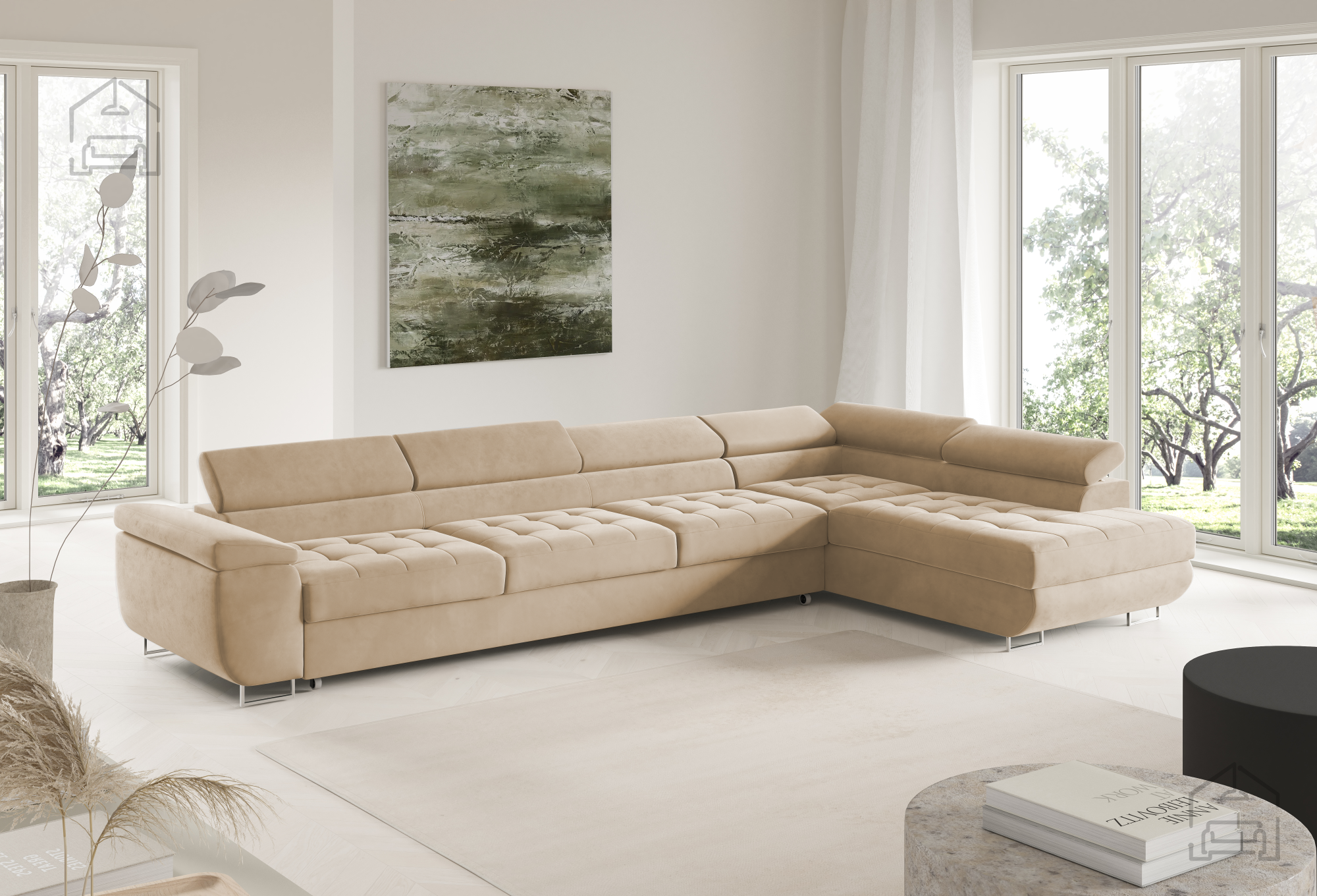 Kotna sedežna garnitura Benjamin 155 XL predstavlja popolno ravnovesje med sodobno obliko in udobjem, ki ga pričakujemo od kakovostnega pohištva. Izdelana je v poljski tovarni PKMebel, kjer združujejo natančno izdelavo, trajnostne materiale in preverjene mehanizme. Garnitura je zasnovana za prostorne dnevne sobe, kjer ima pomembno vlogo udobje, funkcionalnost in eleganten videz. S svojo skupno dolžino 331 cm, širino 201 cm in višino 72 cm ponuja dovolj prostora za sprostitev več oseb hkrati, hkrati pa s svojo funkcijo raztegovanja omogoča hitro preobrazbo v udobno ležišče velikosti 125 × 250 cm.