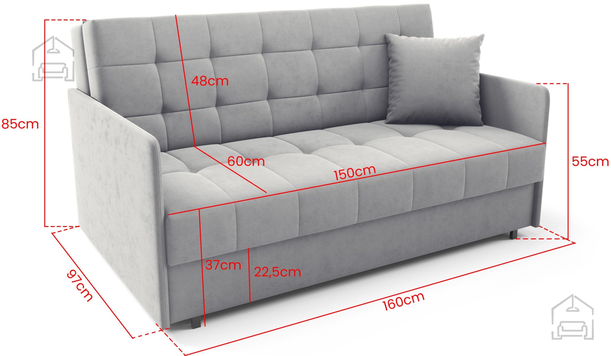 Posebna prednost modela je njegova kompaktna širina 160 cm, ki omogoča postavitev tudi v manjše prostore, ne da bi pri tem izgubili občutek prostornosti. Z višino 85 cm in globino 97 cm ohranja uravnotežene proporce, zato deluje elegantno in sodobno.