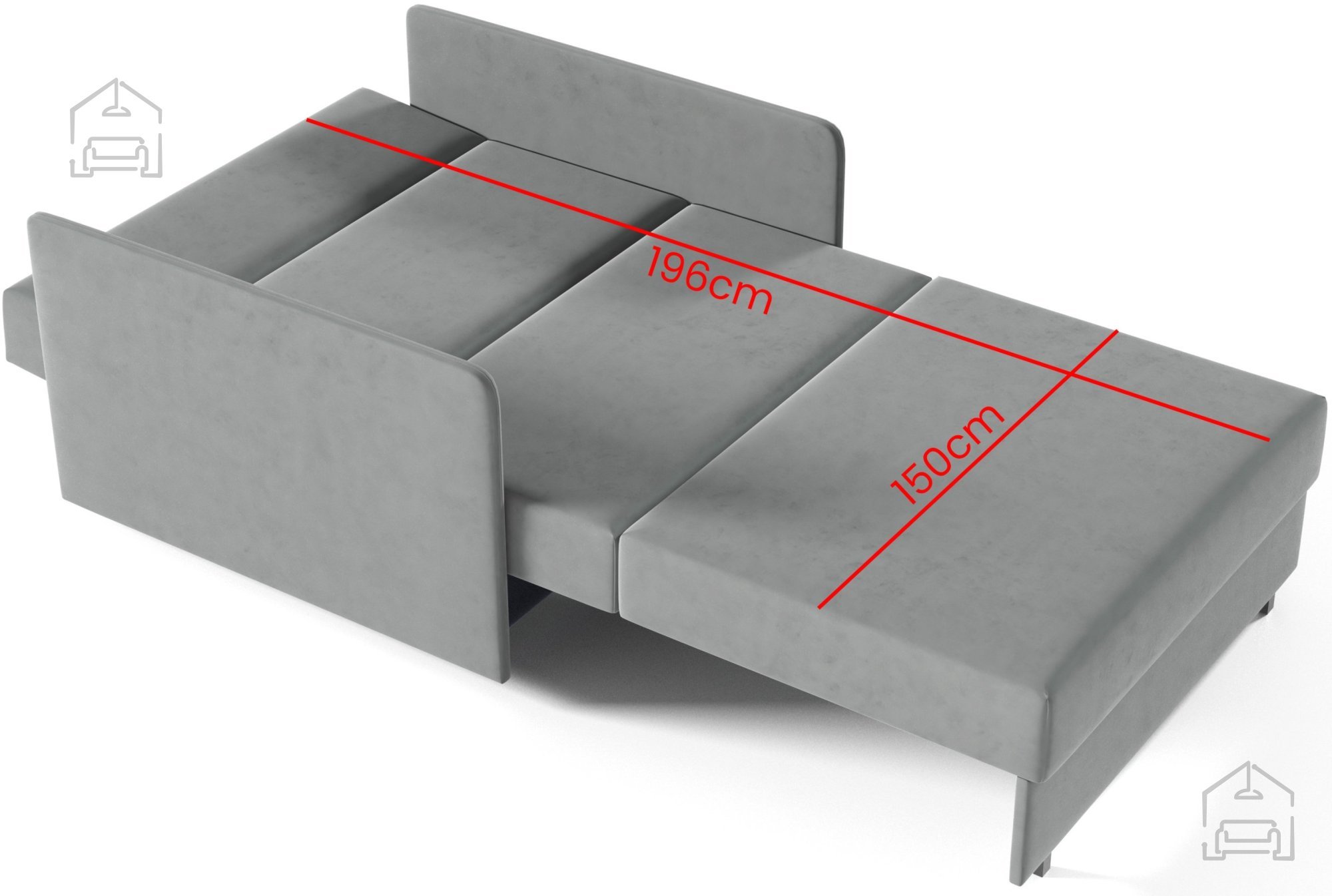 Celotne mere dvoseda znašajo 160x97x85 cm, kar pomeni, da nudi dovolj prostora za sedenje dveh oseb, ne da bi pri tem zavzel preveč prostora v prostoru. Po raztegu se ustvari ležalna površina 150x196 cm, ki omogoča udoben spanec za eno ali dve osebi. Takšne dimenzije so idealne za manjše stanovanje, garsonjero ali otroško sobo, kjer je pomembna večnamenskost.