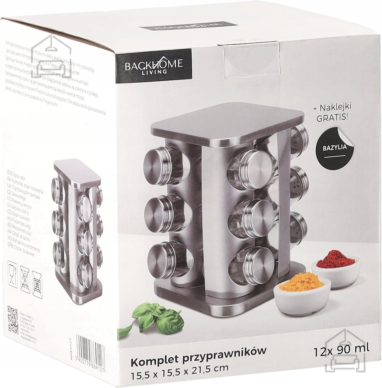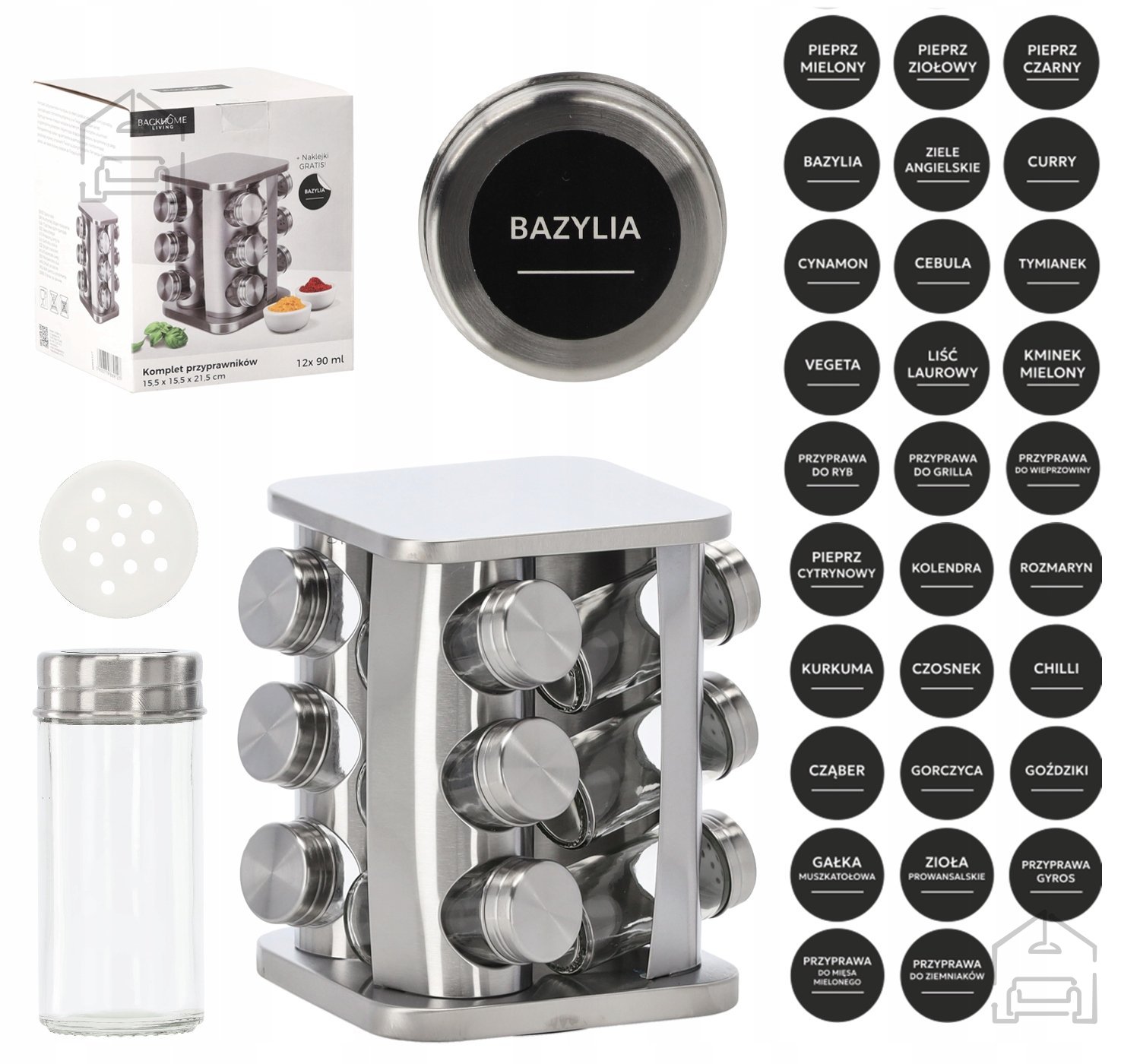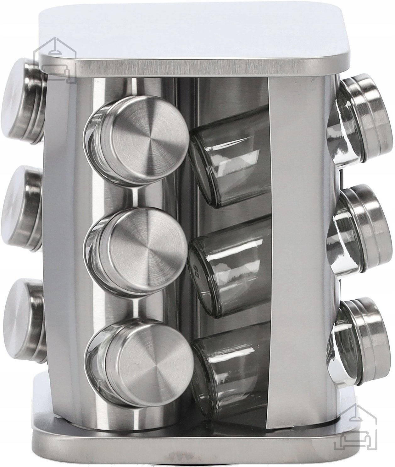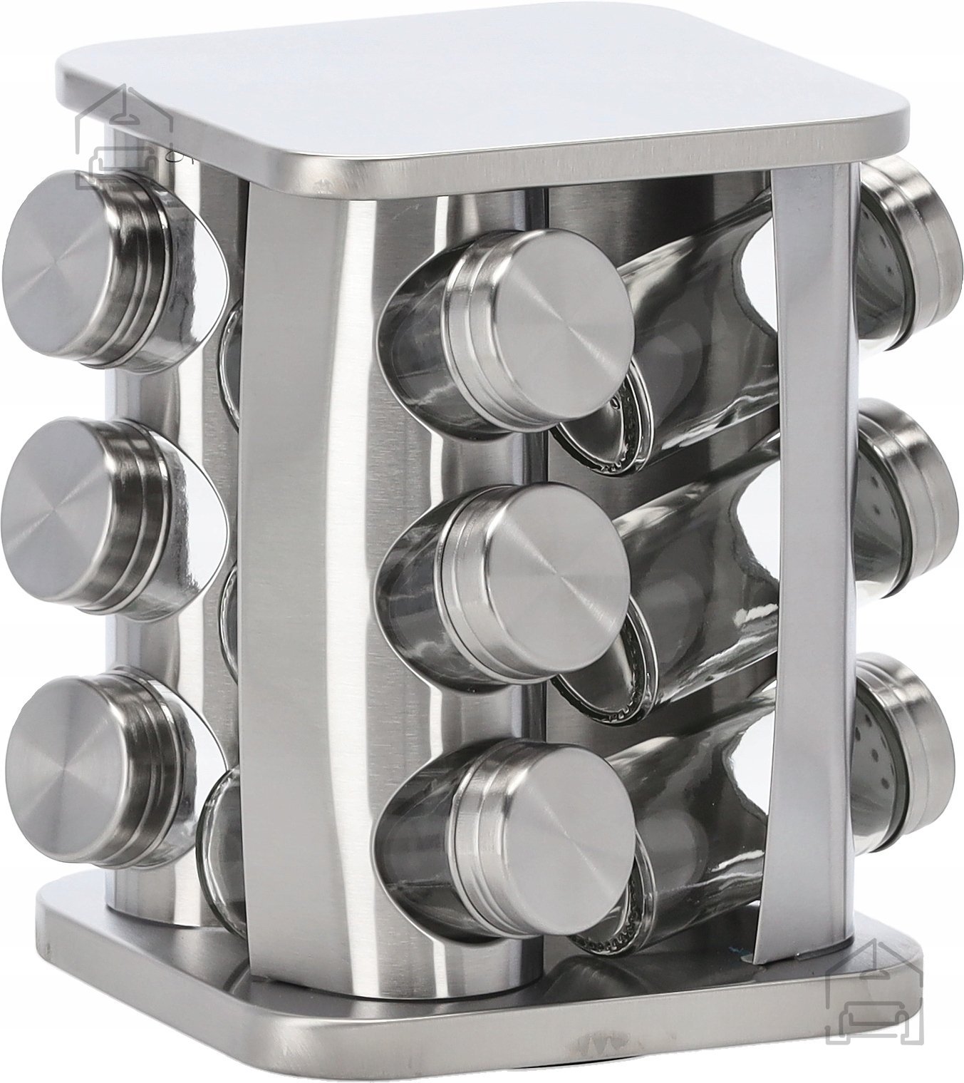Pripravnik kvadratni vrtljiv z merami 15,5 x 15,5 cm in višino 21,5 cm, zasnovan za udobno shranjevanje začimb in enostaven dostop do njih.
