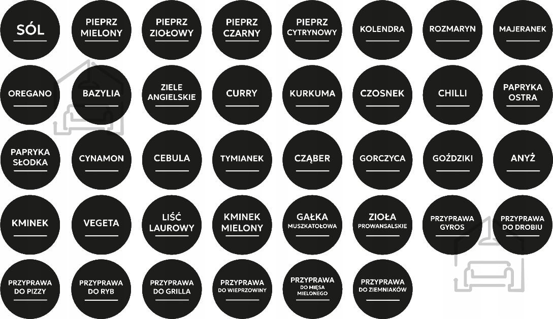 Set vsebuje 38 nalepk z imeni začimb, ki jih je mogoče poljubno namestiti na kozarčke, kar omogoča popolno personalizacijo seta: