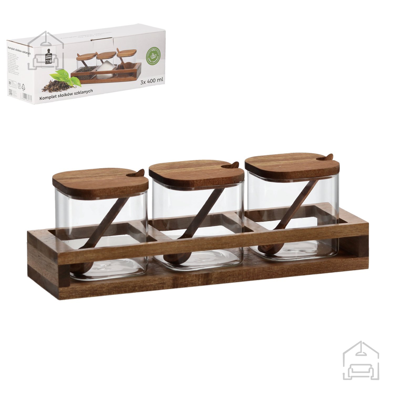 Komplet vključuje tri steklene kozarce, tri praktične žličke in robustno leseno stojalo, ki omogoča stabilno postavitev in enostaven dostop do vsebine. Kozarci so idealni za shranjevanje medu, marmelad, začimb, sladkorja, čaja ali drugih drobnih živil. Zaradi enakomerne prostornine 400 ml lahko vse tri posode uporabite za različne sestavine, pri tem pa ohranite urejen in usklajen videz na kuhinjskem pultu ali jedilni mizi. Leseno stojalo omogoča, da komplet vedno ostane zbran in urejen, hkrati pa olajša prenašanje.