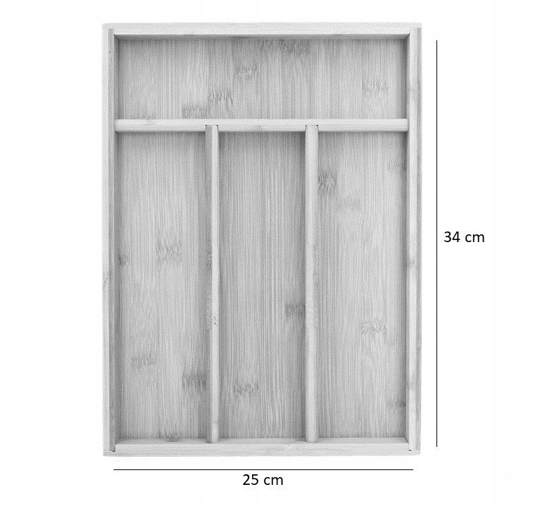 Dimenzije 34 cm (dolžina) × 25 cm (širina) × 4,5 cm (višina) omogočajo, da se vložek prilega večini standardnih kuhinjskih predalov. Zaradi svoje velikosti je primeren za manjše in srednje velike predale, hkrati pa omogoča optimalno razporeditev prostora. Ker ni raztegljiv, ohranja stabilnost in se ne premika po predalu, kar je pomembno pri vsakodnevni uporabi.