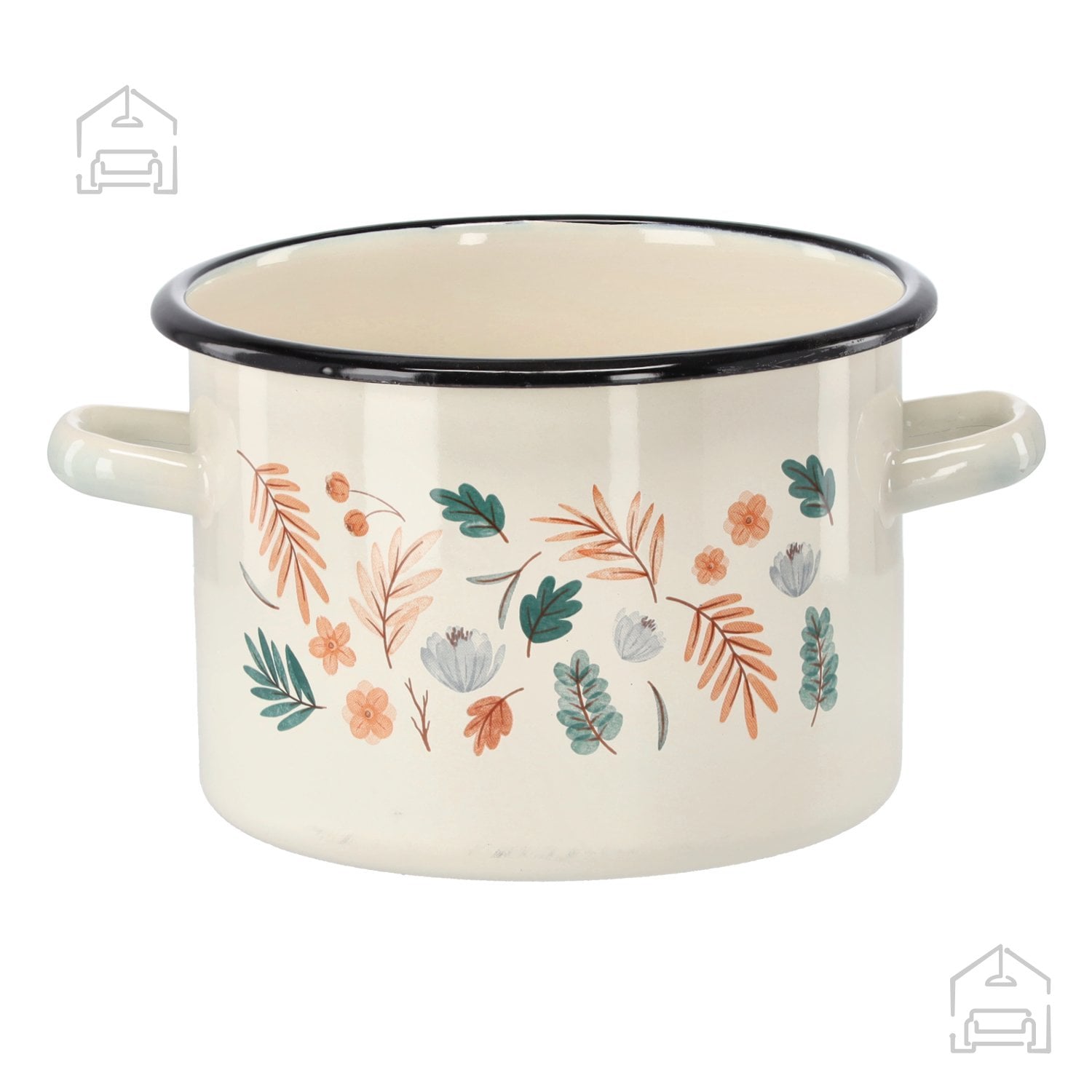 Kremna barva lonca s subtilnim motivom listja deluje elegantno in hkrati naravno. Takšen dizajn ni le dekorativen, temveč prinaša občutek topline, zato se lonec lepo poda na mizo tudi kot servirna posoda. Zaradi nevtralne barve se enostavno kombinira z drugimi emajliranimi ali keramičnimi kosi. Vzorci listja so naneseni natančno in obstojno, kar preprečuje bledenje pri redni uporabi ali pranju.