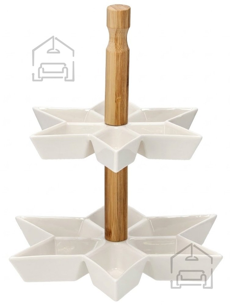 Dvonadstropni pladenj za prigrizke v obliki zvezde – MUT6682 znamke Chomik je popolna izbira za vse, ki cenijo kombinacijo estetike in uporabnosti. Njegov keramični okvir, brezčasna bela barva in simbolična oblika zvezde ustvarjajo izdelek, ki bo popestril vsak pogrinjek. Ne glede na to, ali ga uporabite kot osrednji dekorativni element ali kot praktično stojalo za prigrizke, bo ta pladenj vedno poskrbel za prijetno in urejeno postrežbo. S svojo kakovostno izdelavo in elegantnim videzom predstavlja odlično darilo ali dodatek vsaki kuhinji.