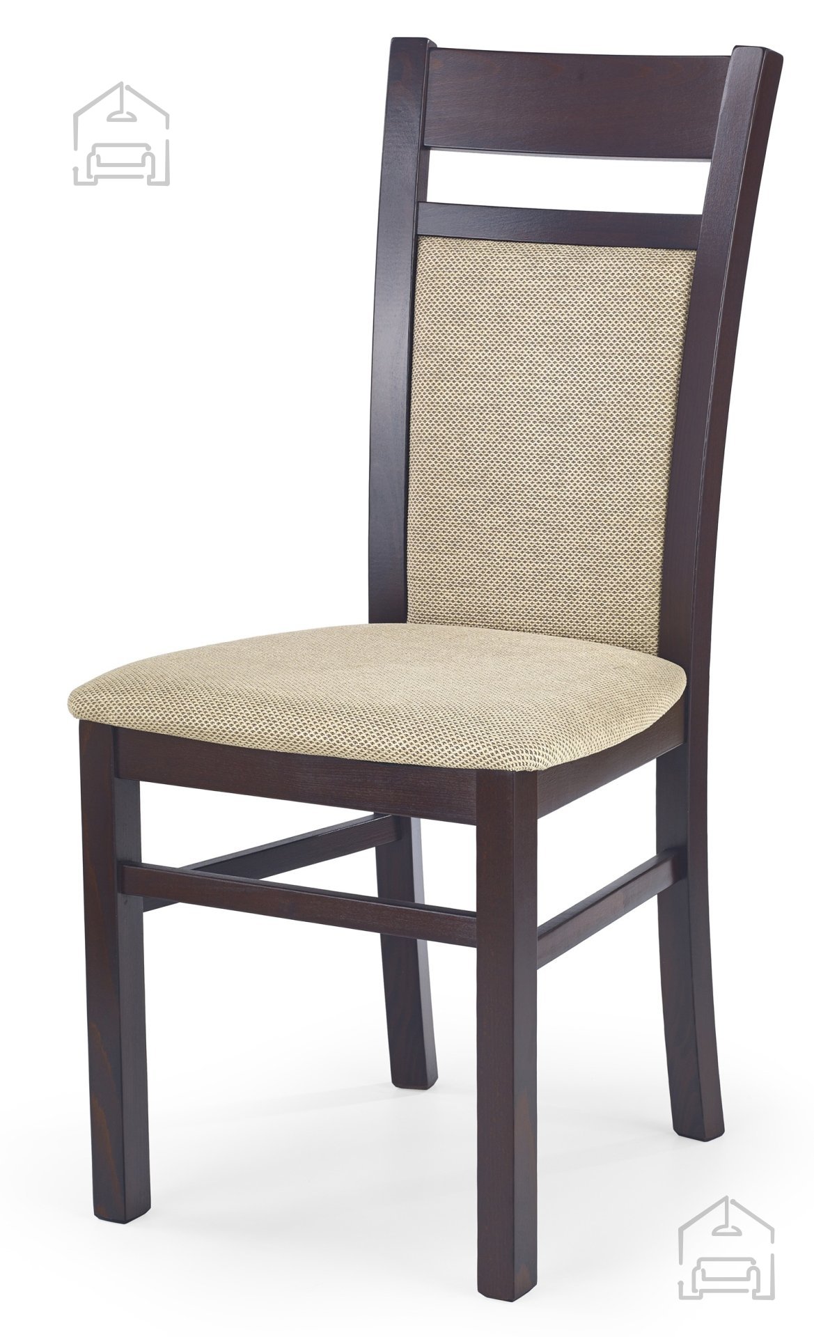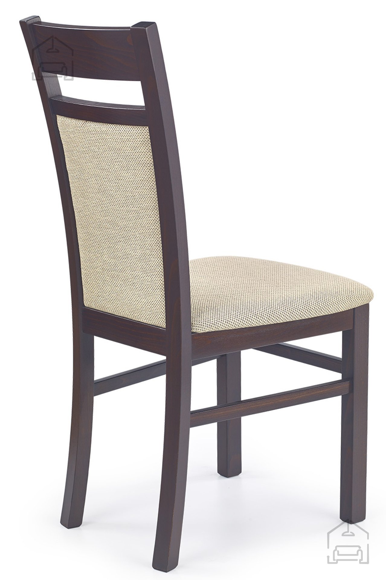 Jedilniški stol Gerard2 – Halmar je klasičen primer kakovostne izdelave, ki združuje naravne materiale in brezčasno obliko. Izdelan je iz masivnega bukovega lesa in oblazinjen v tkanino v odtenku Torent beige, zato se lepo poda k številnim slogom jedilnic. Kombinacija temnega oreha in mehke bež tkanine ustvarja občutek topline in domačnosti, hkrati pa ohranja eleganten videz.