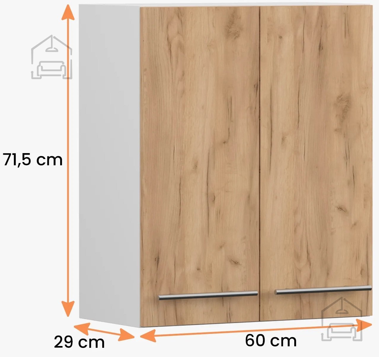 Omara meri 60x29x71,5 cm, kar pomeni, da je dovolj kompaktna za manjše prostore, a hkrati ponuja uporabno notranjost. Višina omogoča montažo nad delovno površino ali nad drugo omarico, kar povečuje izkoristek prostora v višino. Zaradi svoje globine 29 cm je primerna tudi za ozke hodnike ali manjše kuhinje, kjer je vsak centimeter dragocen. V notranjosti lahko uredite police po svojih potrebah, saj konstrukcija omogoča stabilno namestitev različnih predmetov – od kuhinjskih dodatkov do knjig ali dekorativnih elementov.