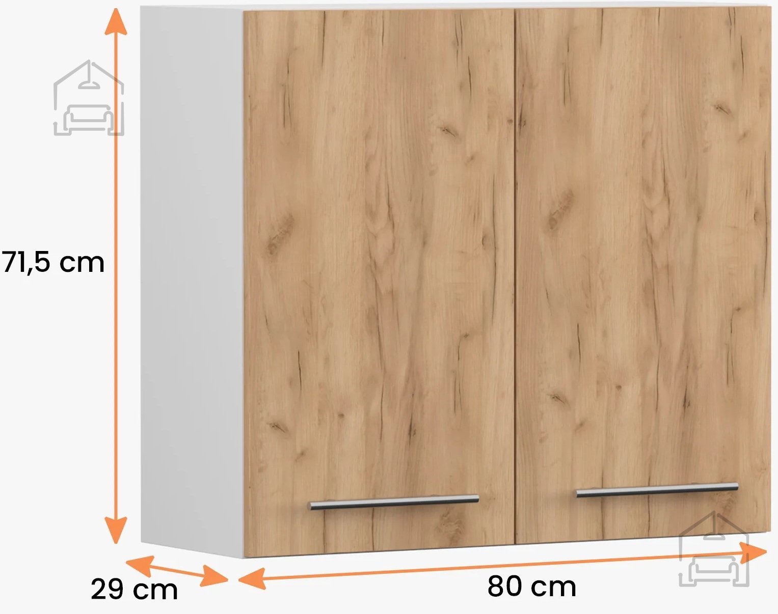 Omara meri 80x29x71,5 cm, kar pomeni, da je dovolj kompaktna za manjše prostore, a hkrati ponuja uporabno notranjost. Višina omogoča montažo nad delovno površino ali nad drugo omarico, kar povečuje izkoristek prostora v višino. Zaradi svoje globine 29 cm je primerna tudi za ozke hodnike ali manjše kuhinje, kjer je vsak centimeter dragocen. V notranjosti lahko uredite police po svojih potrebah, saj konstrukcija omogoča stabilno namestitev različnih predmetov – od kuhinjskih dodatkov do knjig ali dekorativnih elementov.