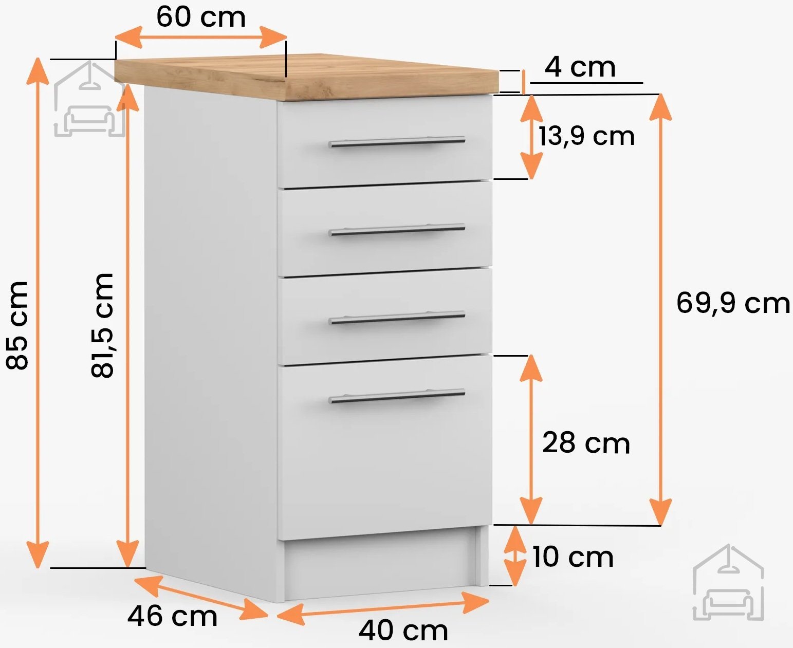 Dimenzije omare znašajo 40x46x85 cm, kar omogoča optimalno razmerje med prostornostjo in kompaktnostjo. Višina 85 cm se ujema s standardno višino kuhinjskih pultov, zato se omara brez težav vključi v obstoječi kuhinjski niz. Globina 46 cm omogoča dovolj prostora za shranjevanje posode, pripomočkov ali živil, ne da bi omara zavzela preveč prostora v prostoru. Zaradi enostavne oblike se lahko kombinira z drugimi elementi kolekcije Inez, s čimer lahko ustvarite popolnoma prilagojen kuhinjski sestav po lastnih željah.