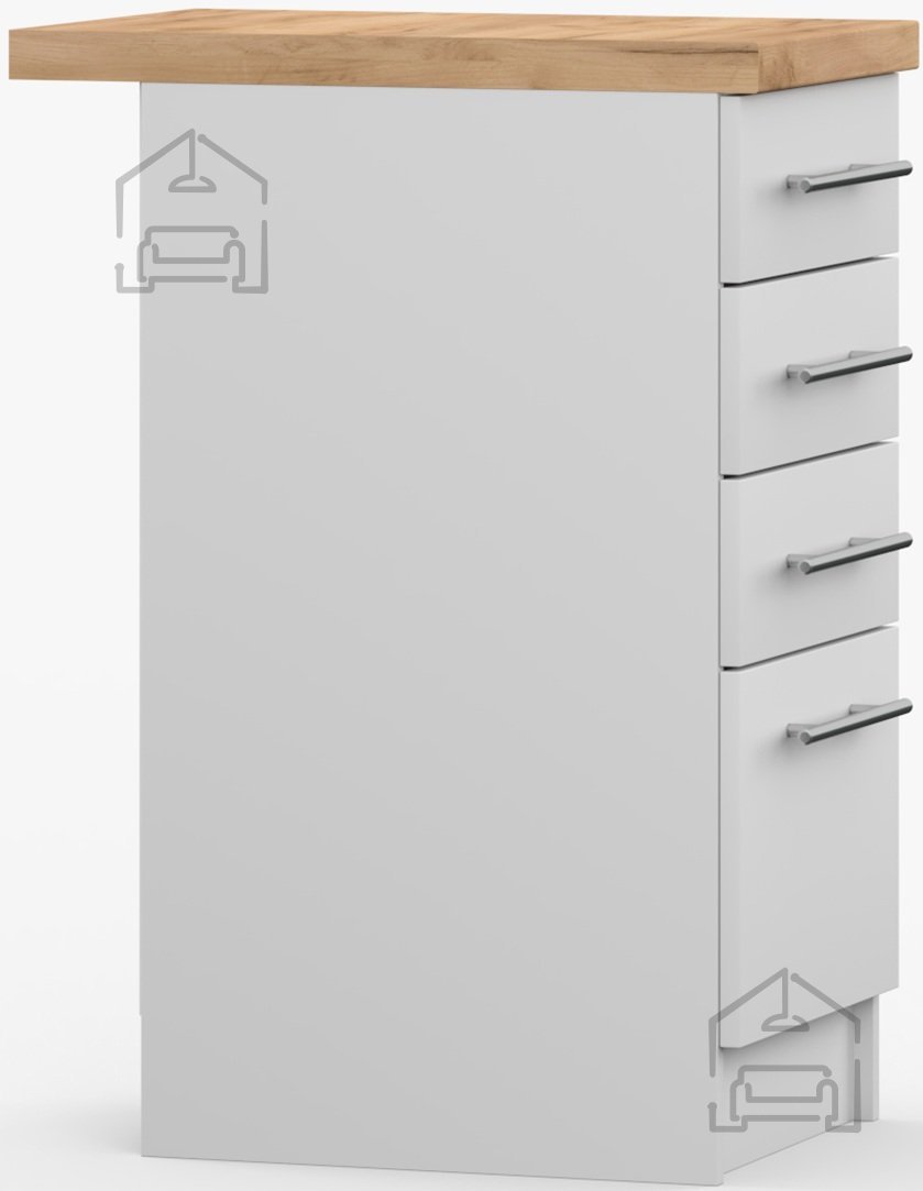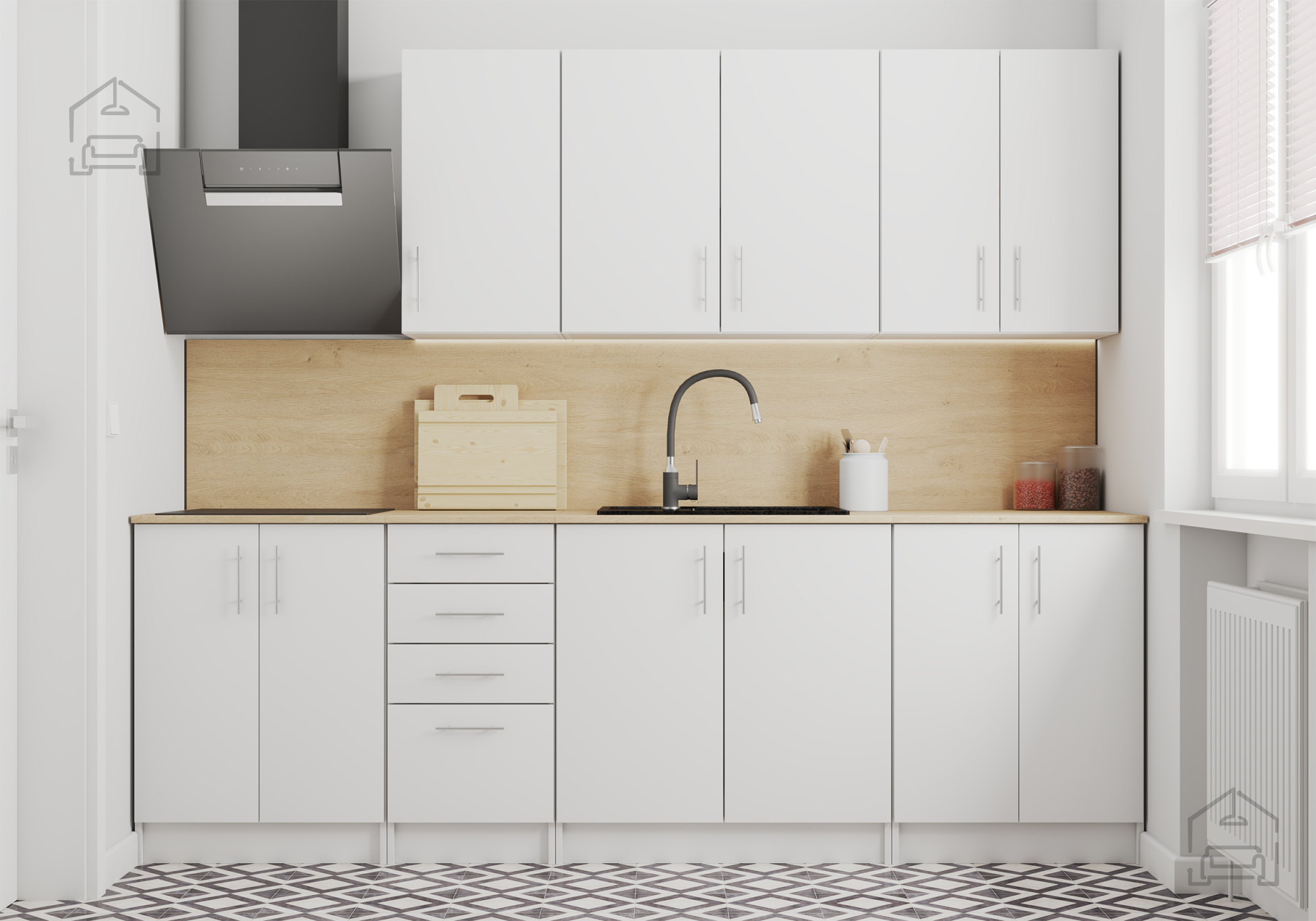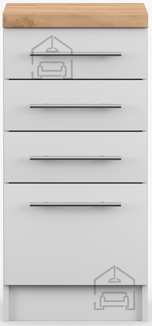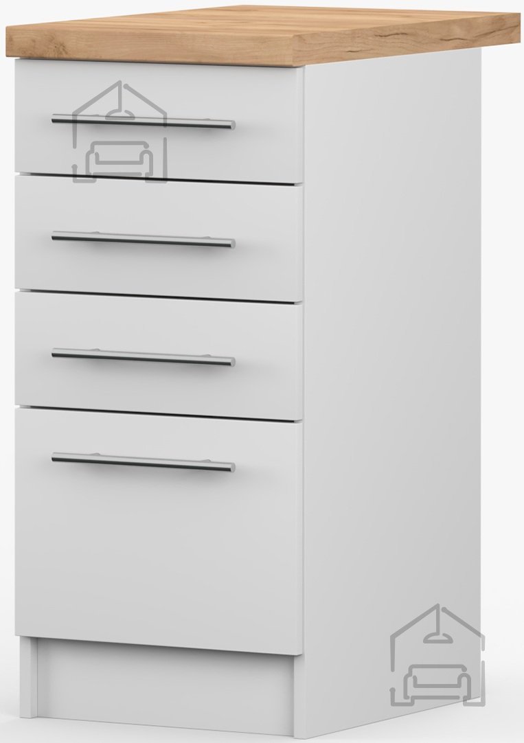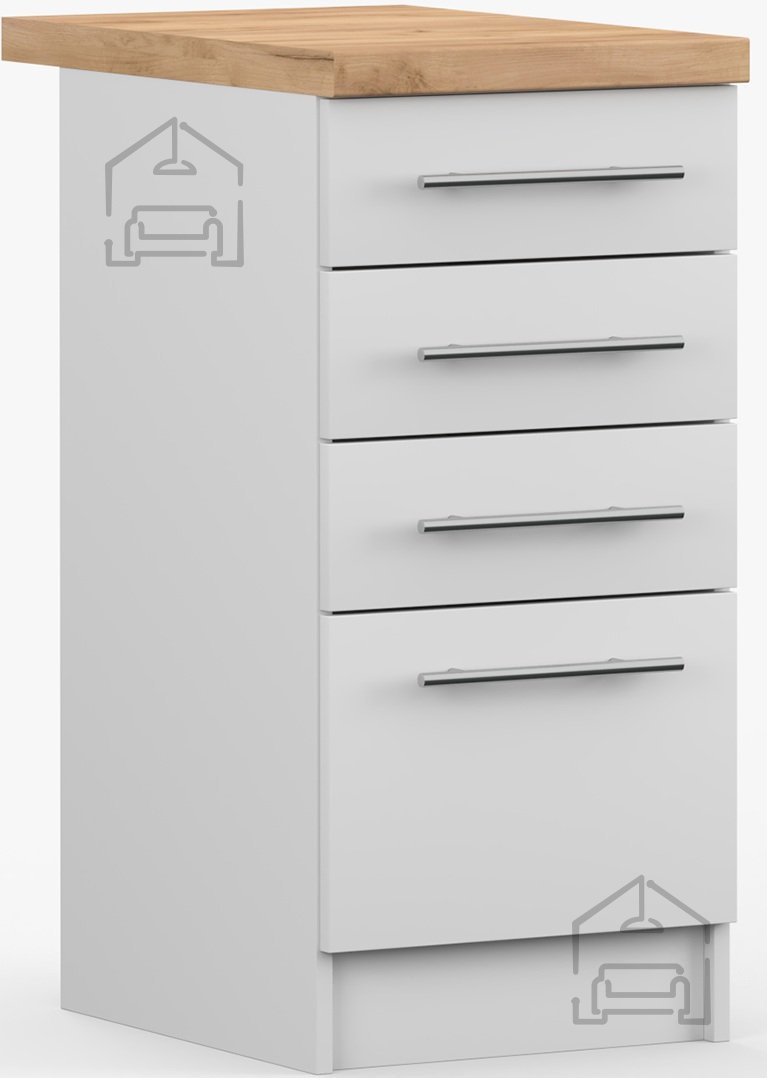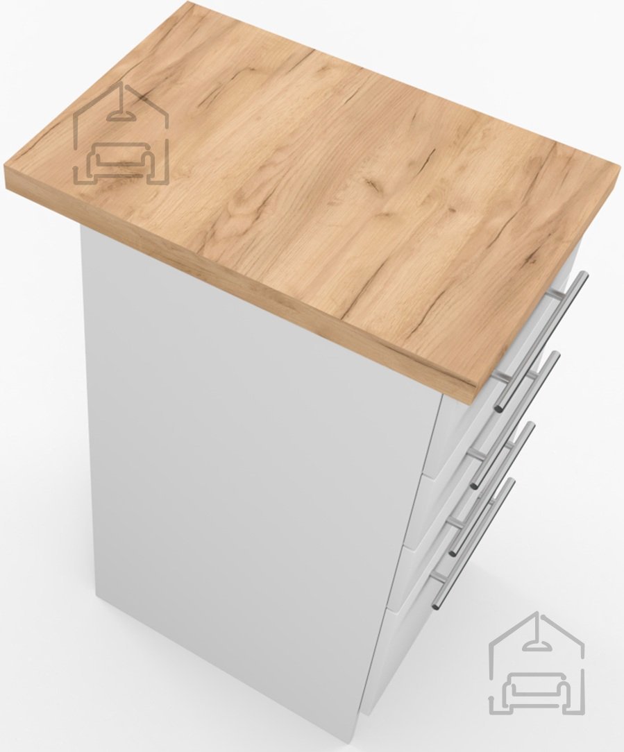 Bela barva korpusa daje občutek čistosti in prostornosti, medtem ko kuhinjski pult v barvi craft zlati vnese toplino in pridih naravnega lesa. Takšna kombinacija barv omogoča, da se omara ujema tako z modernimi minimalističnimi kuhinjami kot tudi s klasično oblikovanimi prostori. Barvni kontrast ni premočan, zato omara deluje elegantno in uravnoteženo. Če želite ustvariti svetel in prijeten ambient, je ta model odlična izbira.