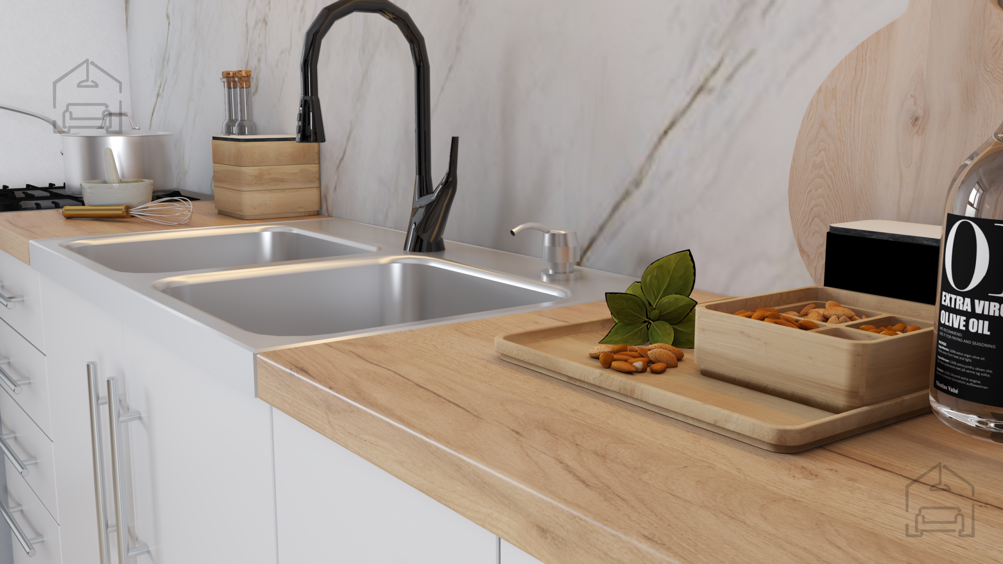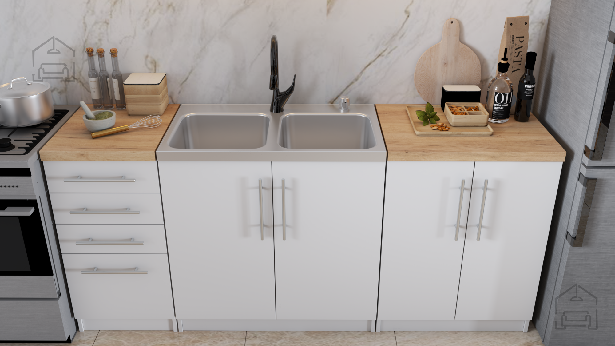 Kombinacija praktičnih materialov in premišljene zasnove omogoča, da je kuhinjski sestav Inez IV primeren za različne tipe gospodinjstev. Zaradi bele barve se vizualno poveča svetlost prostora, kar je še posebej dobrodošlo v manjših stanovanjih ali kuhinjah z manj naravne svetlobe. Pult v dekorju kamnitega hrasta pa nudi dovolj delovne površine za pripravo hrane, postavljanje manjših gospodinjskih aparatov ali dekorativnih dodatkov.