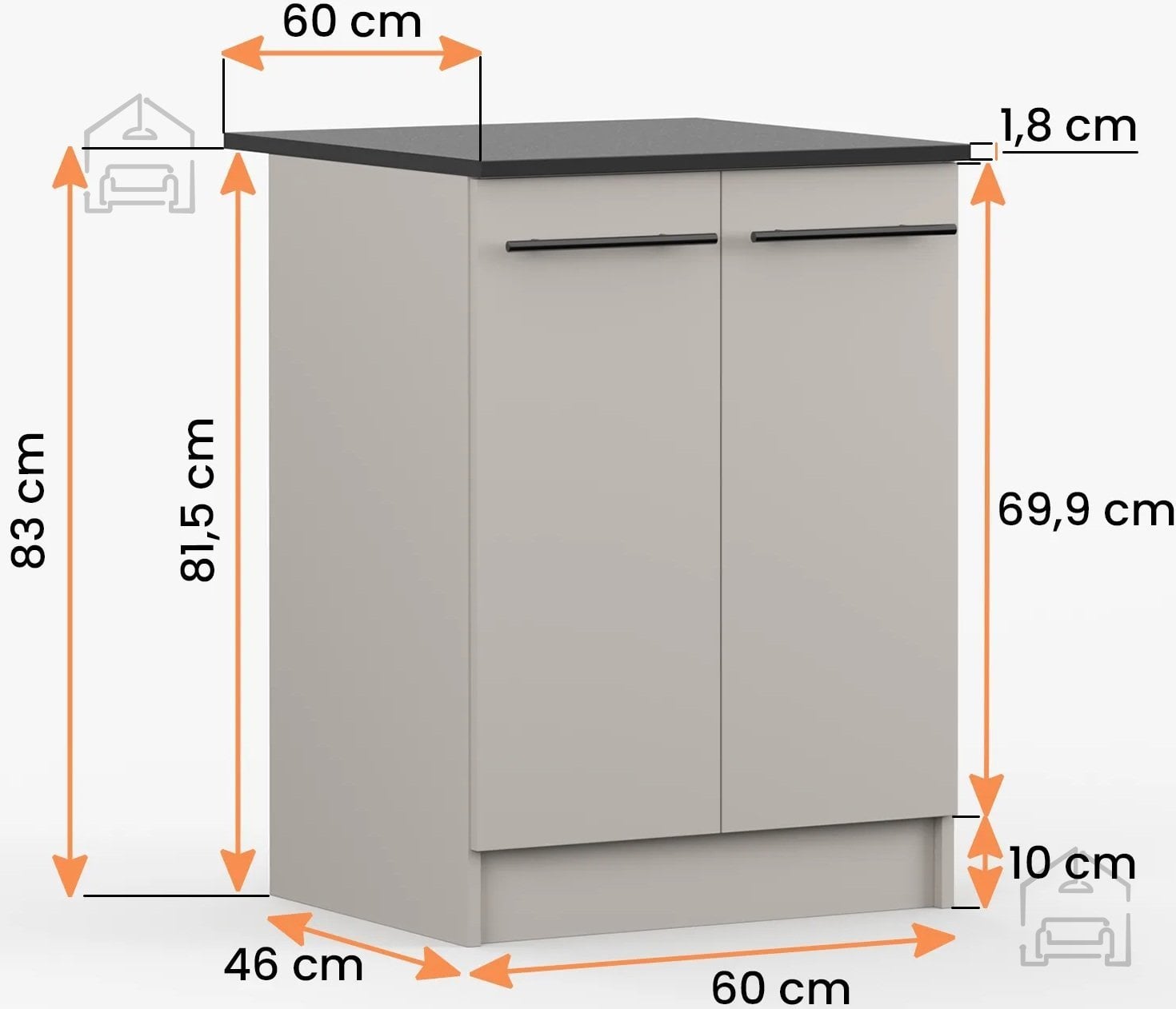 Dimenzije 60x46x85 cm omogočajo, da se omara Inez V popolnoma prilega manjšim ali večjim kuhinjam. Kljub kompaktni širini ponuja dovolj prostora za shranjevanje osnovnih kuhinjskih pripomočkov, posode ali živil. V notranjosti je prostor razporejen premišljeno, tako da lahko vsak centimeter uporabite kar najbolj učinkovito. Zaradi svoje višine se lepo poravna z drugimi spodnjimi elementi kuhinje in omogoča enotno delovno površino.