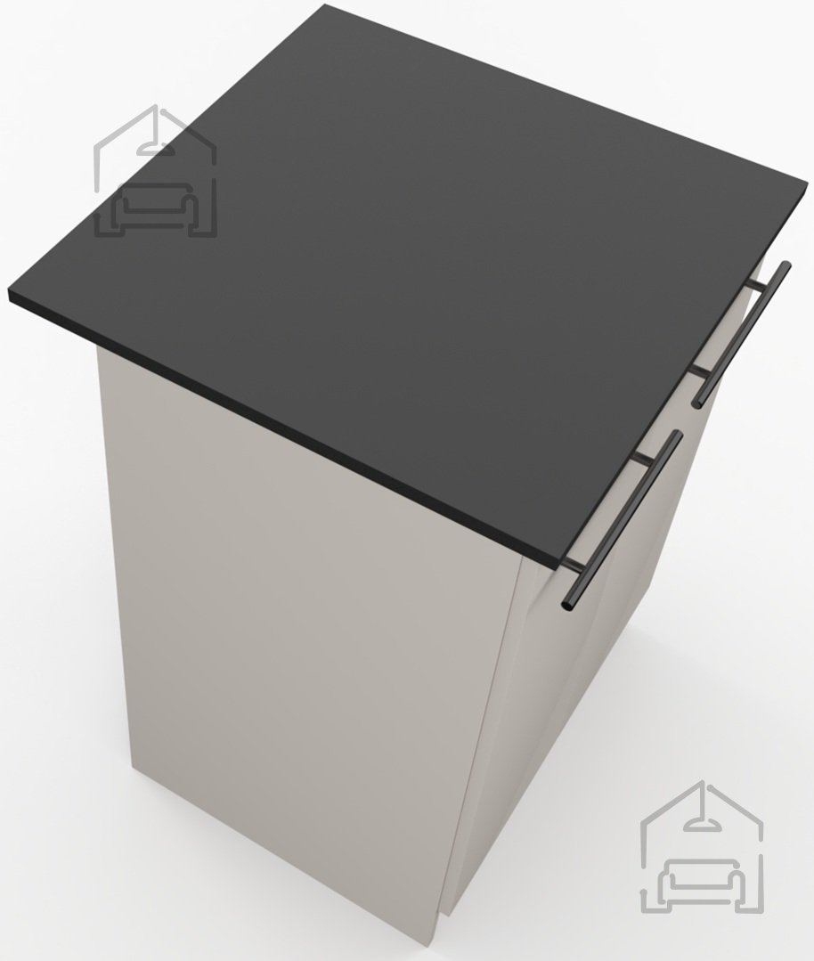 Omara je izdelana iz kakovostne laminirane plošče, znane po odpornosti proti praskam, vlagi in toploti. Laminirana površina omogoča enostavno čiščenje – dovolj je, da jo obrišete z vlažno krpo. Okvir iz iverala prispeva k stabilnosti konstrukcije, zato je omara trdna in primerna za vsakodnevno uporabo. Črna površina kuhinjskega pulta doda kontrast in modernost, hkrati pa je praktična pri vsakodnevnem delu, saj so manj vidne sledi uporabe.
