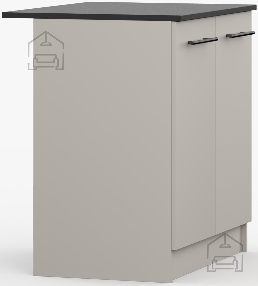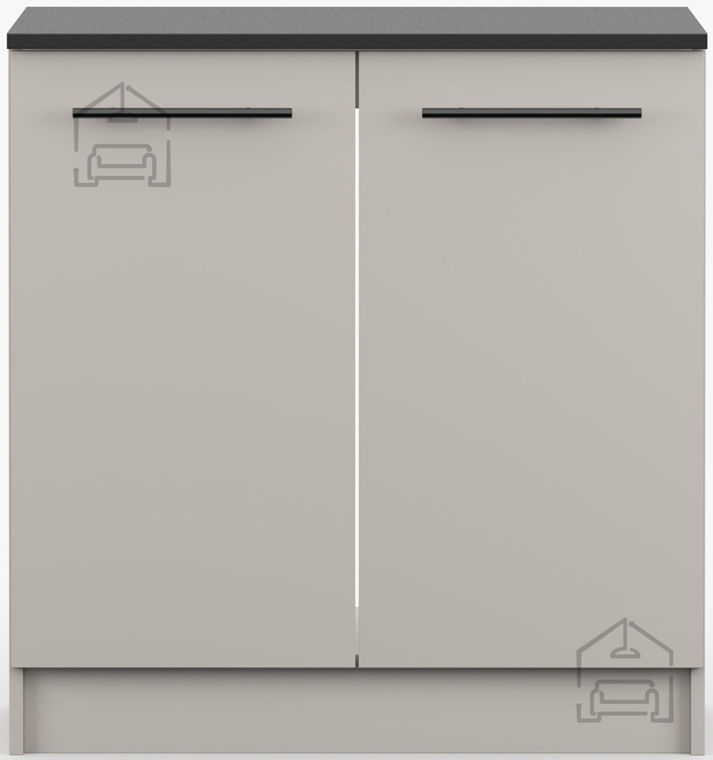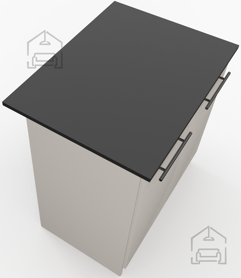 Omara je izdelana iz kakovostne laminirane plošče, znane po odpornosti proti praskam, vlagi in toploti. Laminirana površina omogoča enostavno čiščenje – dovolj je, da jo obrišete z vlažno krpo. Okvir iz iverala prispeva k stabilnosti konstrukcije, zato je omara trdna in primerna za vsakodnevno uporabo. Črna površina kuhinjskega pulta doda kontrast in modernost, hkrati pa je praktična pri vsakodnevnem delu, saj so manj vidne sledi uporabe.