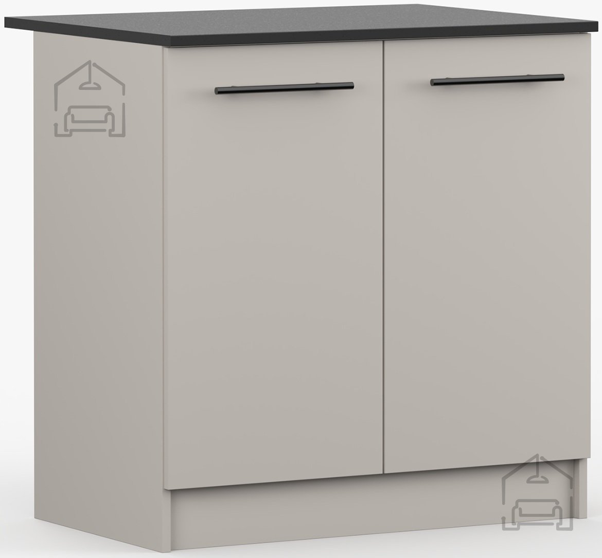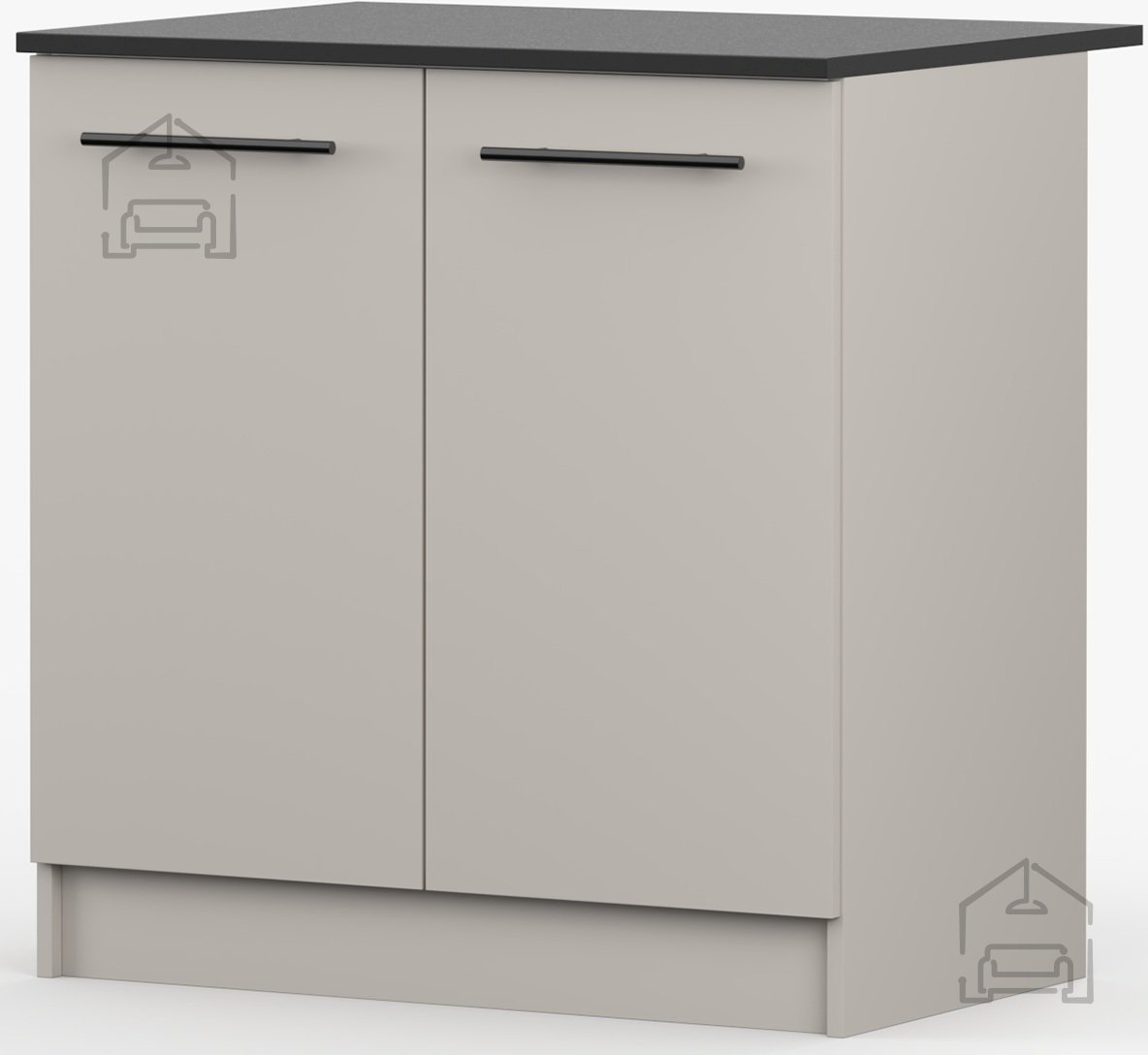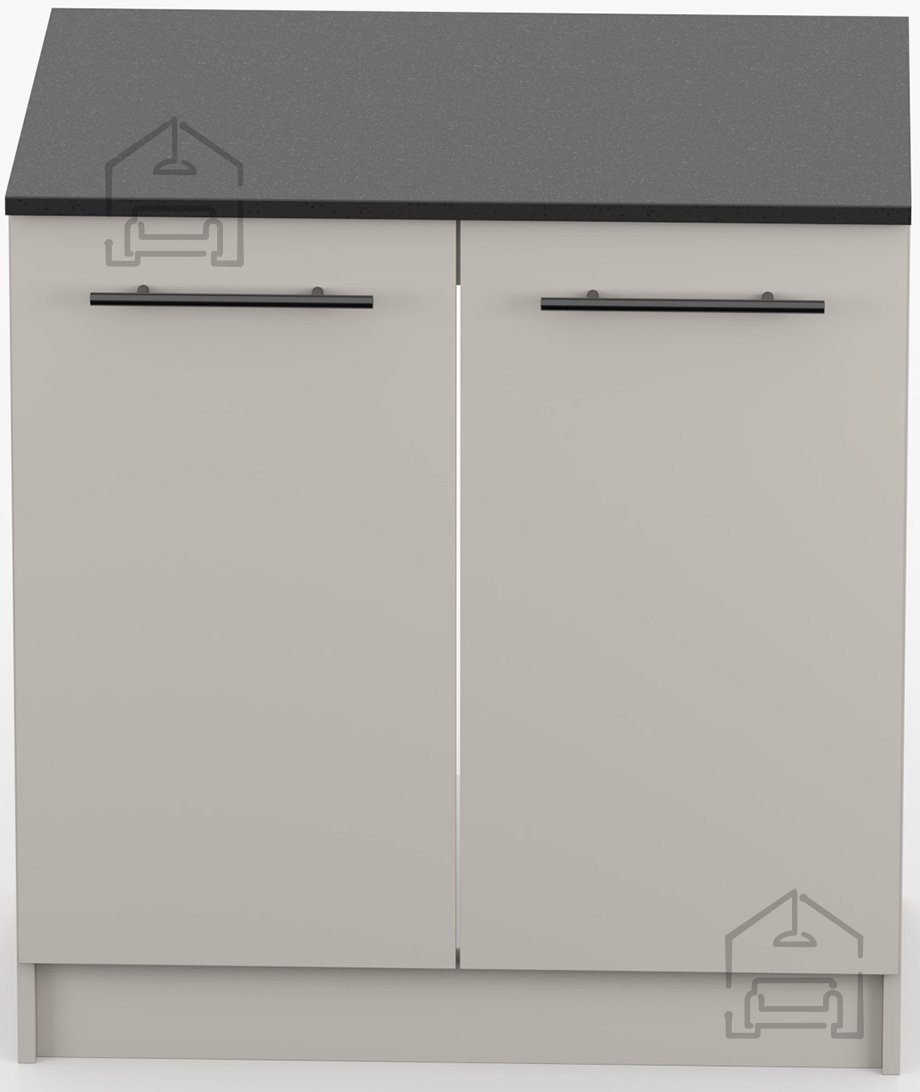 Omara je izdelana iz kakovostne laminirane plošče, znane po odpornosti proti praskam, vlagi in toploti. Laminirana površina omogoča enostavno čiščenje – dovolj je, da jo obrišete z vlažno krpo. Okvir iz iverala prispeva k stabilnosti konstrukcije, zato je omara trdna in primerna za vsakodnevno uporabo. Črna površina kuhinjskega pulta doda kontrast in modernost, hkrati pa je praktična pri vsakodnevnem delu, saj so manj vidne sledi uporabe.